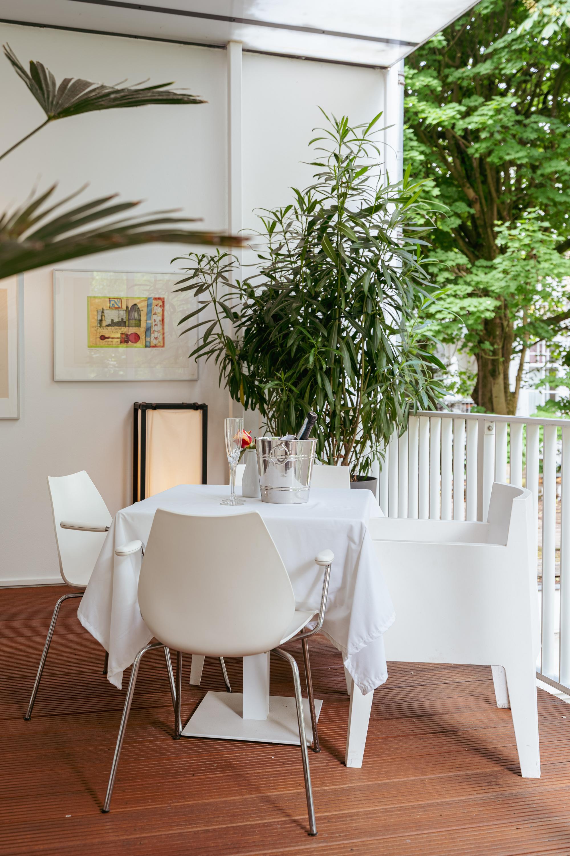 Double French doors provide access to the very deep balcony of approximately 17 m², fitted with a terrace canopy and a practical tall balcony storage cabinet.