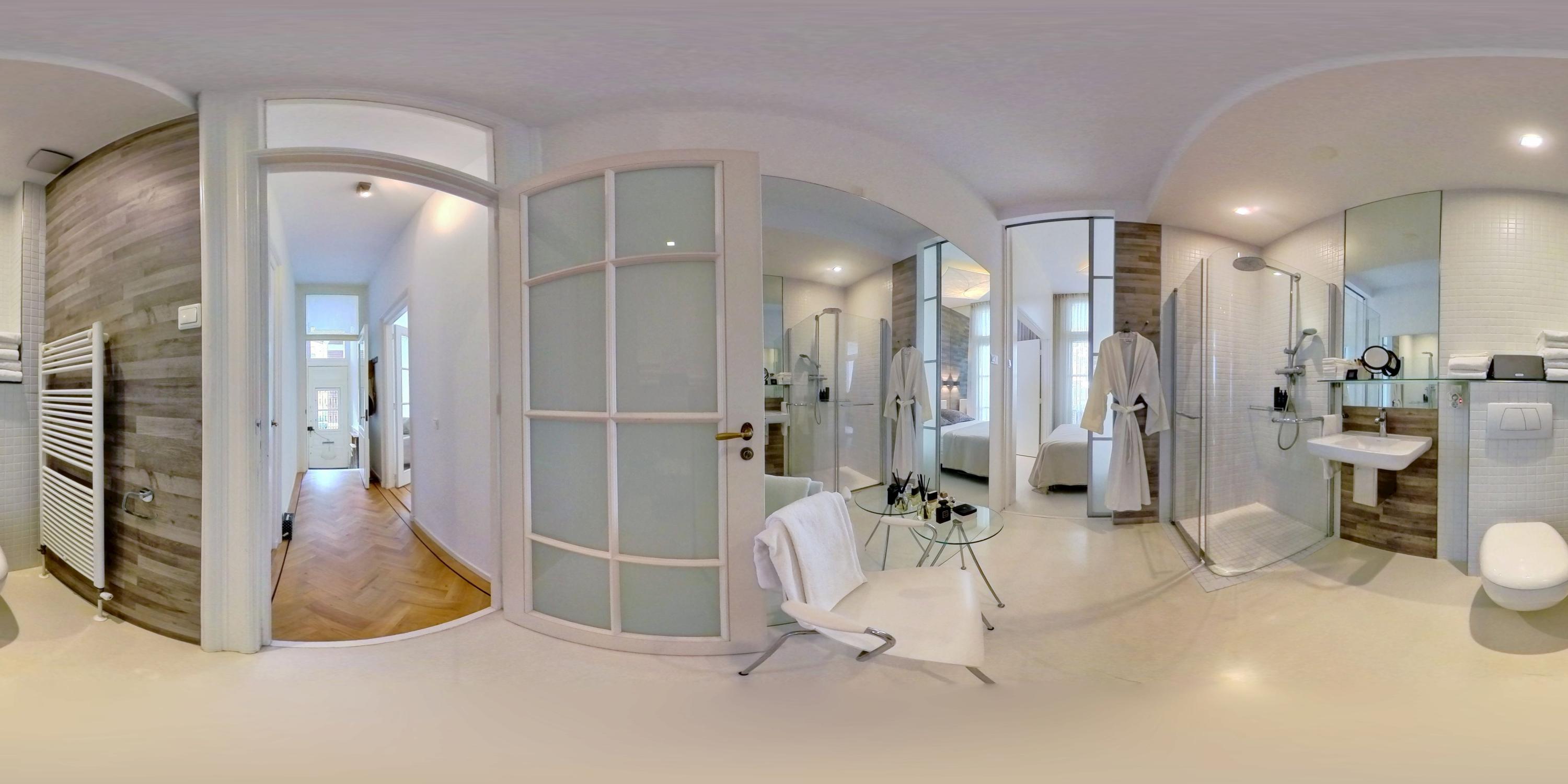 Adjacent to the bedroom is the en-suite bathroom, accessible via a sliding partition and equipped with a walk-in shower, washbasin, toilet and designer radiator.