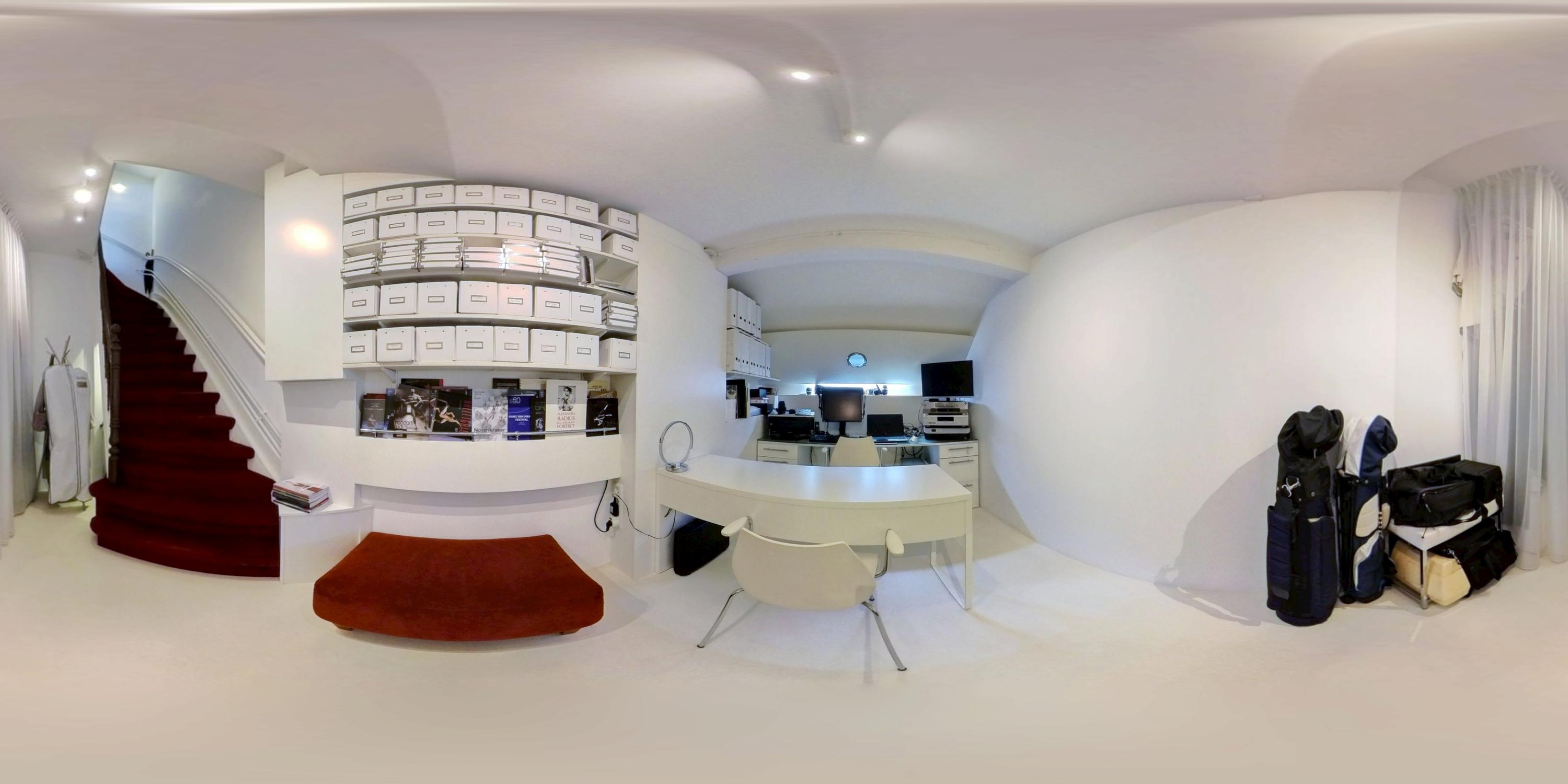 A red-carpeted staircase leads to the basement level with underfloor heating. This space of approximately 13 m² is perfectly suitable as a guest room, yoga or fitness area, with ample storage possibilities. The space is currently used as an office.