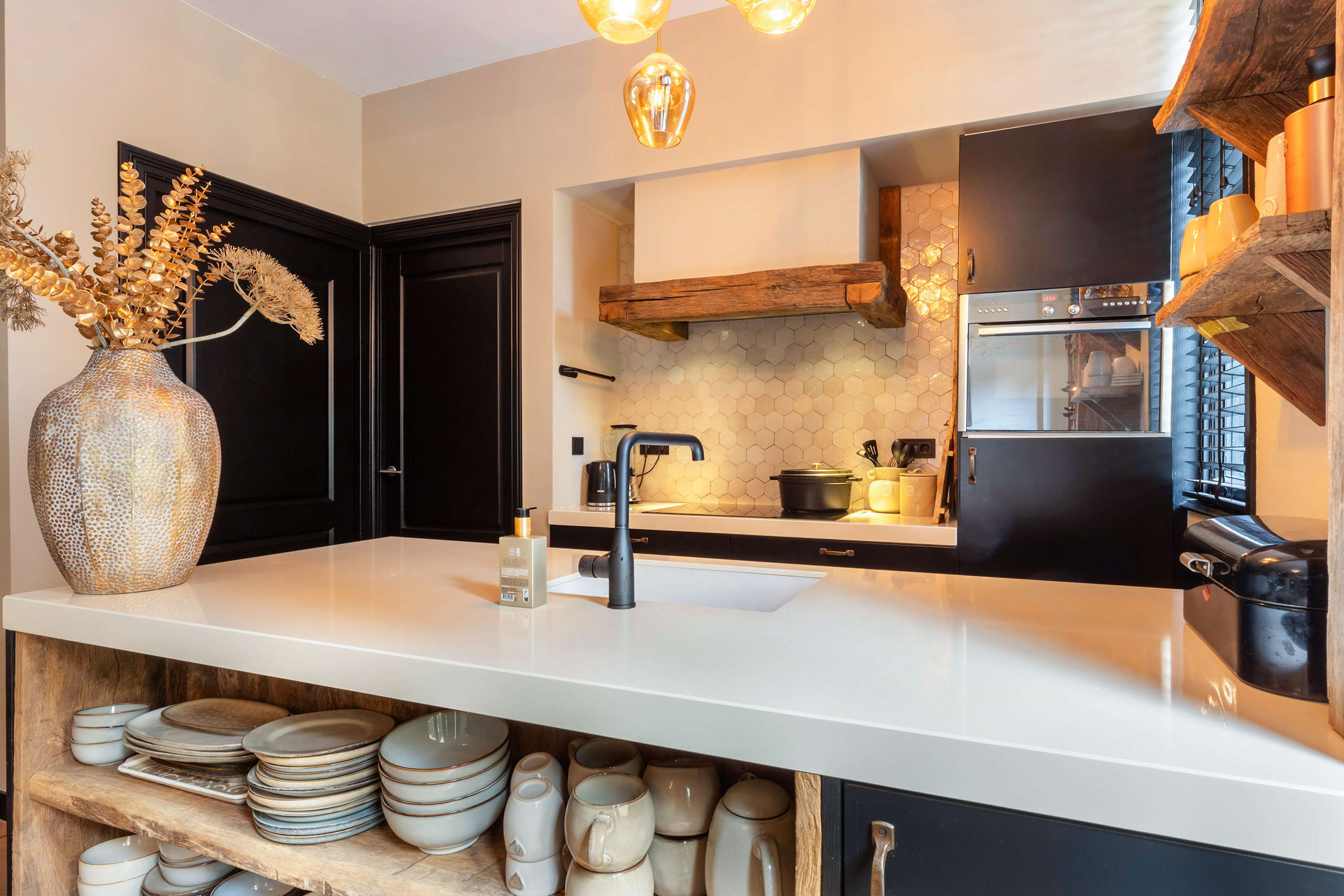 Via de originele voordeur met glas-in-lood komt u binnen in de hal met garderobe en moderne meterkast. Vanuit hier bereikt u de riante woonkeuken. Deze keuken is in 2024 vernieuwd en uitgevoerd in een stijlvolle opstelling met zwarte fronten, massief eiken accenten en hoogwaardige inbouwapparatuur, waaronder een vaatwasser, combi-oven, koelkast, inductiekookplaat en een afzuigschouw.
