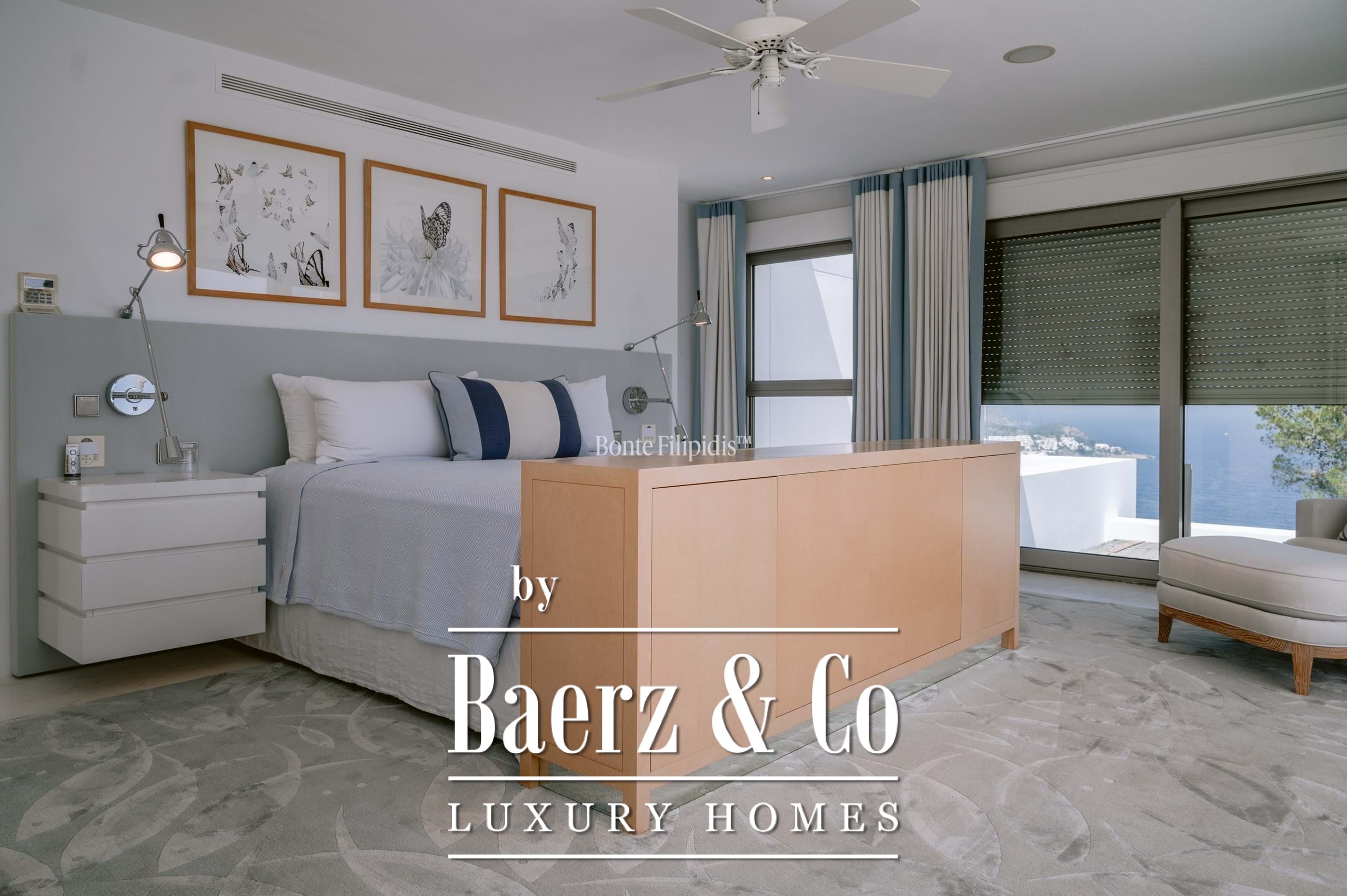 The villa spans generous interiors, featuring seven bedrooms and five bathrooms, along with a fully independent guest apartment. A serene courtyard with a koi pond sets a calming tone upon arrival, leading to light-filled living areas, a fully equipped kitchen, and several sea-facing terraces that create a fluid indoor-outdoor connection.
