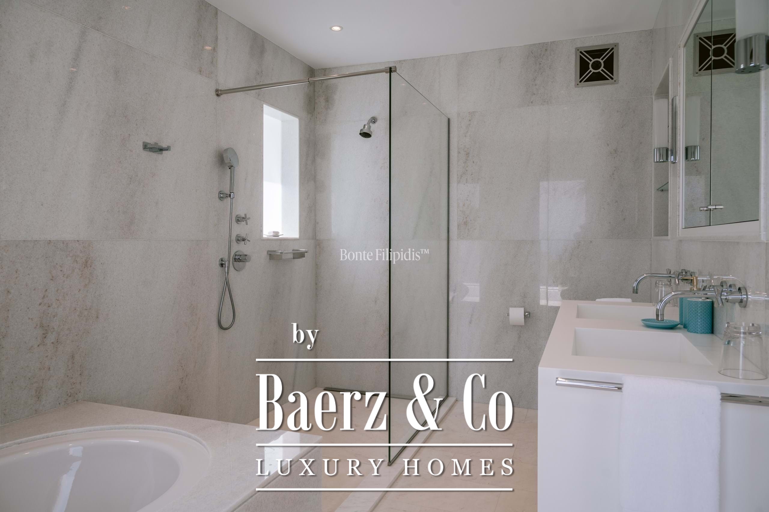 The exterior spaces invite leisure and entertaining, with a saltwater pool, sun terraces, and a fully equipped summer kitchen. Additional highlights include a home cinema, gym, underfloor heating, and a full security system.
