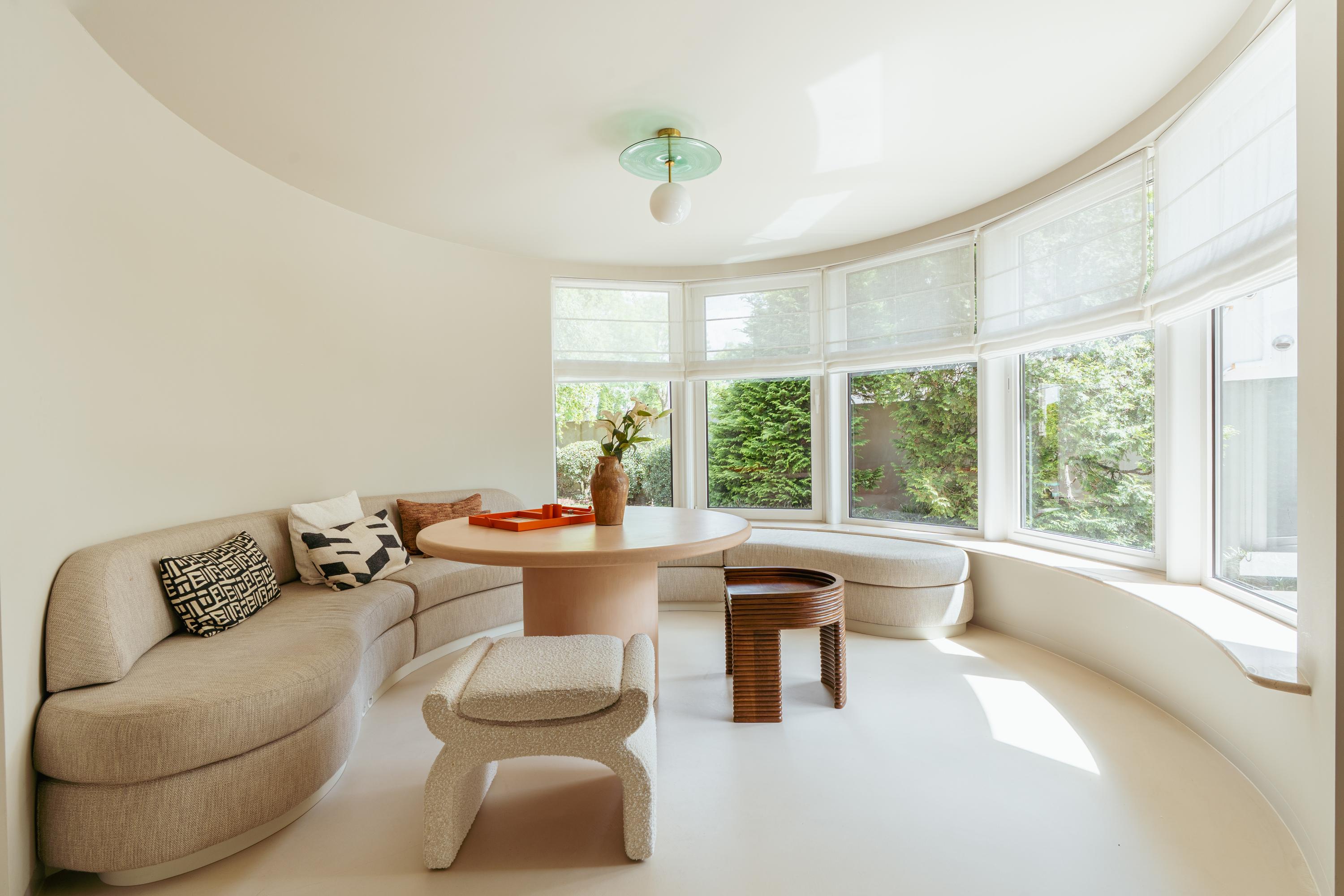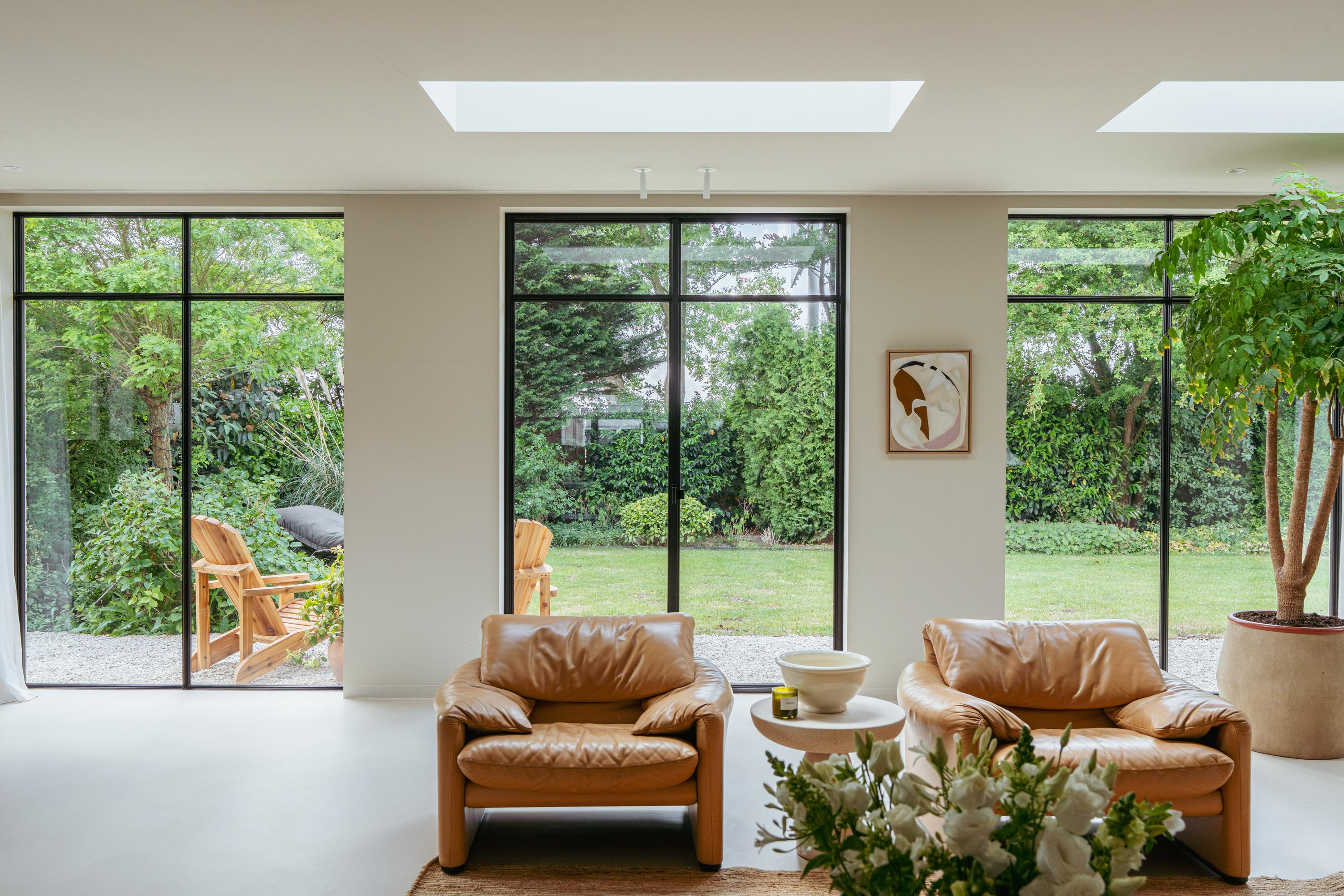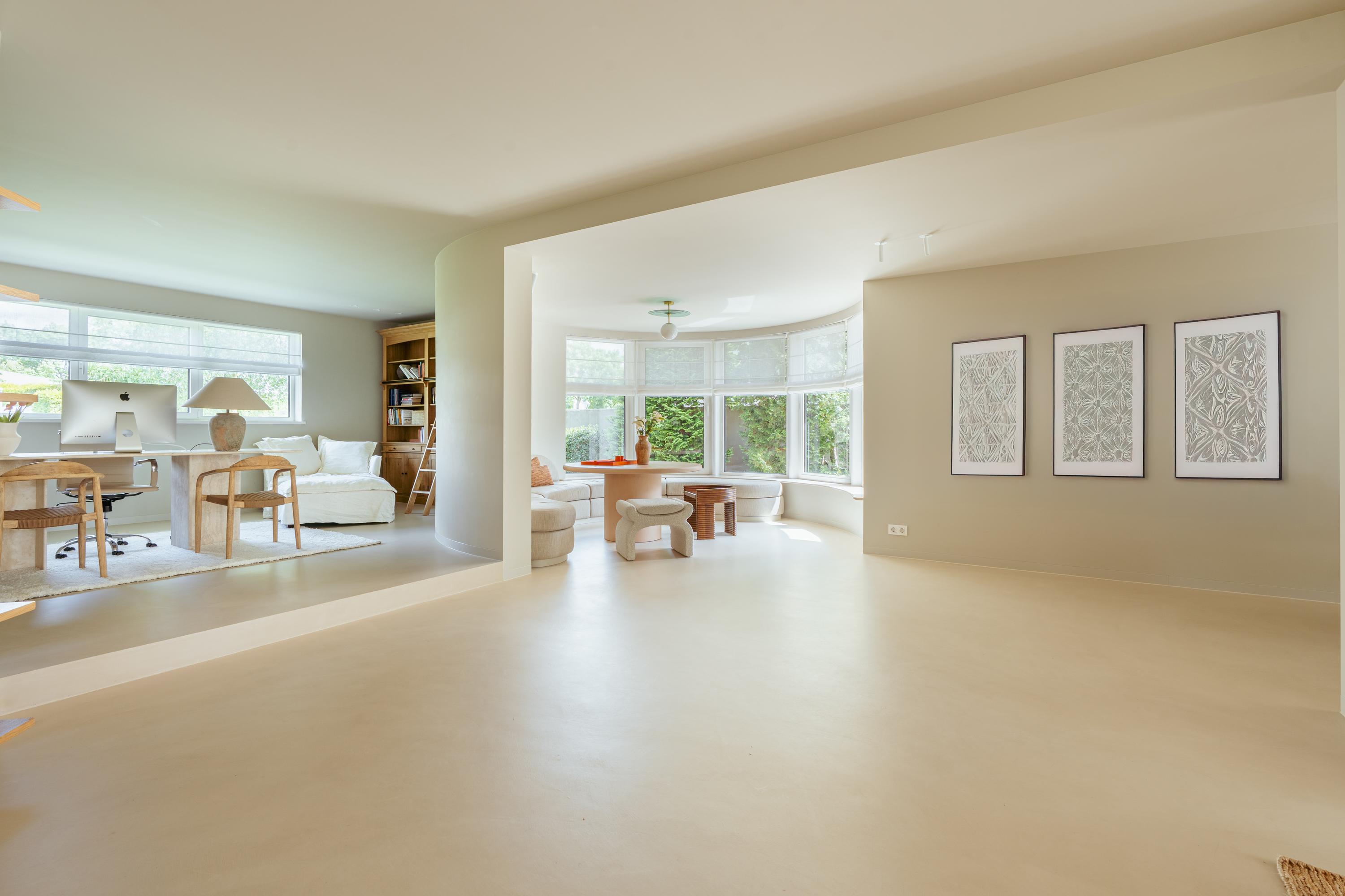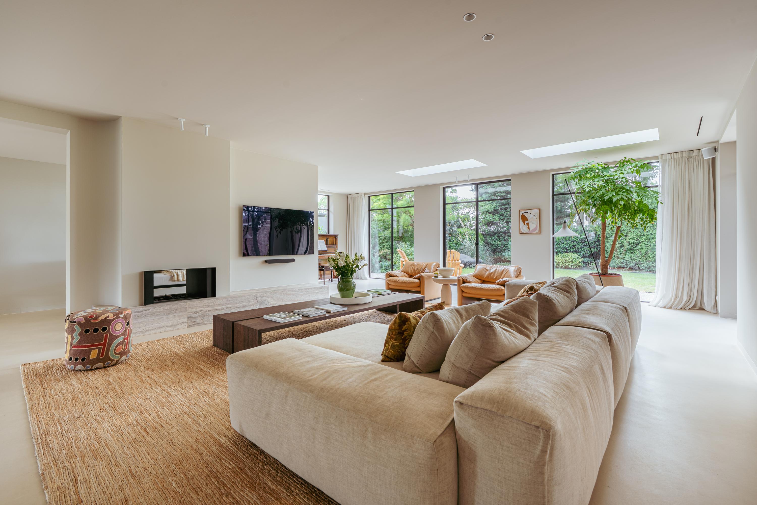 The expansive living room, featuring floor-to-ceiling windows and a stunning round bay window, is bathed in natural light, instantly creating a sense of space and tranquillity. The elegant fireplace forms a central feature of the open-plan living area, which flows seamlessly into the luxurious kitchen. The kitchen is equipped with high-end built-in appliances and modern conveniences, including a generous island of approx. 5 metres, Quooker tap, dishwasher, fridge/freezer combination, and an induction hob with integrated extractor. The exclusive book-matched marble worktop extends into the sink, giving the kitchen a refined and sophisticated finish. French steel doors open onto the delightful covered terrace and beautifully landscaped garden. Adjoining the kitchen is the spacious dining room.