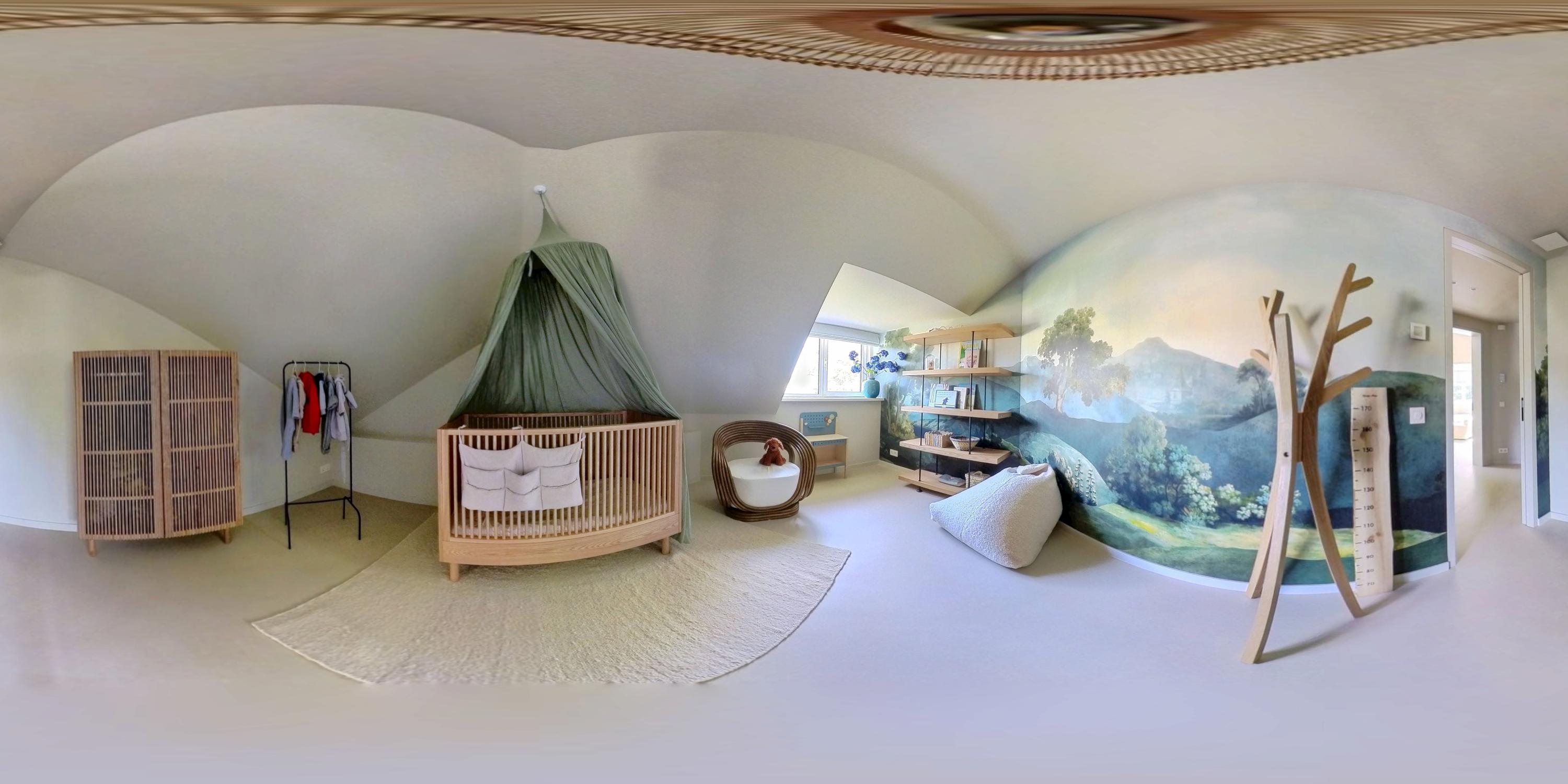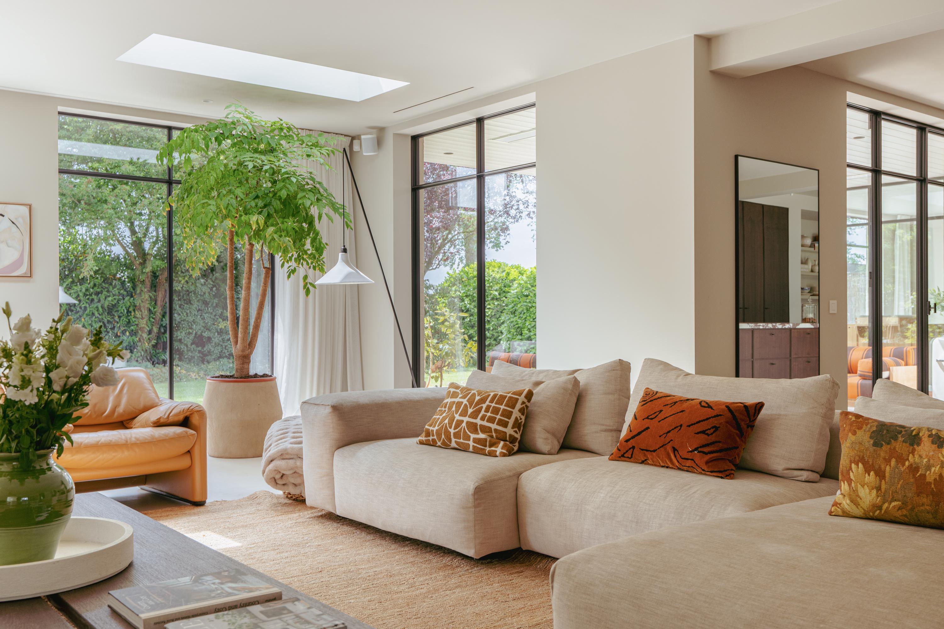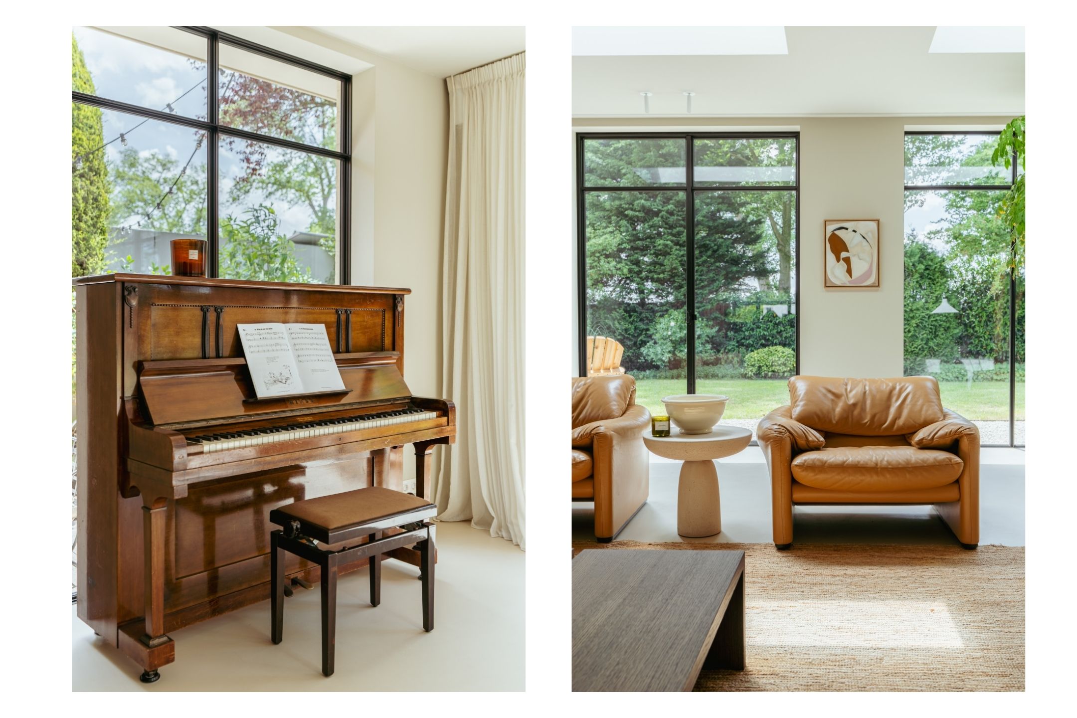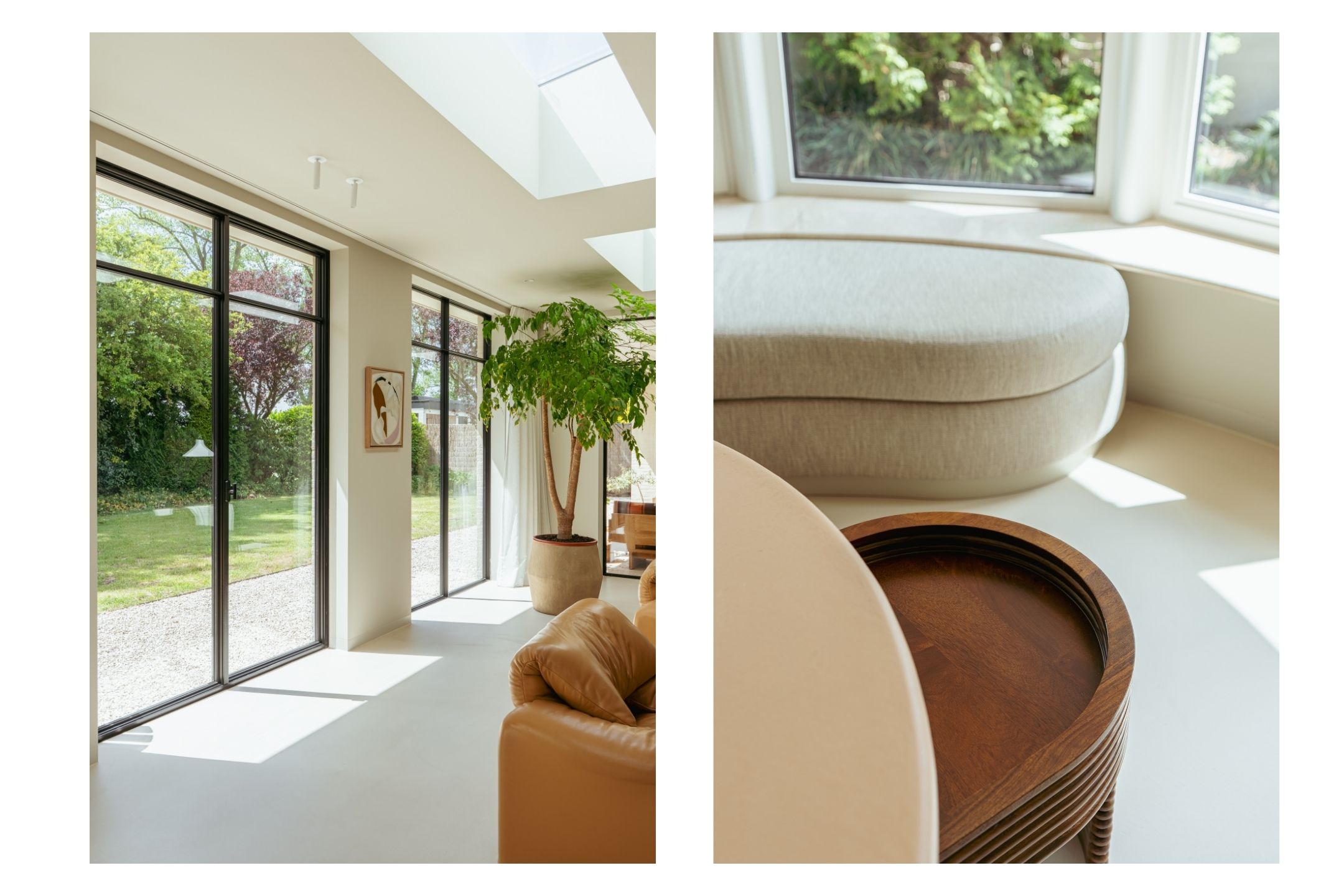 The expansive living room, featuring floor-to-ceiling windows and a stunning round bay window, is bathed in natural light, instantly creating a sense of space and tranquillity. The elegant fireplace forms a central feature of the open-plan living area, which flows seamlessly into the luxurious kitchen. The kitchen is equipped with high-end built-in appliances and modern conveniences, including a generous island of approx. 5 metres, Quooker tap, dishwasher, fridge/freezer combination, and an induction hob with integrated extractor. The exclusive book-matched marble worktop extends into the sink, giving the kitchen a refined and sophisticated finish. French steel doors open onto the delightful covered terrace and beautifully landscaped garden. Adjoining the kitchen is the spacious dining room.