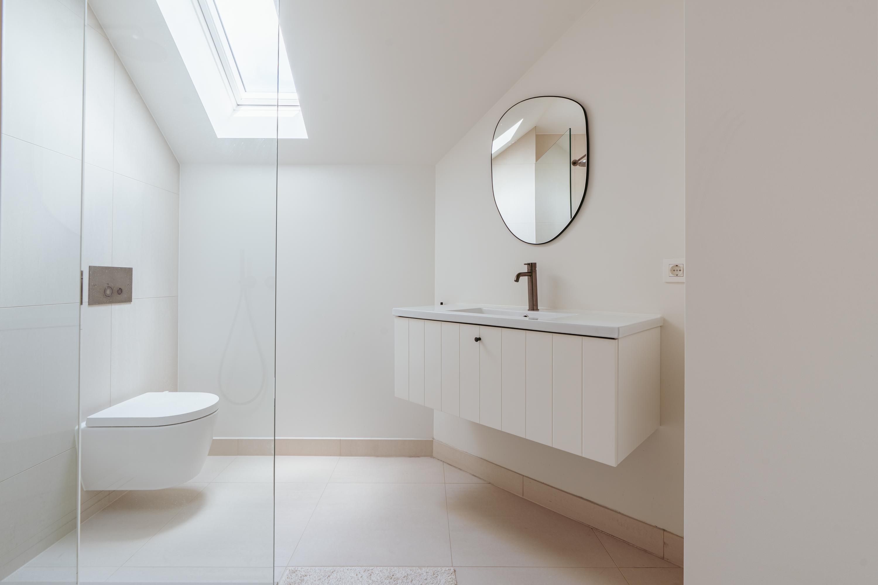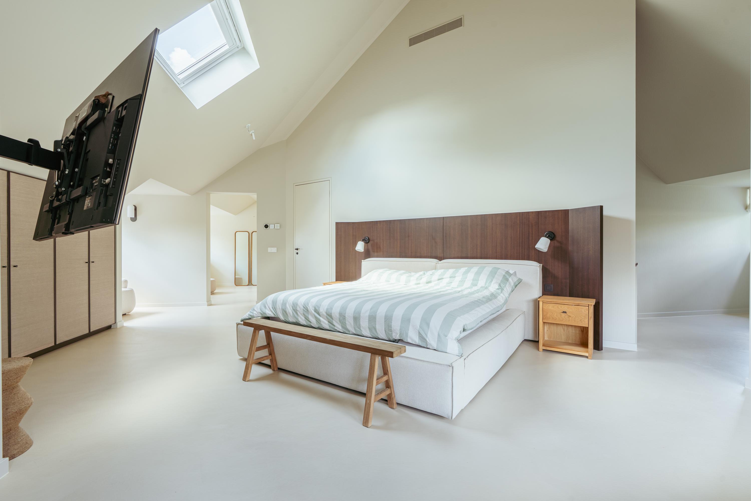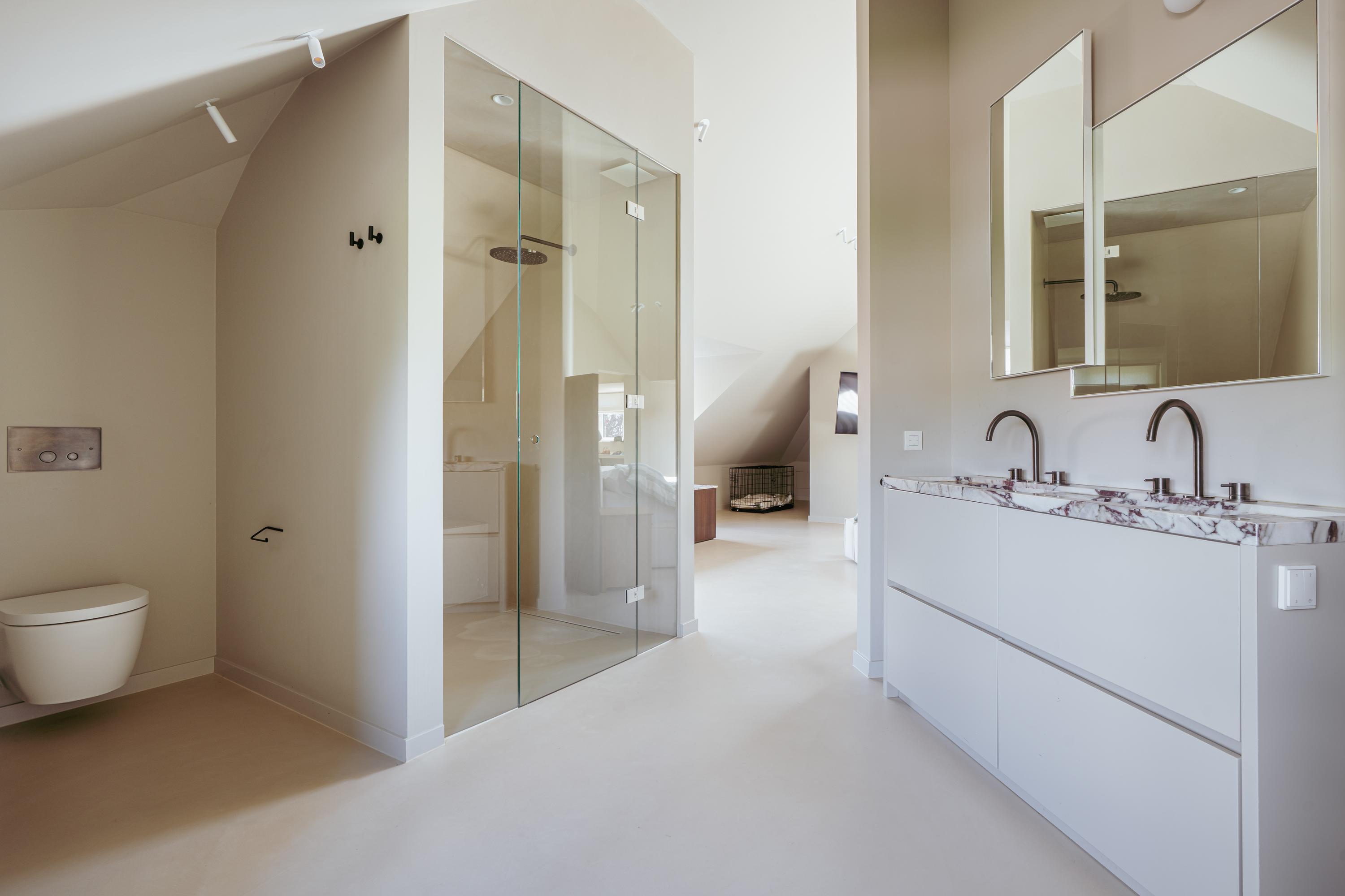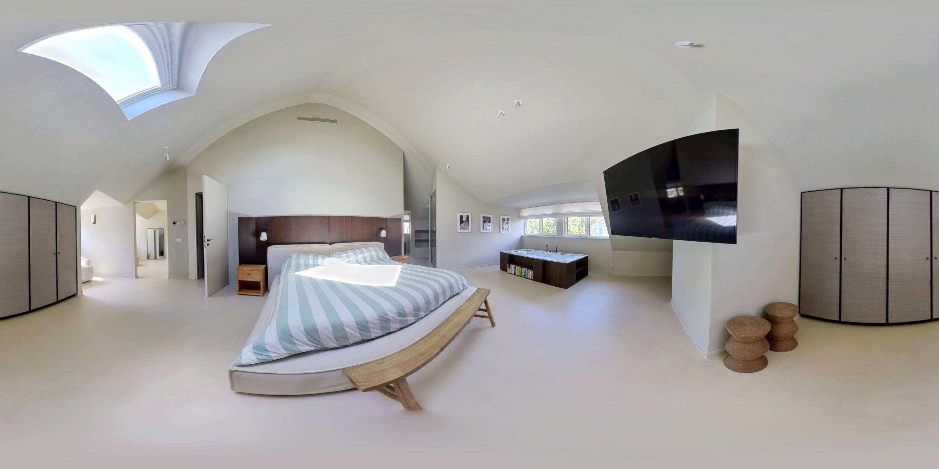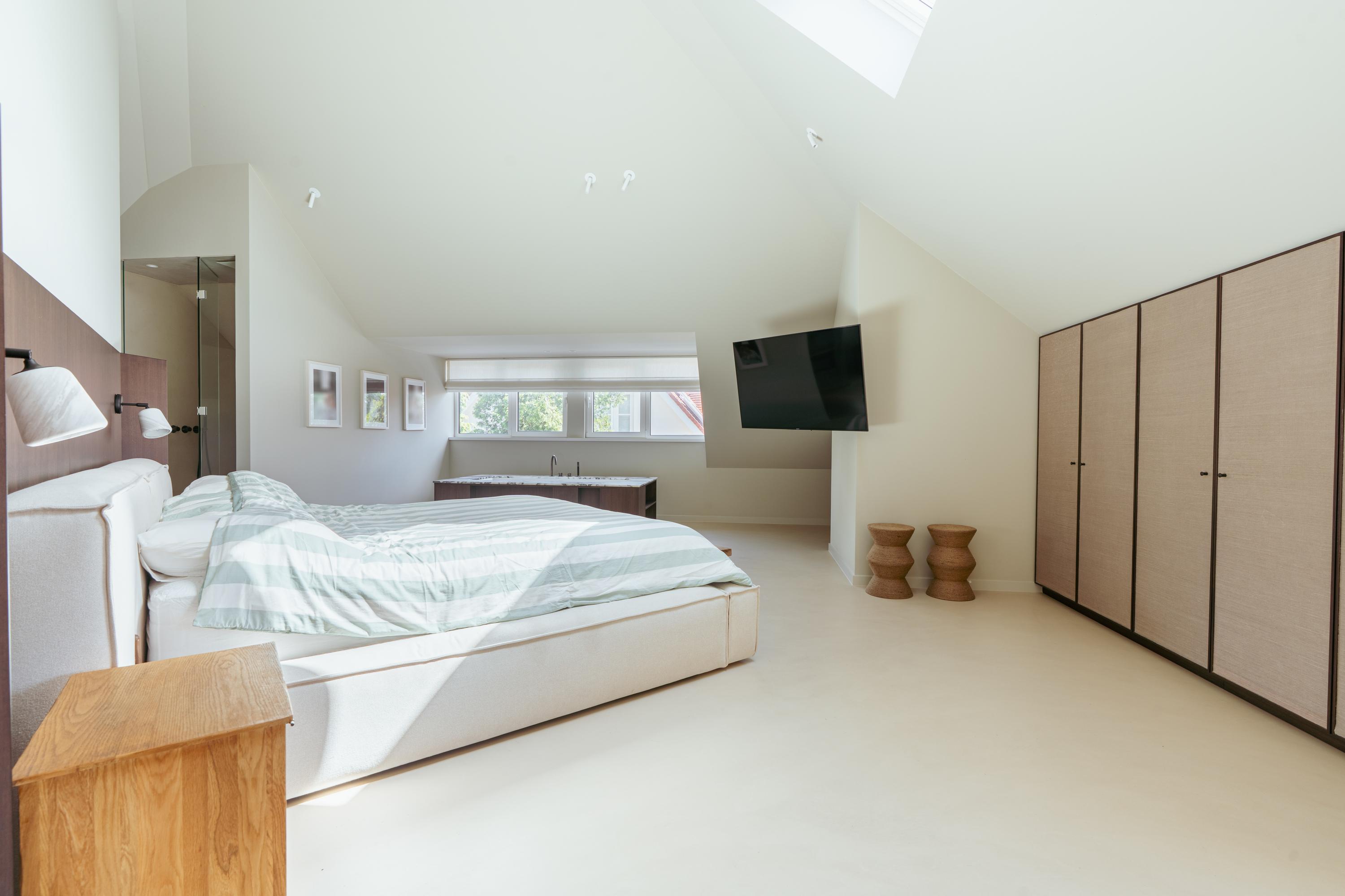 A staircase in the hallway leads to the first floor, where you will find three generously sized bedrooms. Thanks to their large dimensions, it would be simple to create a fourth or even fifth bedroom. The luxurious master bedroom features a freestanding bathtub, an en-suite bathroom, built-in wardrobes, and a spacious walk-in closet. The large bathroom is fitted with a double washbasin, walk-in shower, and WC. On the opposite side of the hallway, the second bathroom is also equipped with a walk-in shower, WC, and washbasin.