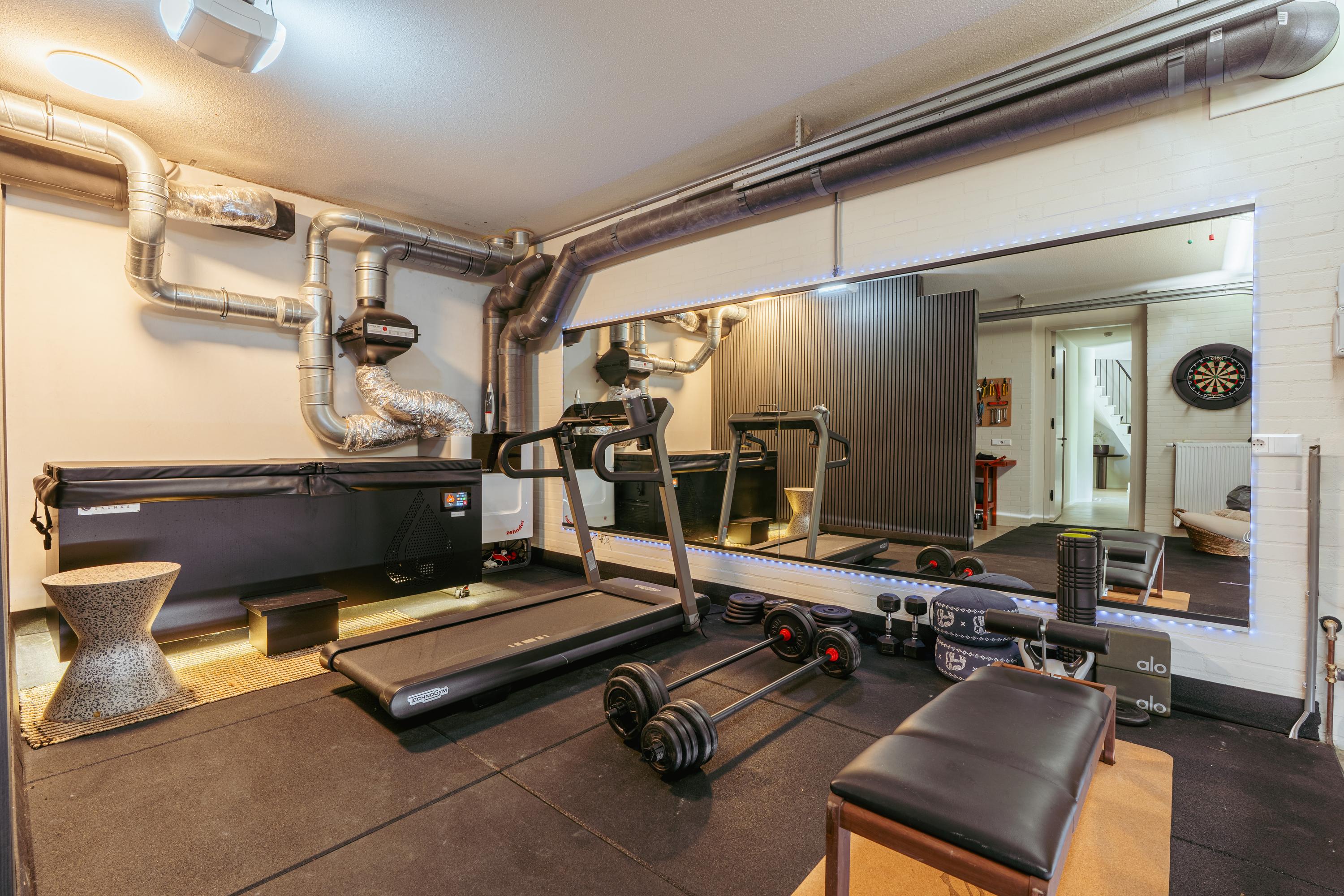 The elegant front garden leads to the impressive hallway, which provides access to all rooms on the ground floor. Immediately to the right is the spacious internal storage room housing the central heating system, laundry chute, water softener, and the home automation controls. Opposite, you will find a built-in cupboard and adjacent to it, the garage—currently set up as a fitness room. To the left of the hallway is a large guest WC with washbasin.