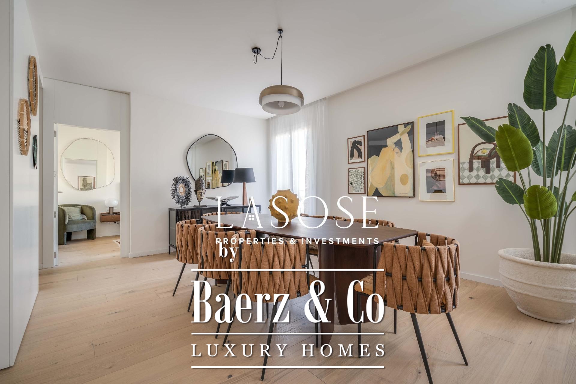 This particular residence offers 137 m² of living space, thoughtfully arranged with two bedrooms and three bathrooms. Balconies and a generous terrace connect interiors to the pulse of the city, while the building’s façade and communal areas reflect the elegance of classic Barcelona. Interior finishes, designed by Estudio Vilablanch, balance modernity with enduring style, featuring premium appliances, expansive wardrobes, heating, and a refined light-filled atmosphere.