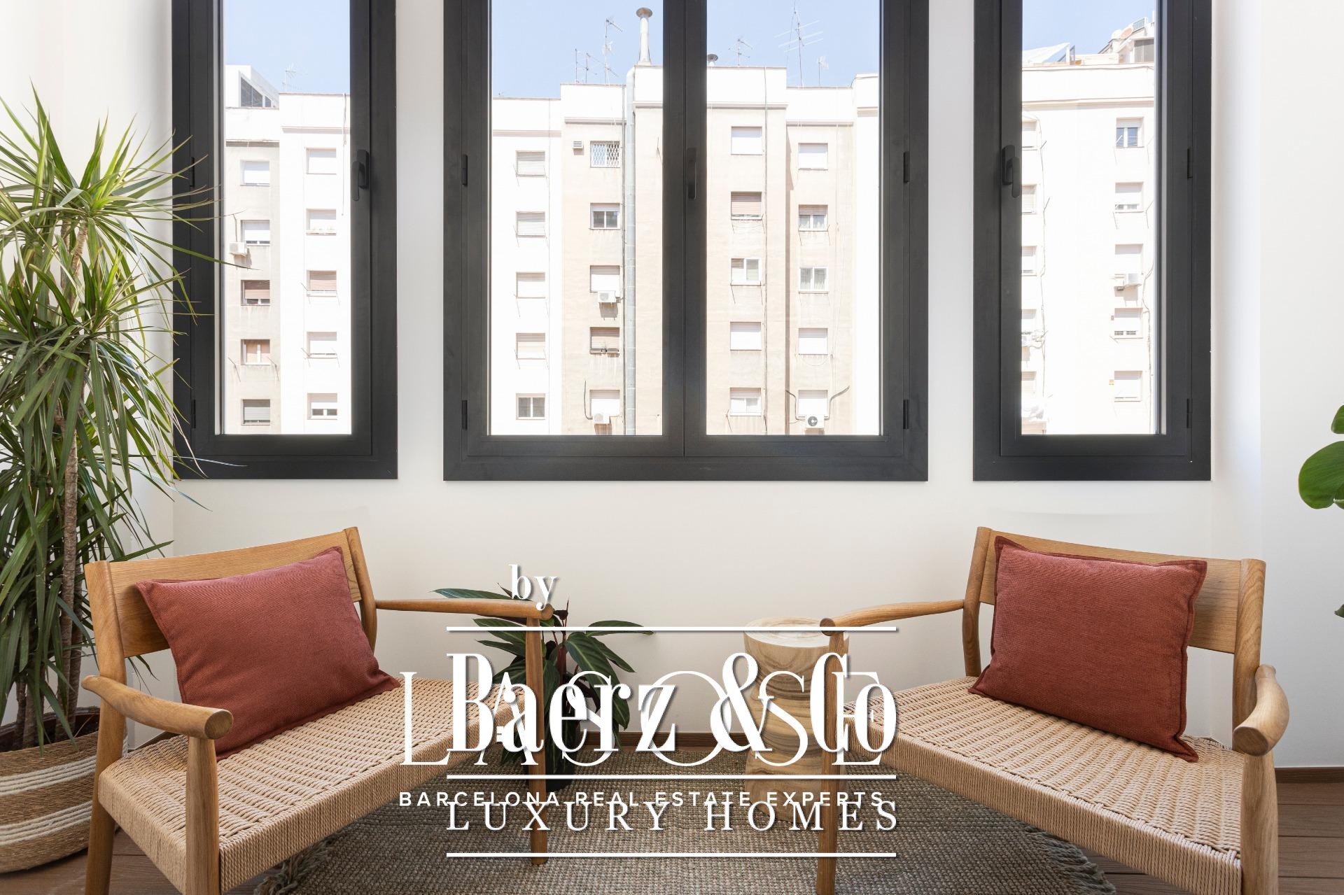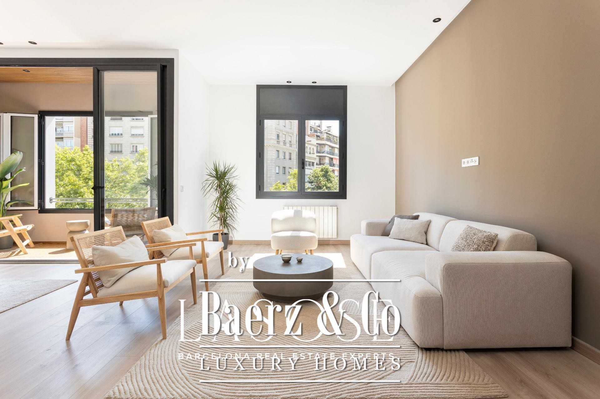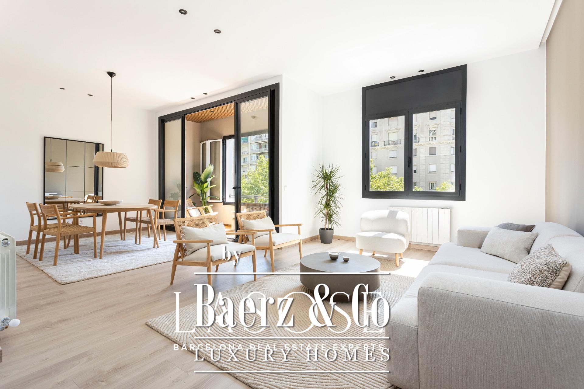 LASOSE presents this exclusive property located on the second floor (third real floor) of a stately estate on the prestigious Josep Tarradellas Avenue, this elegant residence has been completely refurbished with high quality finishes.. . It stands out for its great luminosity, thanks to its double orientation, as well as for its large interior spaces, with high ceilings.. . Upon entering, we find a large hall that leads to the day area, consisting of open kitchen, living room and dining room, with large windows through which you access a cozy gallery-balcony that allows unobstructed views to the outside.. . The open kitchen, of modern design, is equipped with integrated Bosch appliances, including oven, induction hob, dishwasher and extractor hood. The countertop is from Dekton by Cosentino in a sophisticated matte finish.. . The night area consists of three double bedrooms, all of them of large dimensions, and three full bathrooms (one of them en suite), as well as a laundry room.. . The master suite, very spacious, has access to a bright gallery, dressing room and en suite bathroom
