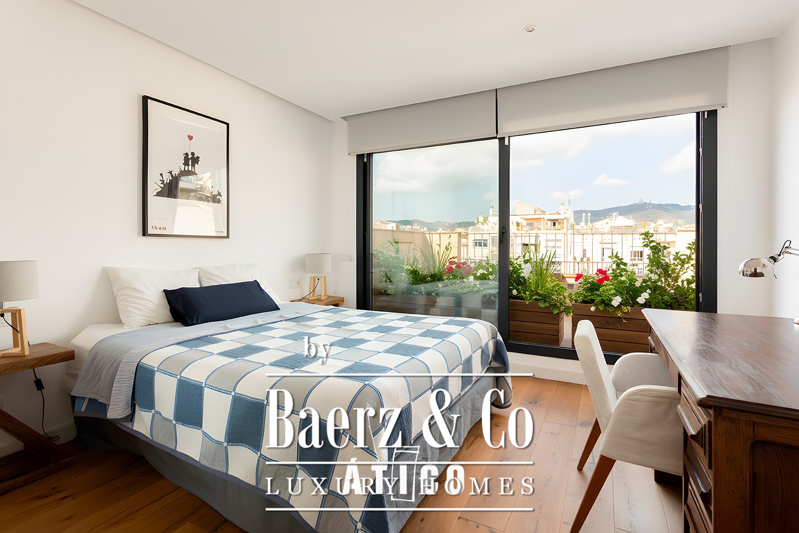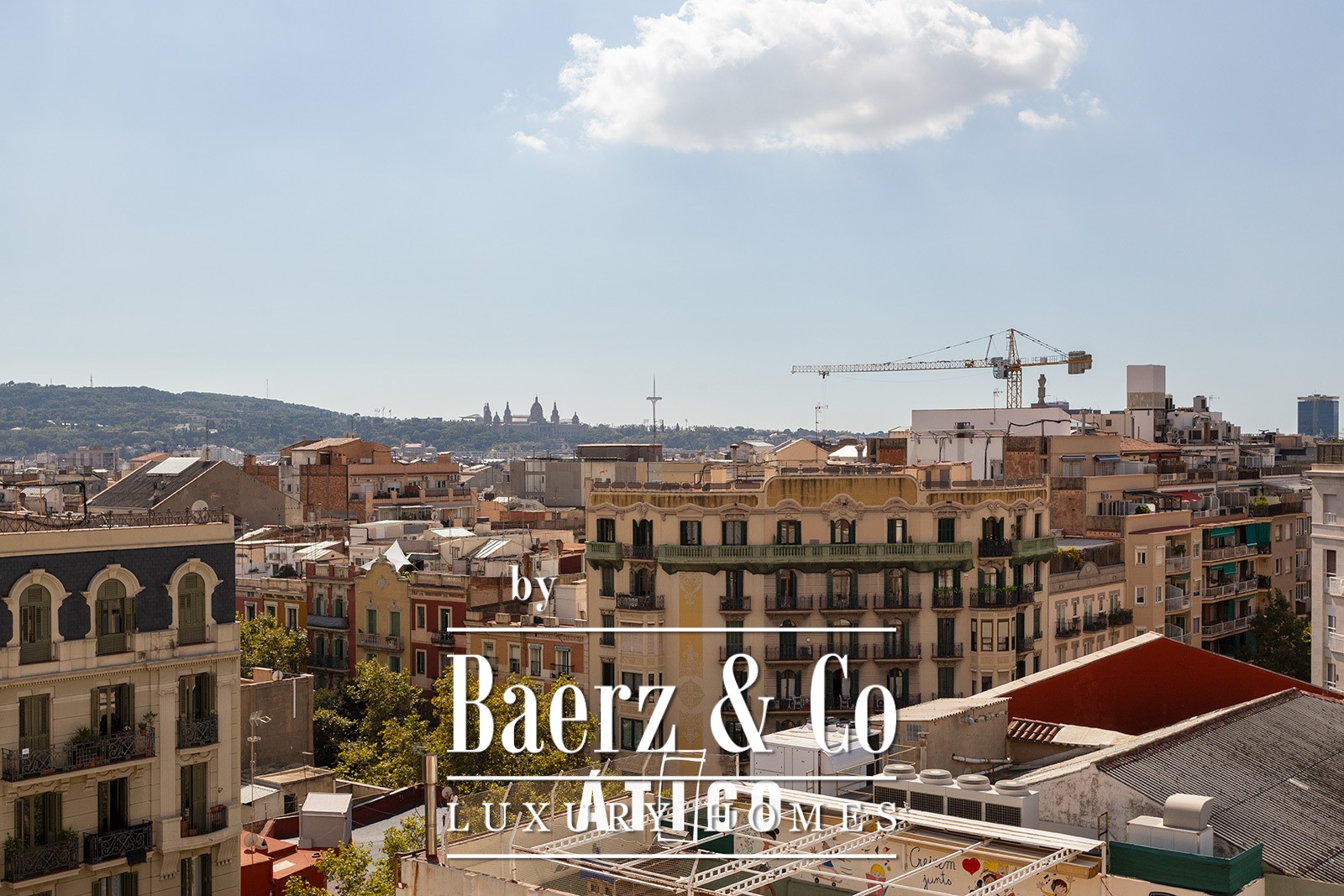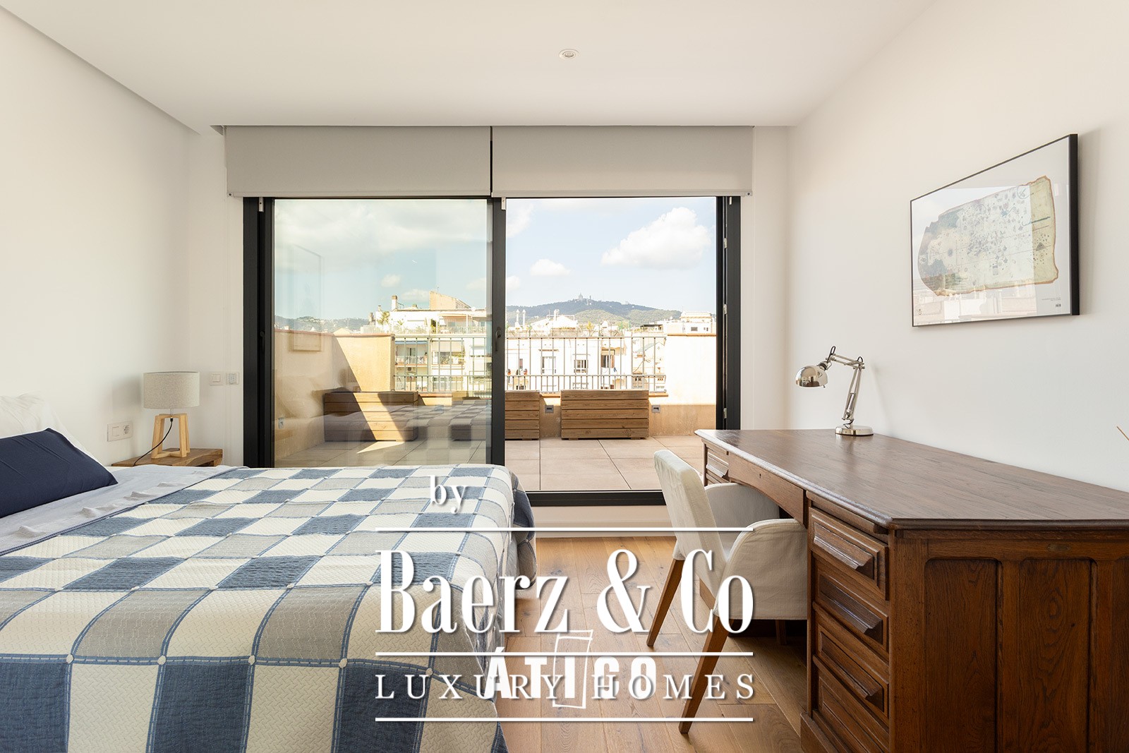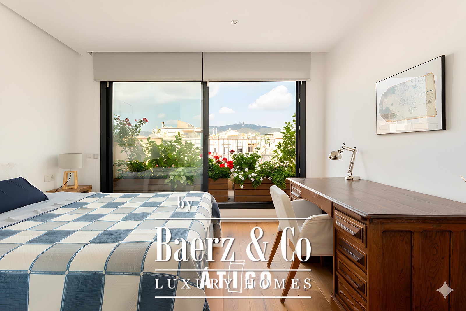 In the Eixample Izquierdo neighborhood, a stone's throw from Carrer Enric Granados, known for its bars, terraces, and cosmopolitan atmosphere, and just a six-minute walk from the vibrant and elegant Rambla Catalunya, lies this 138 m² penthouse, a true urban retreat that combines modern comfort with the charm of Barcelona life. Practically new and with an impeccable layout, this home has been designed to be enjoyed in every corner. The heart of the home is the spacious living-dining room with an open-plan kitchen, an open and welcoming space that extends onto a magnificent 16 m² terrace facing the sea, enjoying a majestic view that combines the grandeur of the National Palace with the serenity of Montjuïc Mountain. An ideal place to host dinner parties, enjoy a drink at sunset, or simply soak up the tranquility of the elevated surroundings. The master suite, spacious and bathed in natural light, has an elegant dressing room and an en suite bathroom. From here, there is direct access to a second 14m² terrace, facing Tibidabo and the emblematic "illa" of the Eixample district, an icon of Barcelona's urban planning. This dual orientation provides all-day sun and unobstructed views that fill the space with calm and clarity. At night, the illuminated silhouette of Tibidabo adds a special charm, turning this room into a true refuge with a serene and privileged atmosphere. The home is completed by a second double bedroom, with natural light, and a second bathroom with a bathtub, ideal for providing comfort and privacy for guests or adapting to different needs. The modern, functional kitchen, bathed in natural light, features custom-made furniture and is fully equipped with high-end appliances, as well as a wine cellar, ideal for those who value attention to detail and