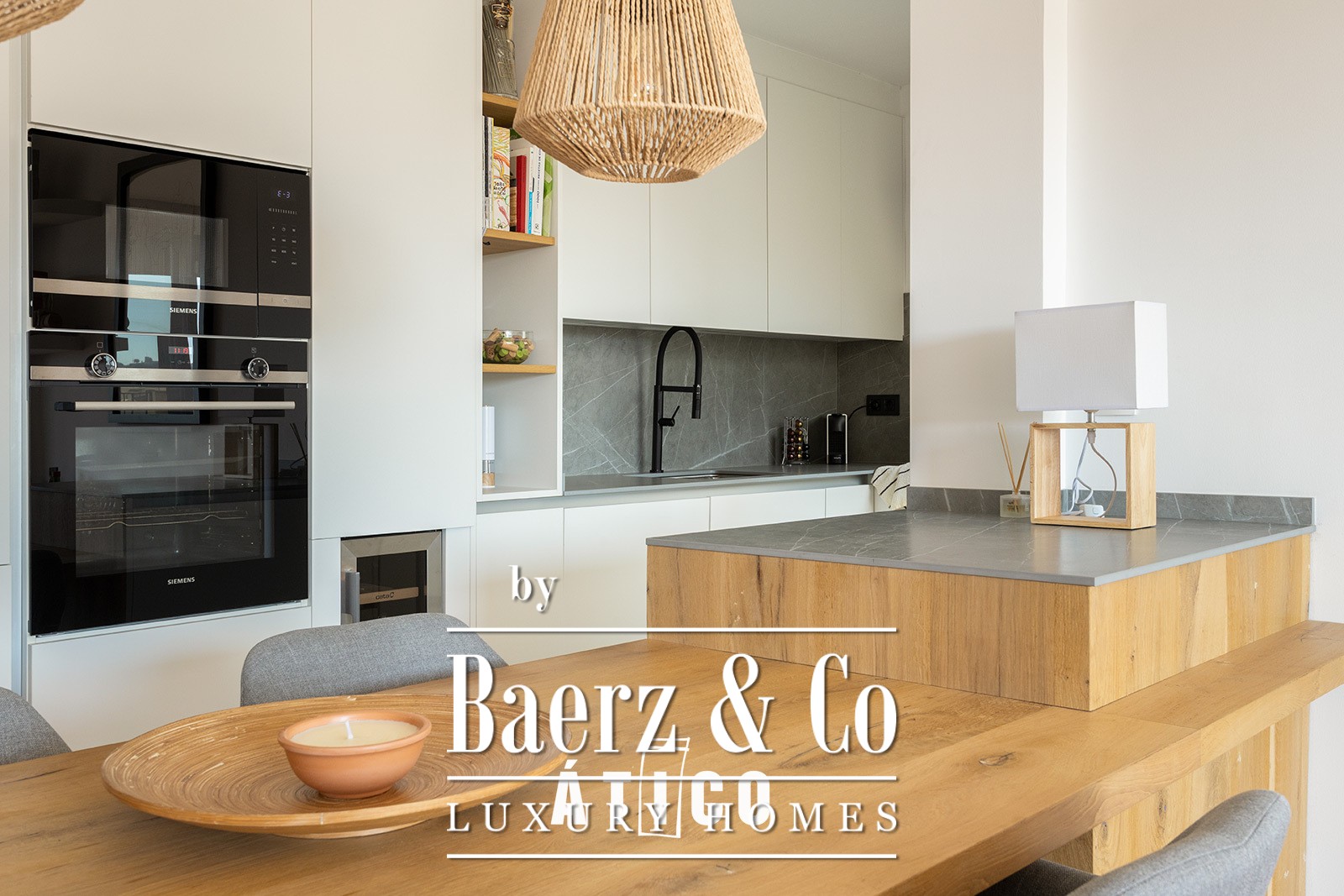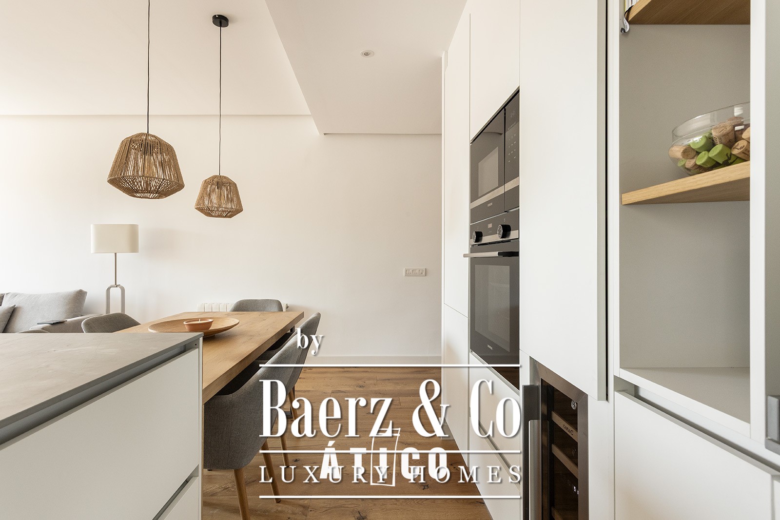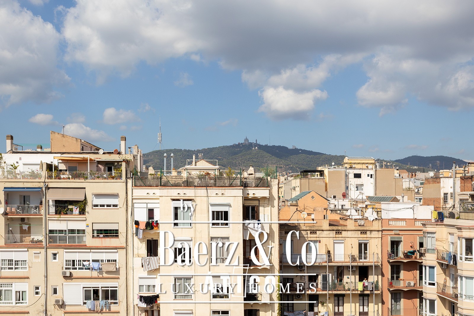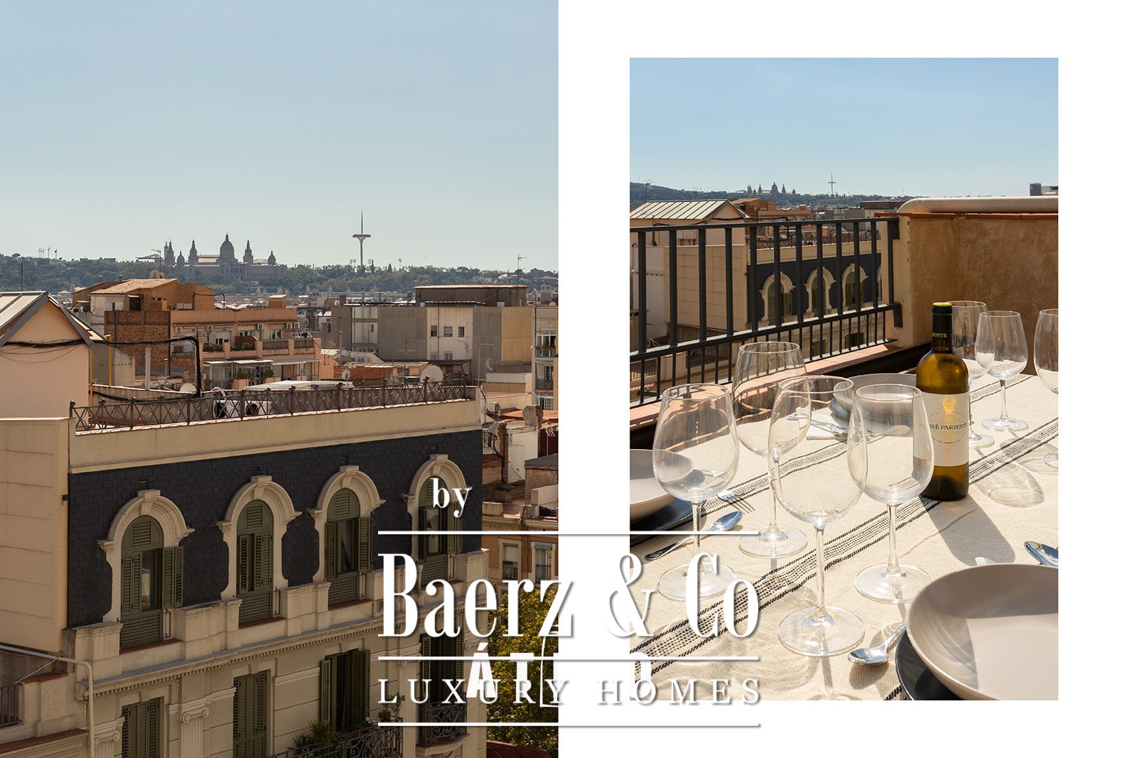 In the Eixample Izquierdo neighborhood, a stone's throw from Carrer Enric Granados, known for its bars, terraces, and cosmopolitan atmosphere, and just a six-minute walk from the vibrant and elegant Rambla Catalunya, lies this 138 m² penthouse, a true urban retreat that combines modern comfort with the charm of Barcelona life. Practically new and with an impeccable layout, this home has been designed to be enjoyed in every corner. The heart of the home is the spacious living-dining room with an open-plan kitchen, an open and welcoming space that extends onto a magnificent 16 m² terrace facing the sea, enjoying a majestic view that combines the grandeur of the National Palace with the serenity of Montjuïc Mountain. An ideal place to host dinner parties, enjoy a drink at sunset, or simply soak up the tranquility of the elevated surroundings. The master suite, spacious and bathed in natural light, has an elegant dressing room and an en suite bathroom. From here, there is direct access to a second 14m² terrace, facing Tibidabo and the emblematic "illa" of the Eixample district, an icon of Barcelona's urban planning. This dual orientation provides all-day sun and unobstructed views that fill the space with calm and clarity. At night, the illuminated silhouette of Tibidabo adds a special charm, turning this room into a true refuge with a serene and privileged atmosphere. The home is completed by a second double bedroom, with natural light, and a second bathroom with a bathtub, ideal for providing comfort and privacy for guests or adapting to different needs. The modern, functional kitchen, bathed in natural light, features custom-made furniture and is fully equipped with high-end appliances, as well as a wine cellar, ideal for those who value attention to detail and
