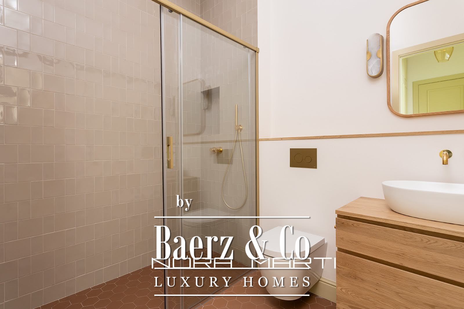 The living room, anchored by handcrafted local tiles and floor-to-ceiling windows, opens to a quiet terrace, blending indoor comfort with outdoor calm. A fully modernized kitchen, equipped with a wine cellar, large oven, and spacious dining area, fosters both daily living and hosting. Interior design weaves natural elements with subtle elegance, pairing natural oak flooring in wide planks with underfloor heating and dual-zone climate control for consistent comfort.