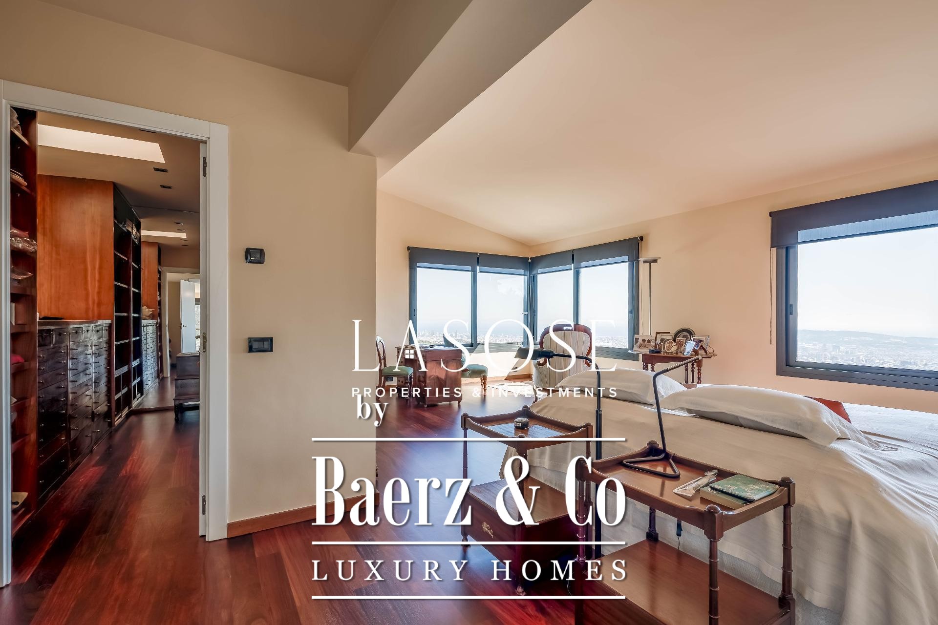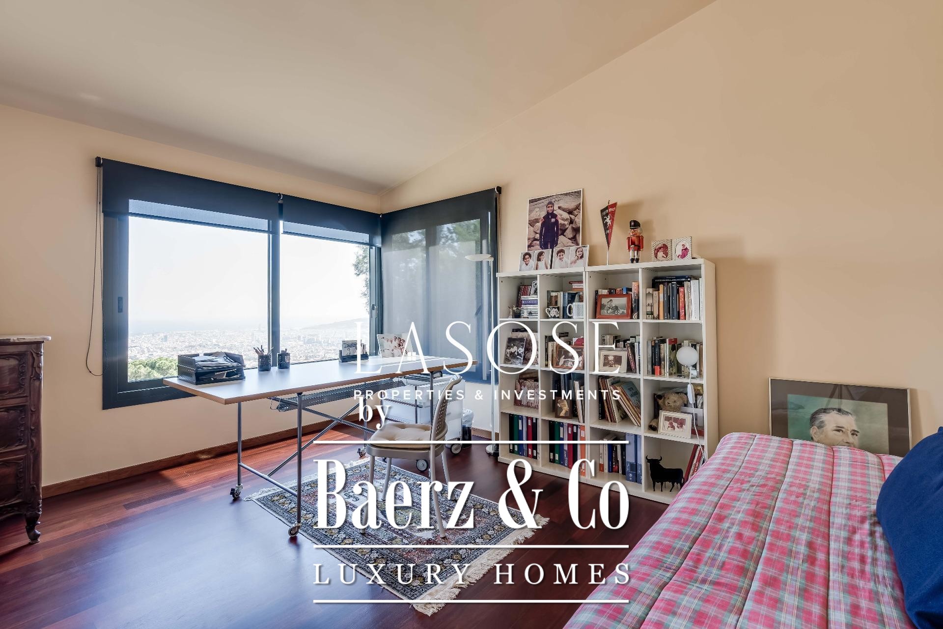 Entering the main floor, an expansive hall leads into an impressive living and dining area. This central space opens out to a 90 m² terrace, framing unobstructed vistas over Barcelona and Collserola Park. The independent kitchen is fully equipped and augmented by a pantry and laundry area with separate entrance, while an adjacent bedroom with bathroom serves flexibly as a guest suite or additional living area. Underfloor slate heating carries throughout the ground level, complemented by direct internal access to a two-car garage.