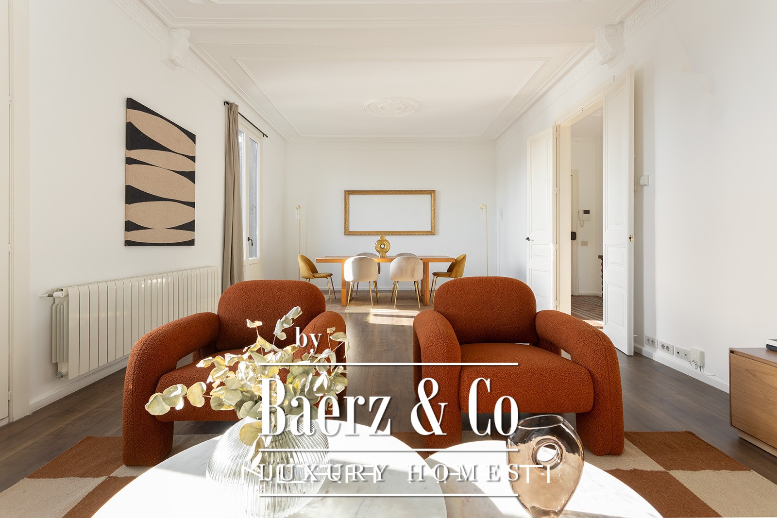 The 152 m² apartment has been extensively renovated, bringing contemporary sensibility to historic bones. Inside, refined modern furnishings lend clarity and cohesion, setting the tone for discreet urban living. The layout features three bedrooms, including one double and two singles, and two bathrooms, creating a balance of private and social spaces. The living room’s tall windows, characteristic of its era, saturate the interiors with natural light, enhanced by a favorable orientation and the warmth of parquet floors. A fully equipped kitchen with a breakfast area adds comfort to the daily rhythm.