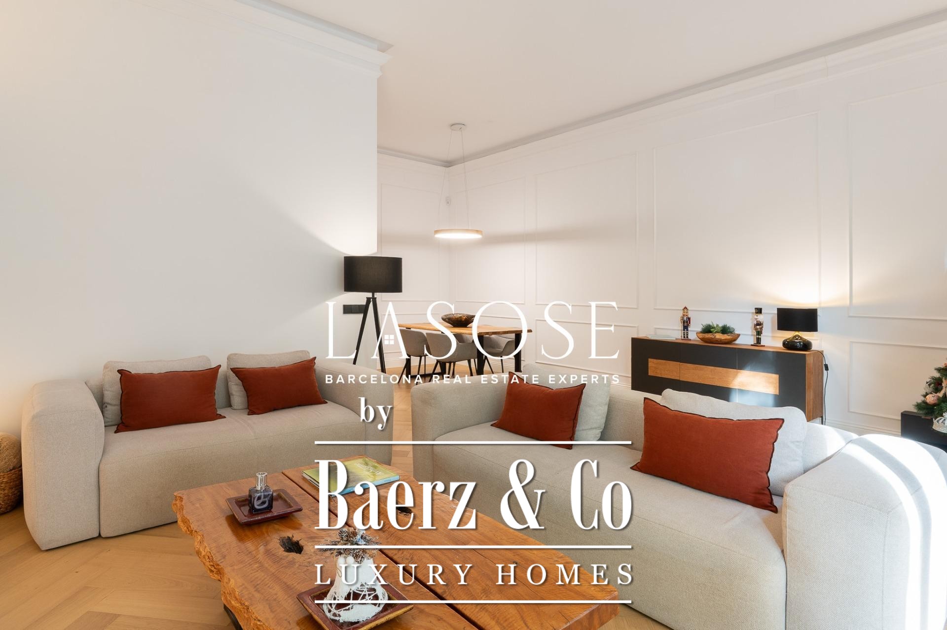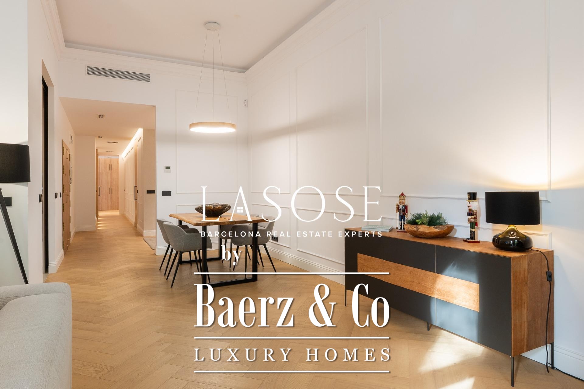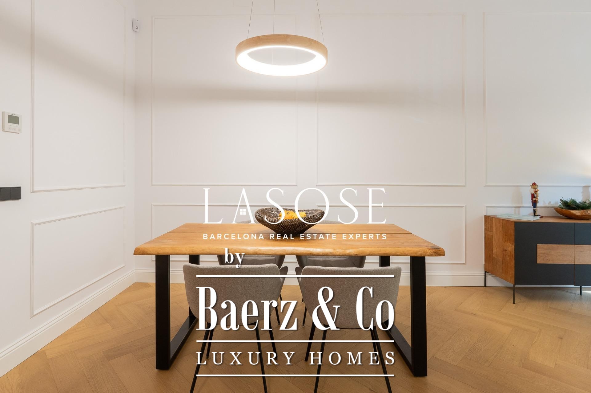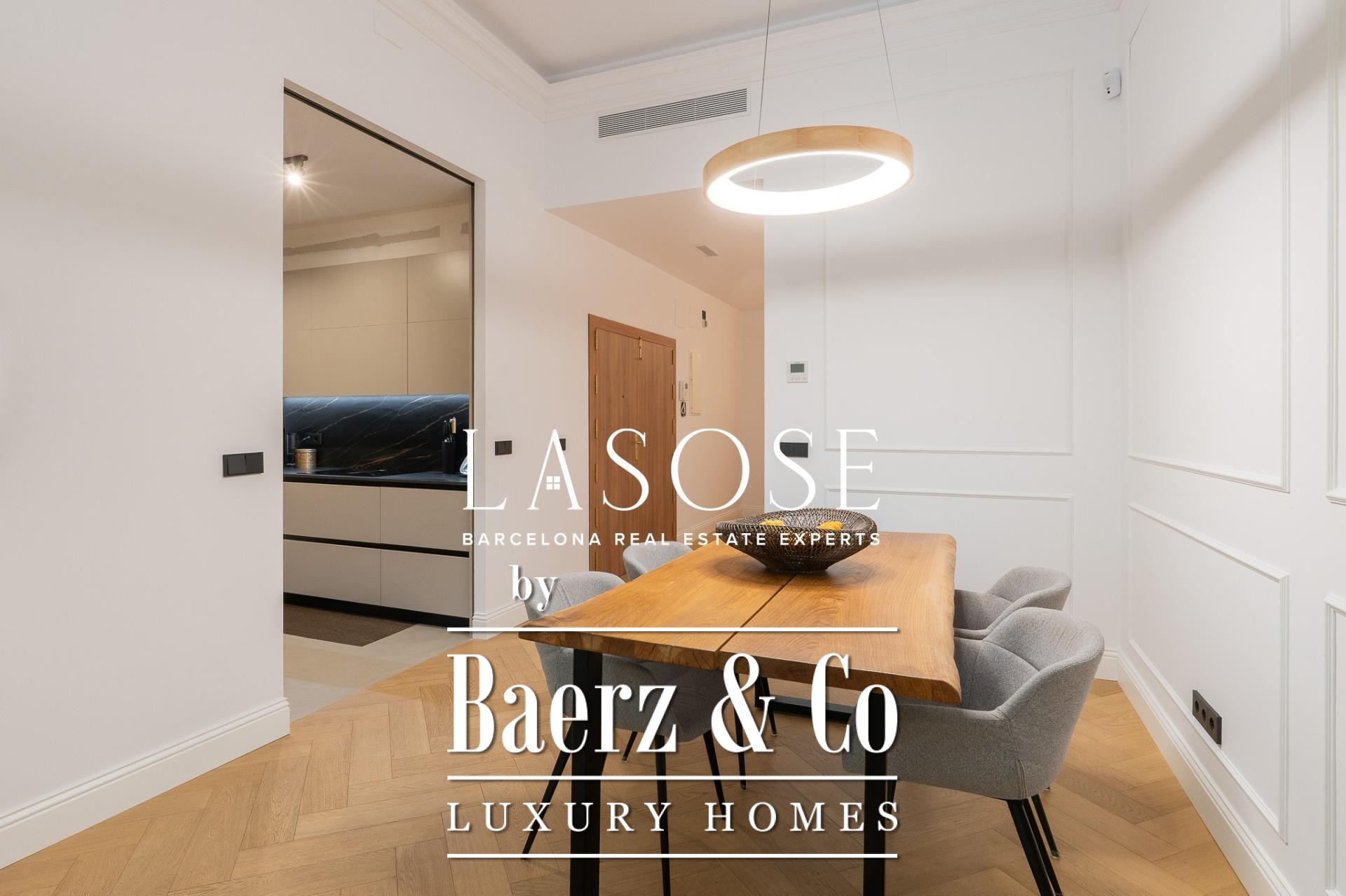 The apartment’s layout is defined by a spacious independent living and dining room with high ceilings, three bedrooms—including a refined en-suite, one double, and one single—and two full bathrooms. A fully equipped kitchen features contemporary design with premium materials, providing a seamless blend of modernity and tradition. A balcony of about 4.61 square meters offers light, city views, and a direct connection to the atmosphere of Carrer de Casp.