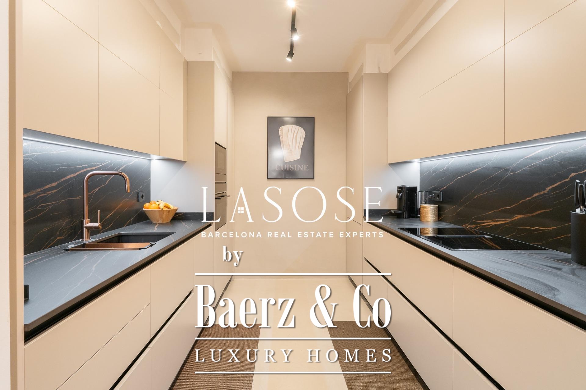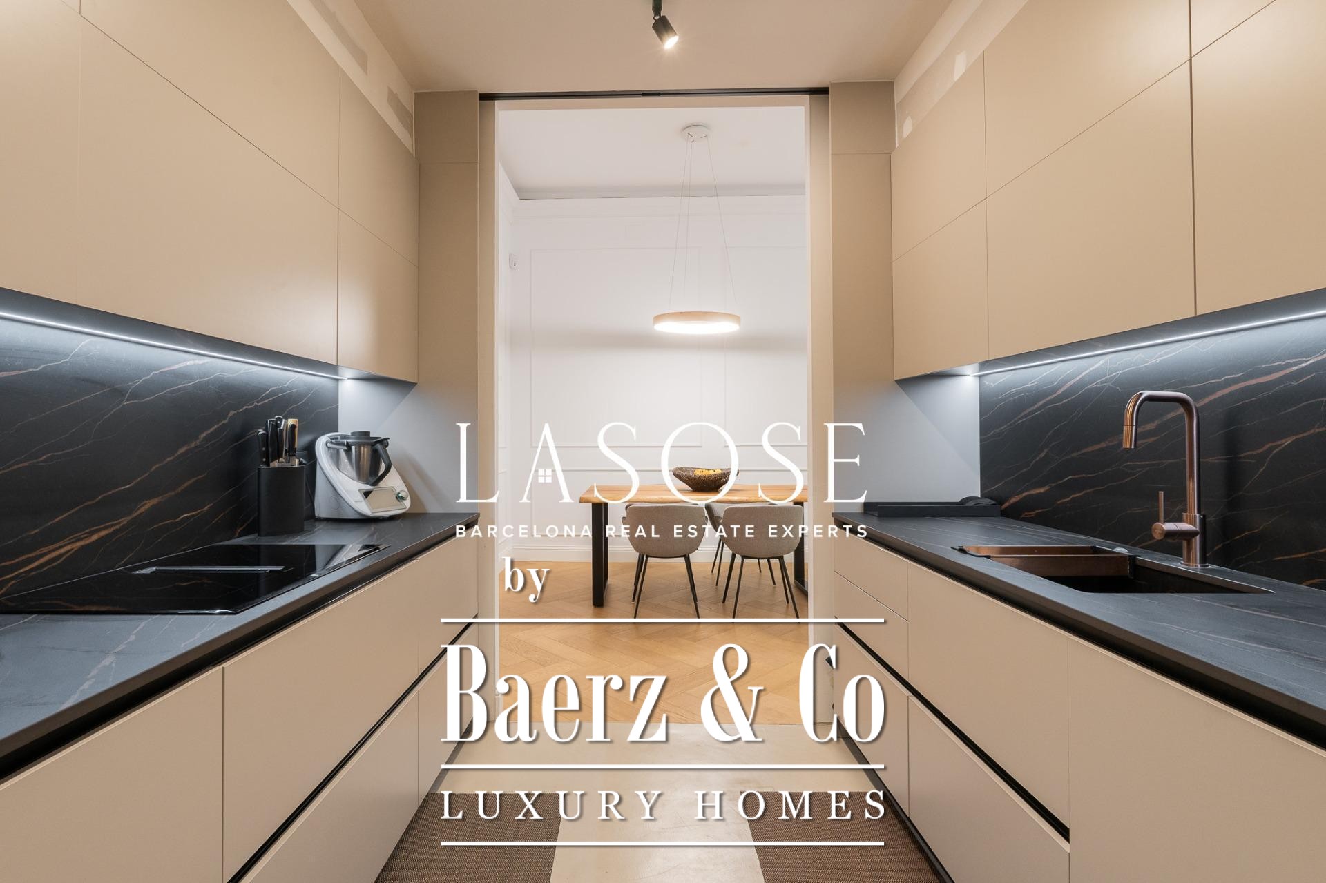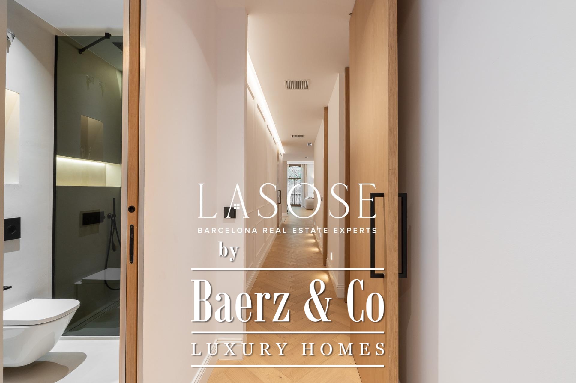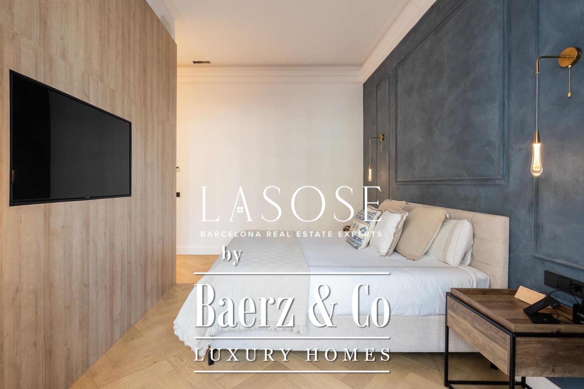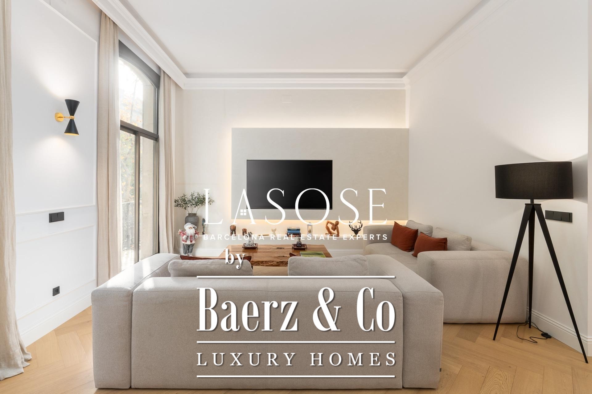 The apartment’s layout is defined by a spacious independent living and dining room with high ceilings, three bedrooms—including a refined en-suite, one double, and one single—and two full bathrooms. A fully equipped kitchen features contemporary design with premium materials, providing a seamless blend of modernity and tradition. A balcony of about 4.61 square meters offers light, city views, and a direct connection to the atmosphere of Carrer de Casp.