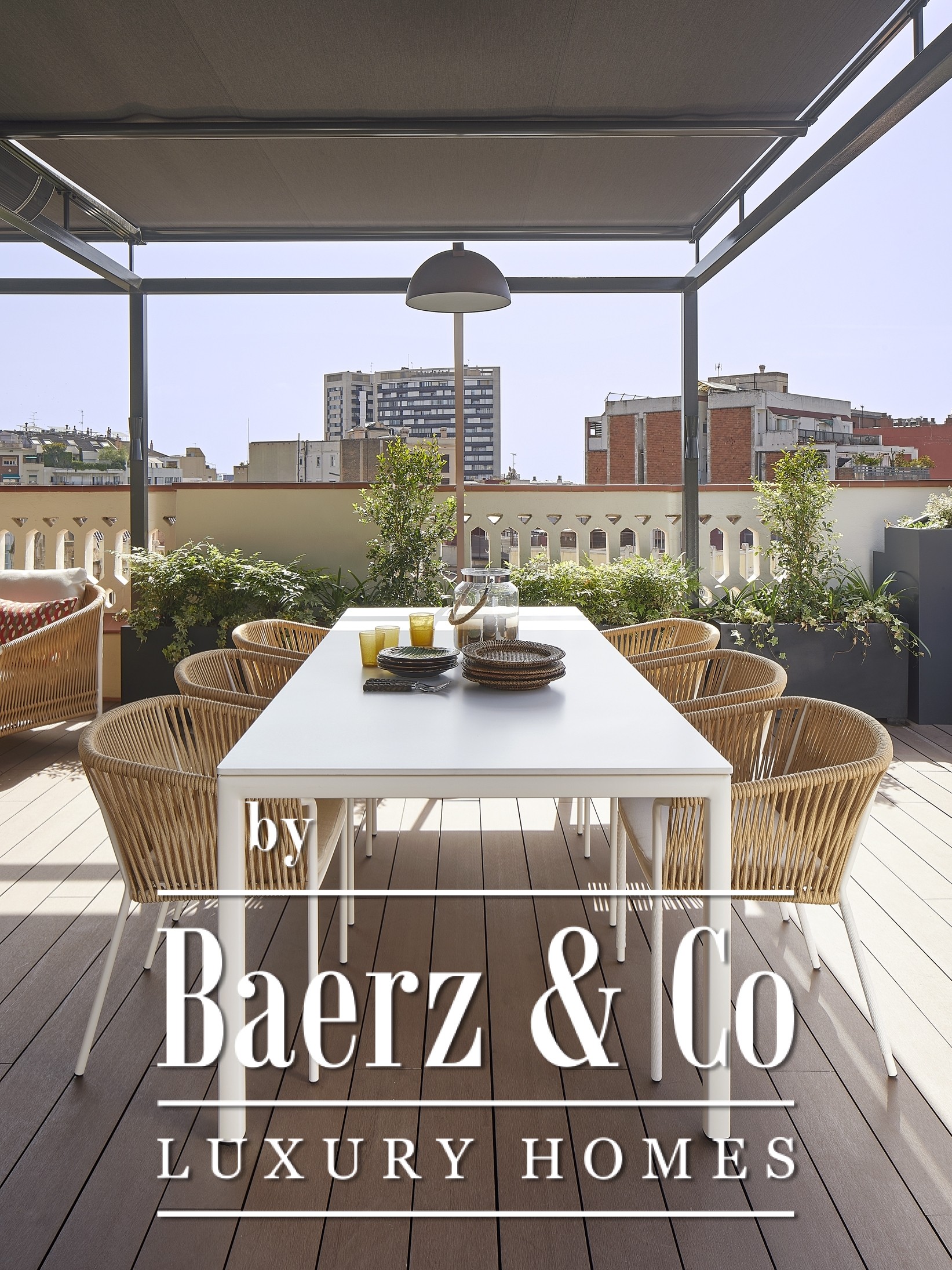 Penthouse Barcelona represents a rare convergence of classic architectural heritage and refined contemporary living. This meticulously renovated penthouse, set within an elegant corner building in the Eixample district, commands attention with 274 m² of living space anchored by a remarkable 100 m² private terrace. Sunlight pours through six exterior balconies, illuminating an open-plan interior where the living room, dining area, and designer kitchen flow seamlessly together. The penthouse Barcelona experience is further enhanced by a bespoke studio and a sculptural staircase ascending to the crown jewel of the home—an expansive rooftop oasis.