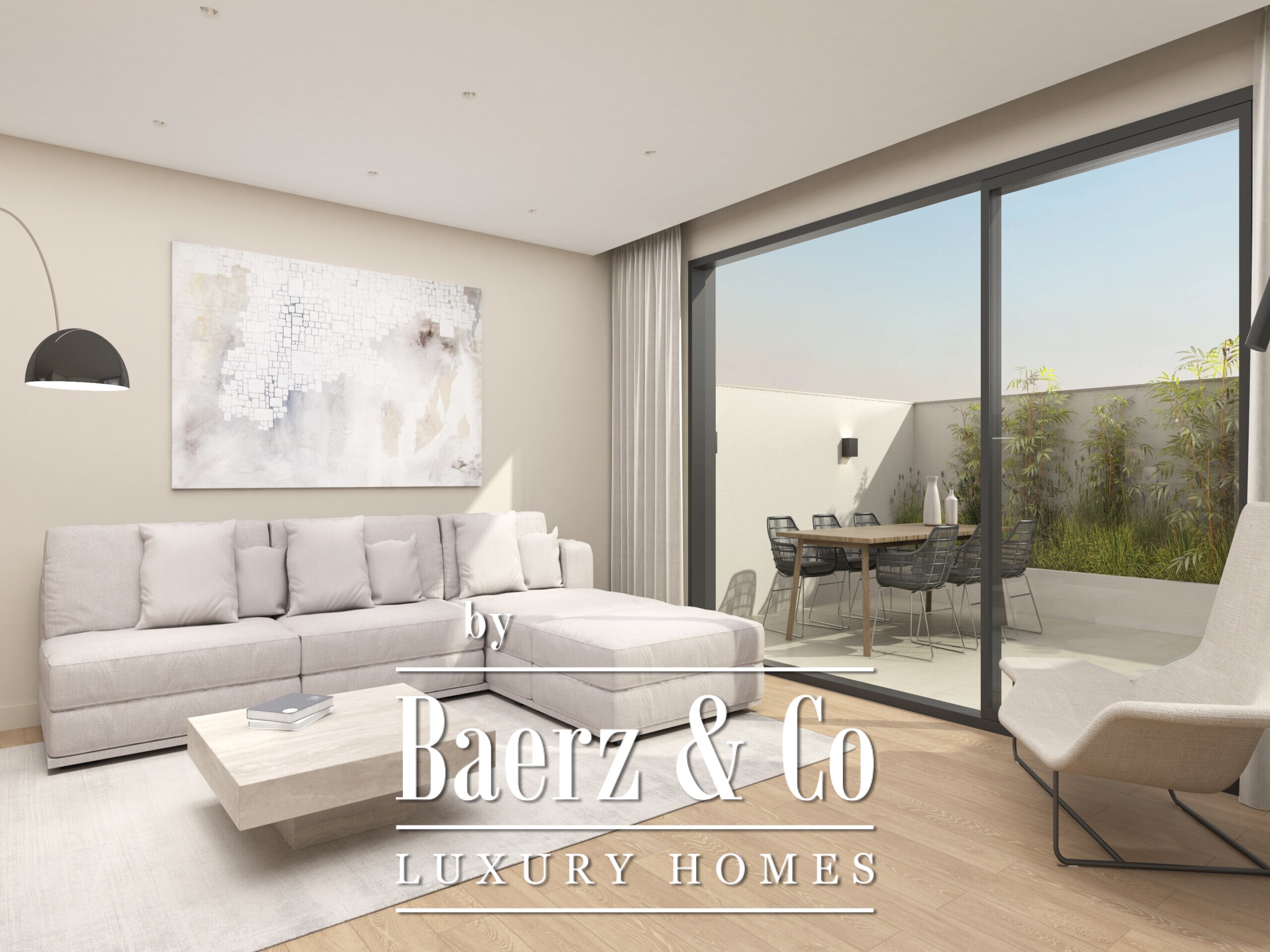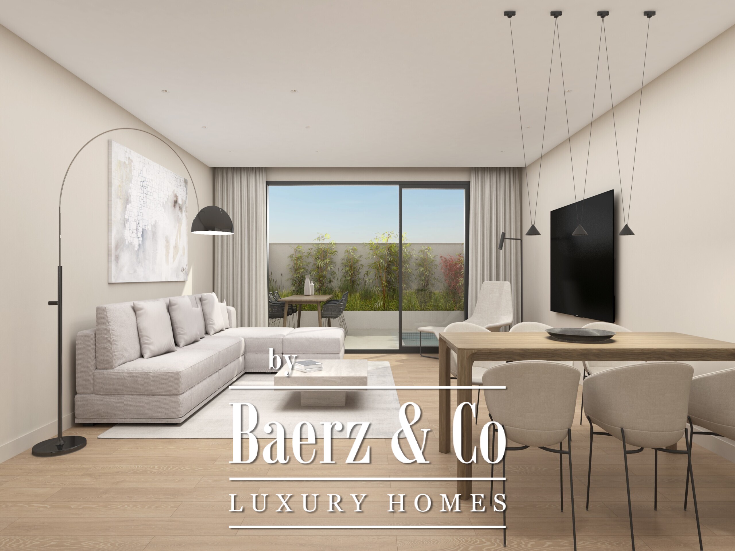 Housed in a newly built project of four exclusive residences, the 127m² duplex spans a ground floor and upper level, introducing light and space through considered design. The main living and dining area—spanning 59.24m²—features an open kitchen and seamless flow to a 22m² private garden, where the possibility of a personal pool offers a further layer of tranquility. Upstairs, two bedrooms comprise a 13m² suite with built-in wardrobe and en-suite, alongside a secondary 8.44m² bedroom and adjacent full bathroom. Every room is exterior facing, ensuring natural light throughout.