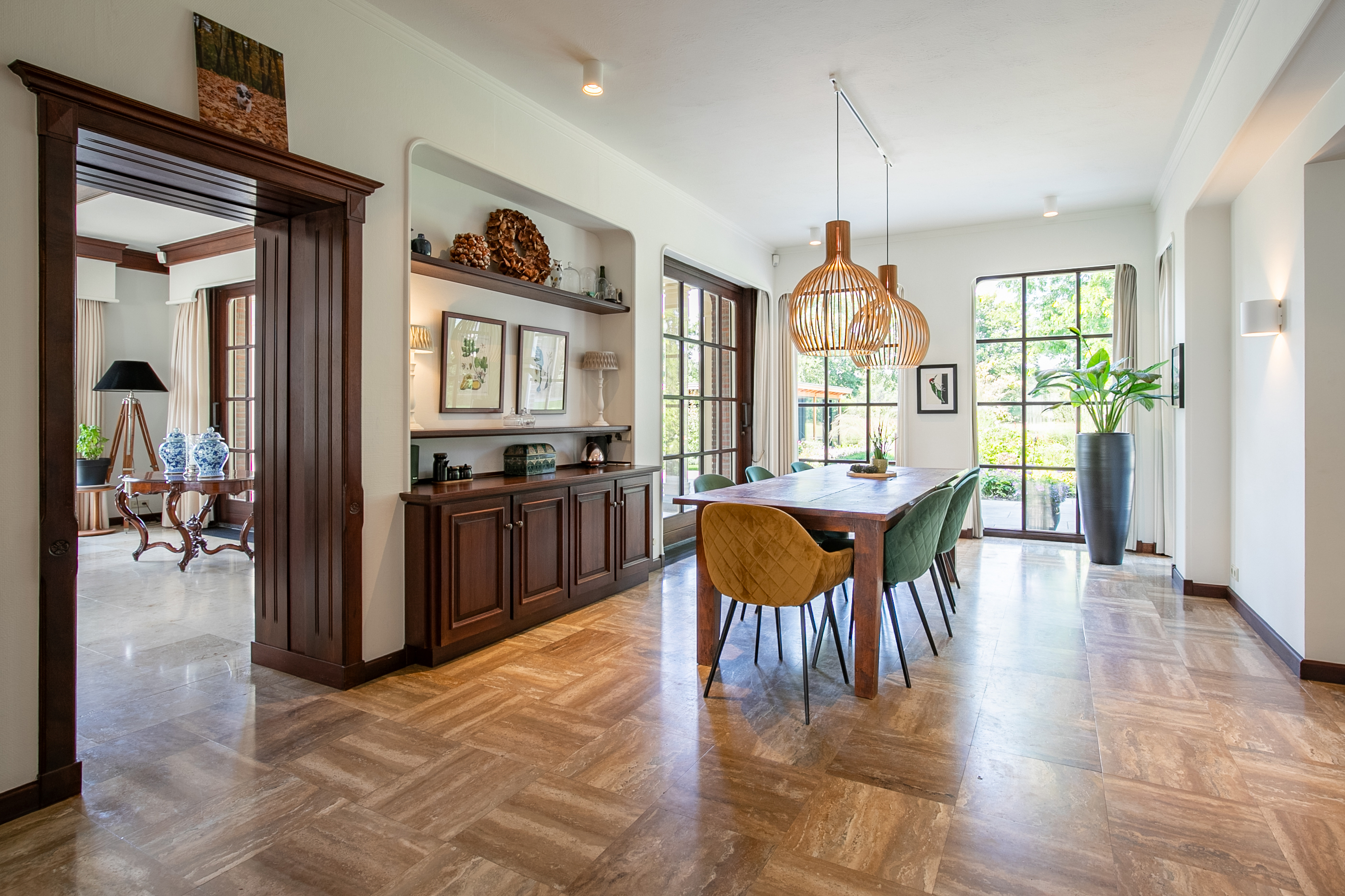 The spacious hallway features a marble floor with underfloor heating, a staircase to the first floor, cloakroom, and guest toilet. The living areas offer a bright and open layout, including a cozy fireplace, dining room adjacent to the kitchen, and a front-facing sitting room. Large windows and the open connection to the covered terrace create a wonderfully spacious feel.