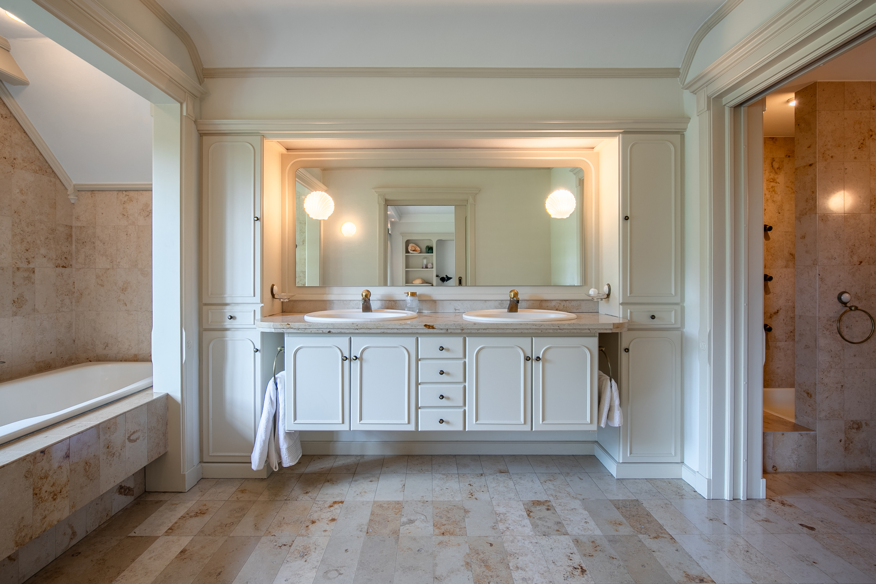 Five (bed)rooms and two bathrooms. The master suite at the rear includes: En-suite bathroom with walk-in shower, bathtub, toilet, bidet, and double vanity, walk-in closet, balcony overlooking the garden.