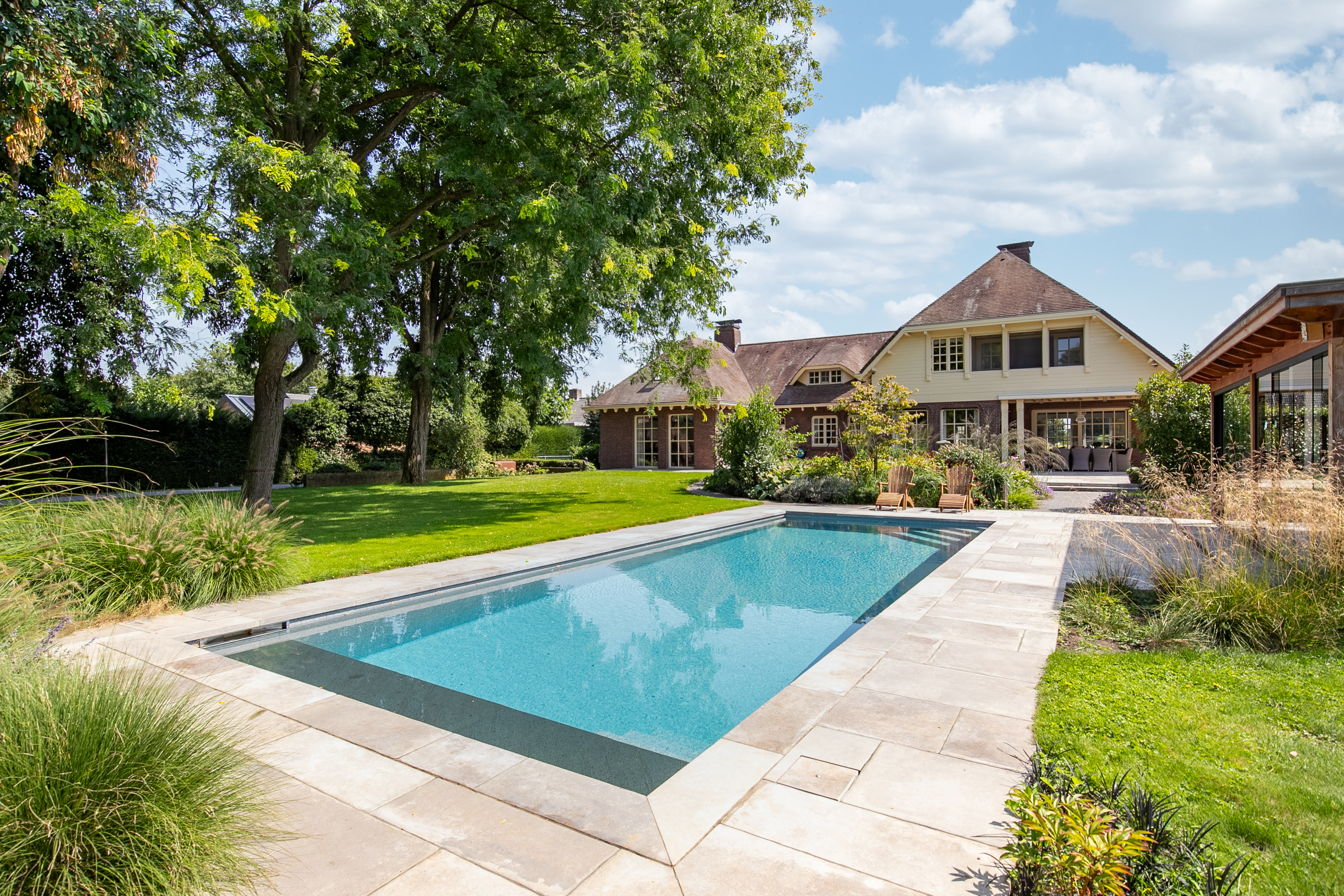 The lush, park-like garden offers complete privacy and includes: Mature trees and lawn (with groundwater pump and irrigation system), Flower beds with various plantings, a large tiled terrace directly behind the house, professionally installed, fully automated swimming pool with cover and jet stream and a pool house with pump installation.