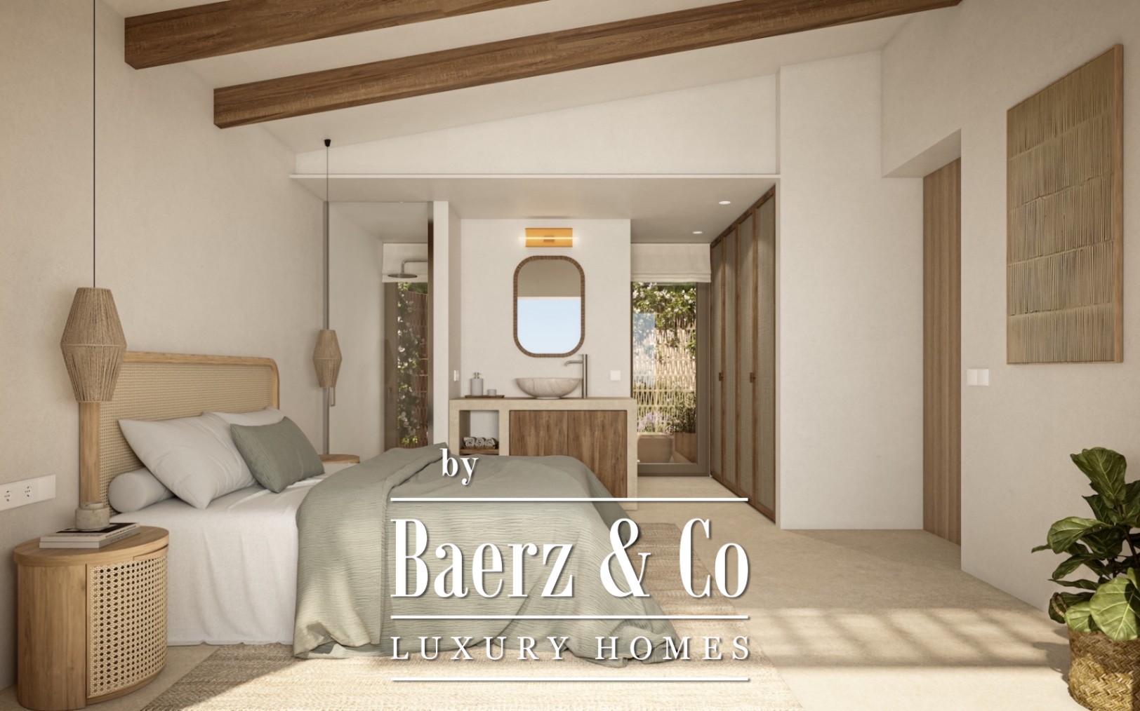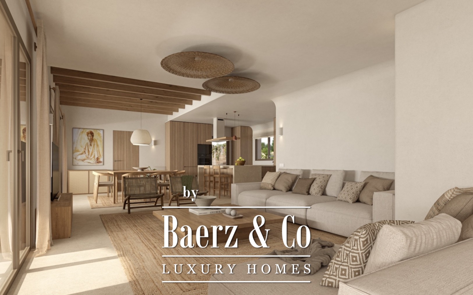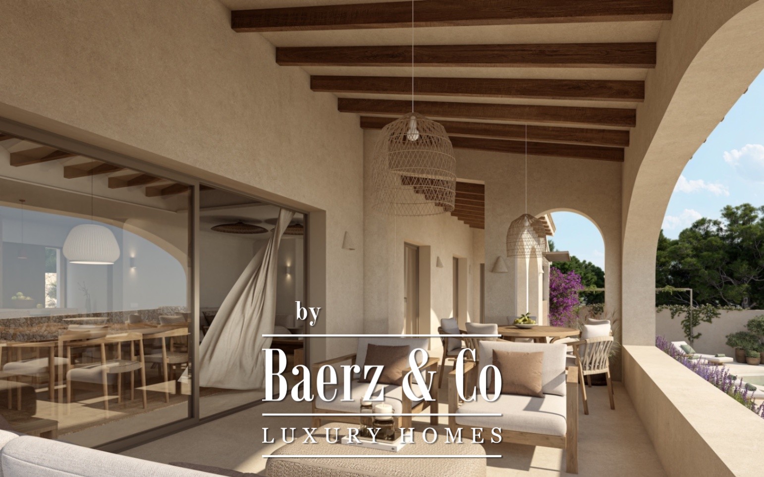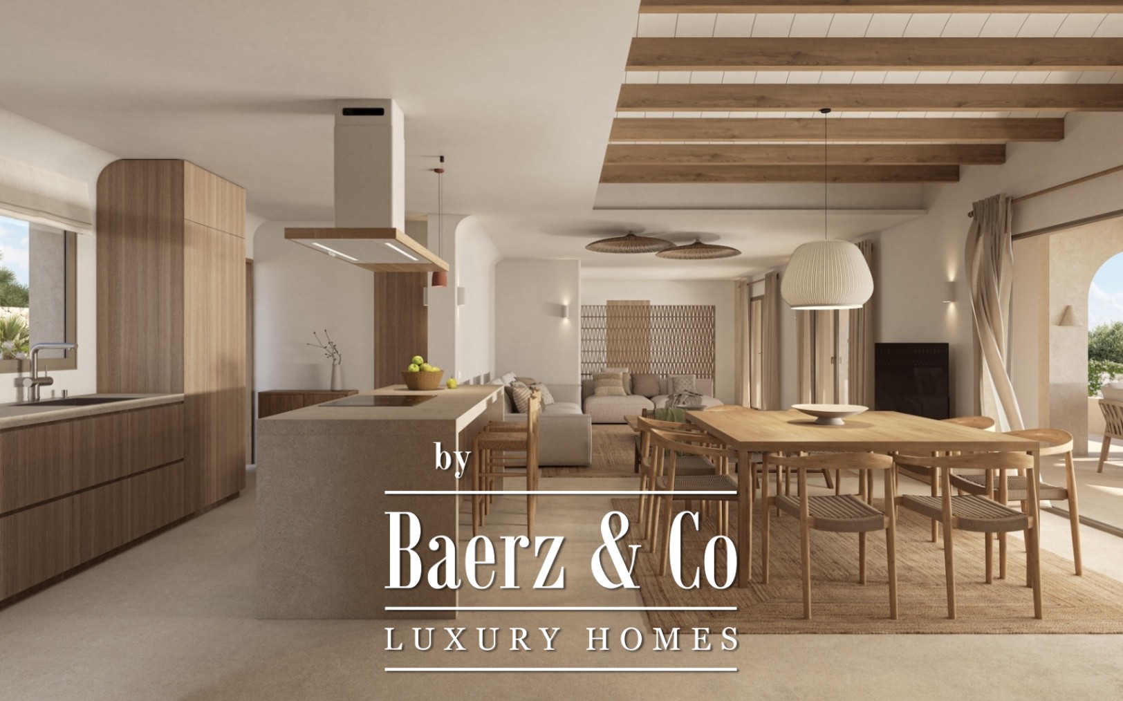 A covered parking area welcomes you, bordered by bougainvillea and latticework. Inside, the open-plan living, dining, and kitchen area is defined by visible wooden beams and lime-effect plasterwork, with soft natural tones throughout. The kitchen features a central island and Bosch appliances, supporting daily rhythm and gatherings, while large windows invite the outside in and flow seamlessly to a covered veranda and pool terrace.