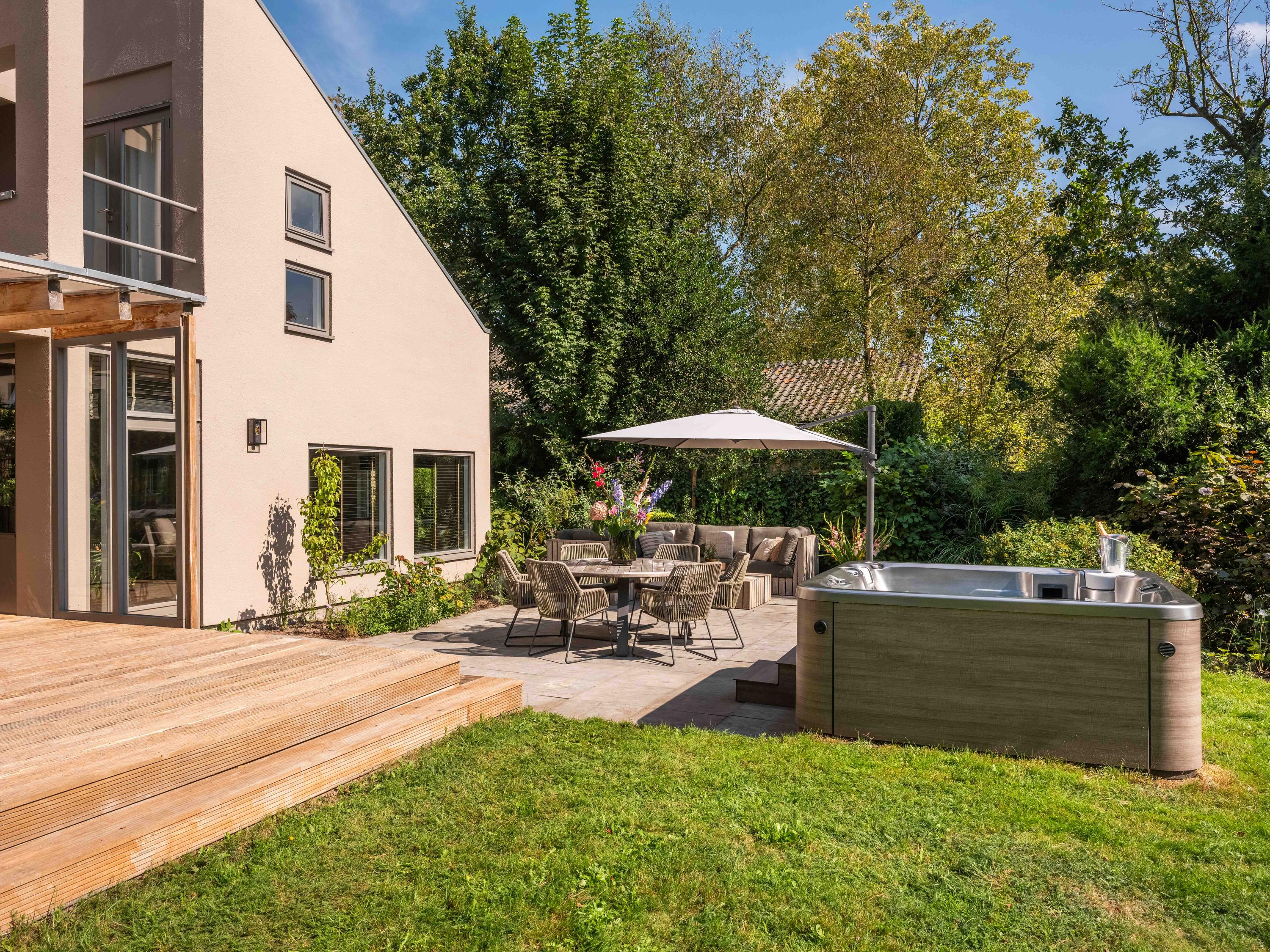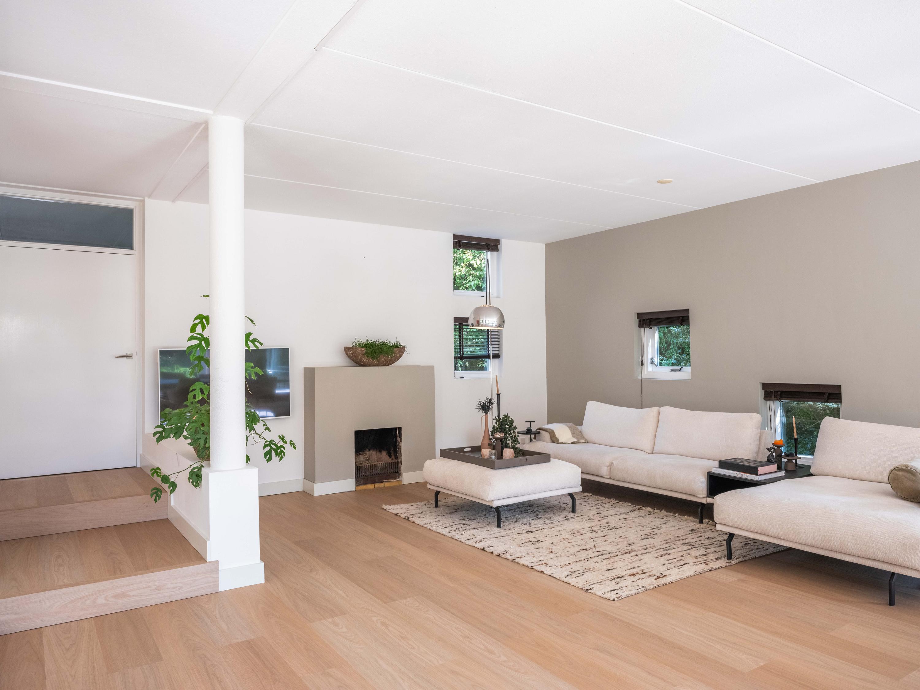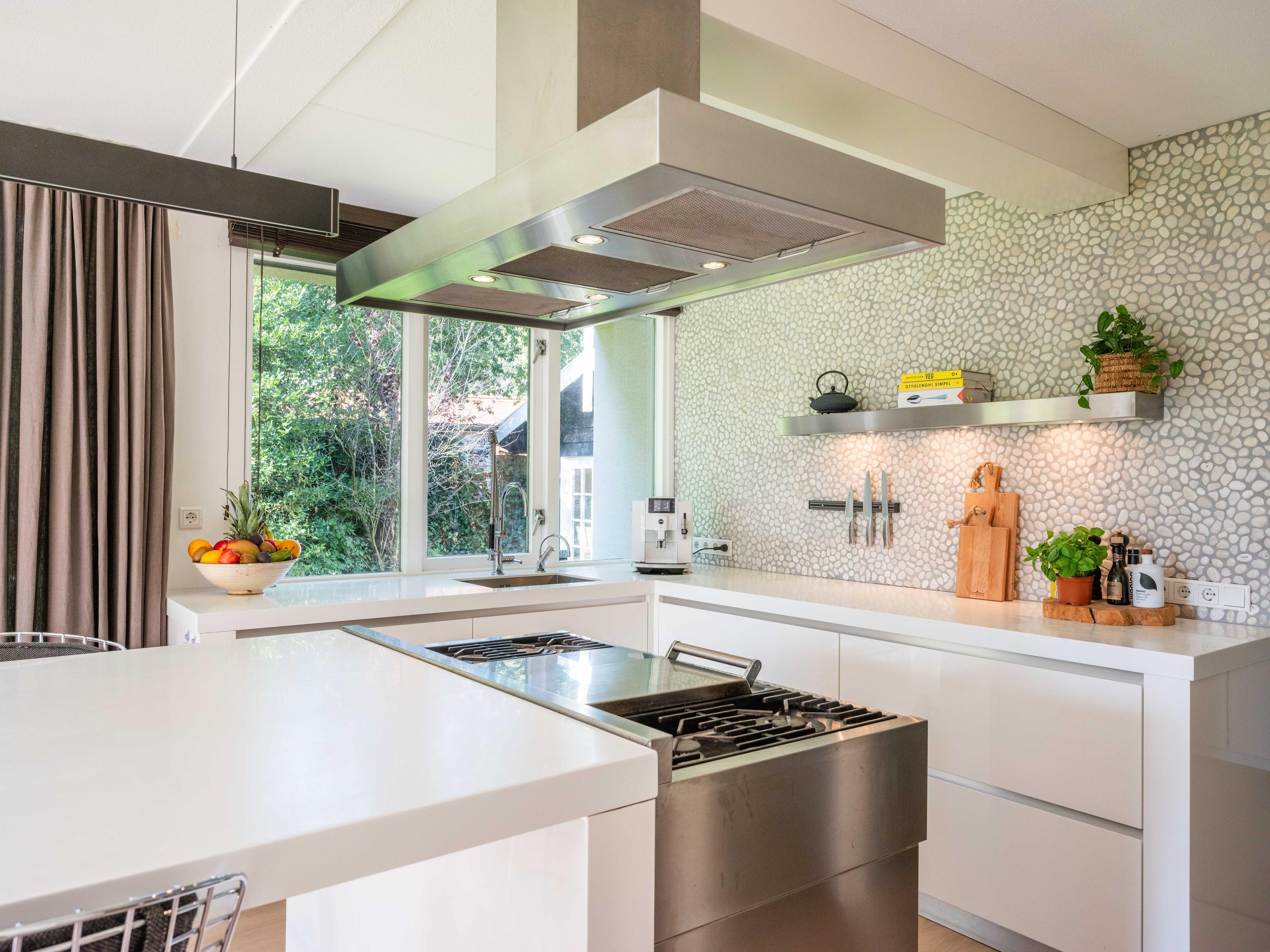 Main residence is a 344 m² architect-designed villa completed in 1984, exuding a calm, contemporary energy throughout. The generous living room captures daylight and open meadow prospect, complemented by a fireplace for evening warmth. In the kitchen, an island connects family gatherings with views of green, while French doors and a covered, heated terrace blur boundaries between indoors and out. Appliances include a quooker, professional stove with teppanyaki and deep fryer, steam oven, wine cooler, and more. Adjacent utility spaces offer further practicality.