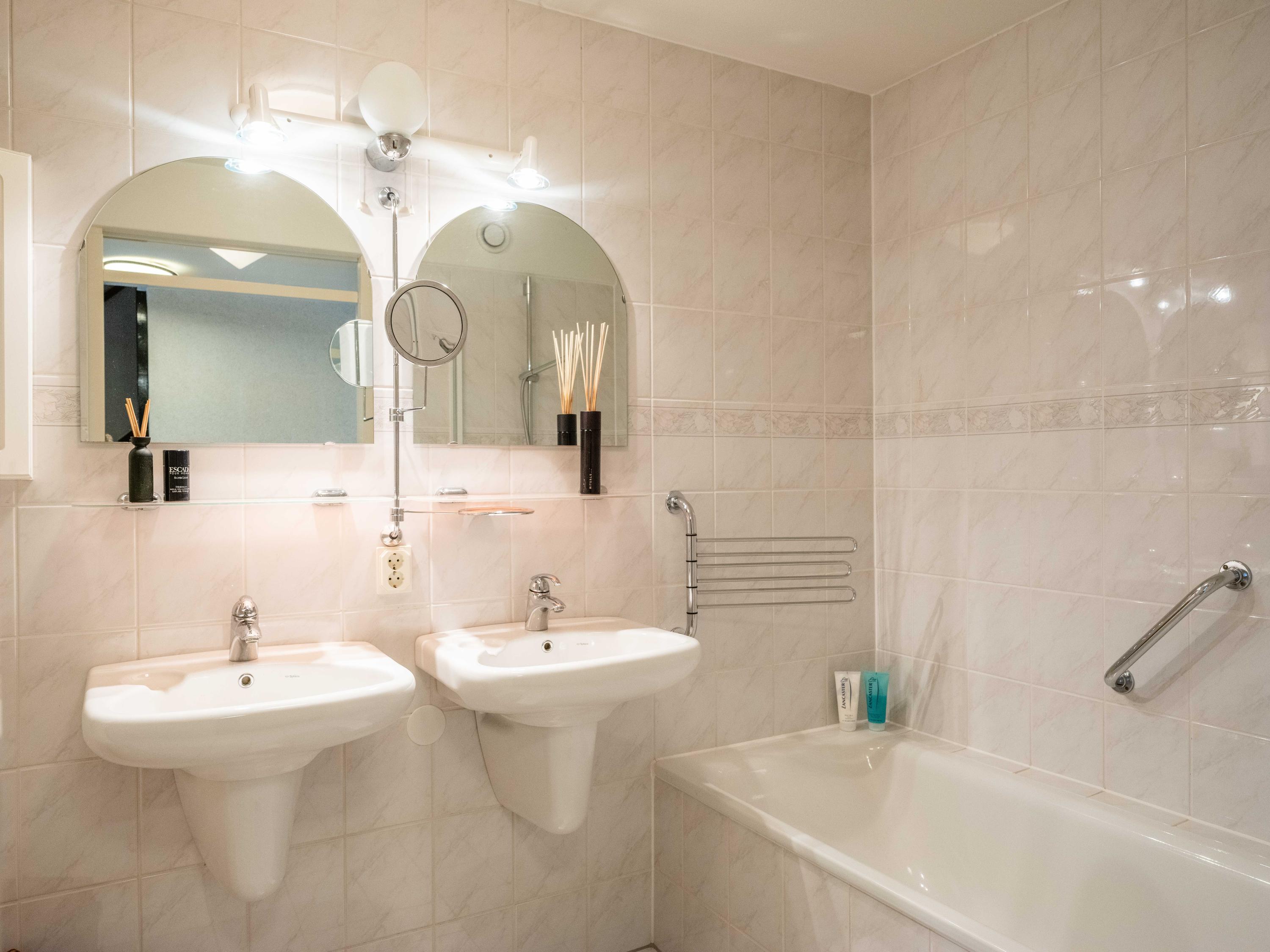 On the ground floor, you will also find a spacious room on the garden side, which can be used as an office, but is also ideal as a bedroom. The bathroom on the ground floor has a bathtub with shower, double sink, and toilet.