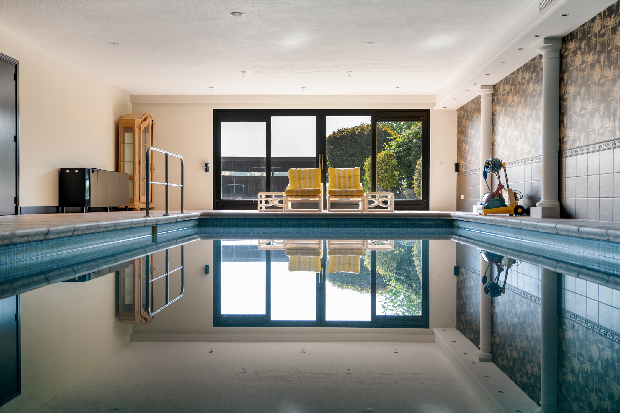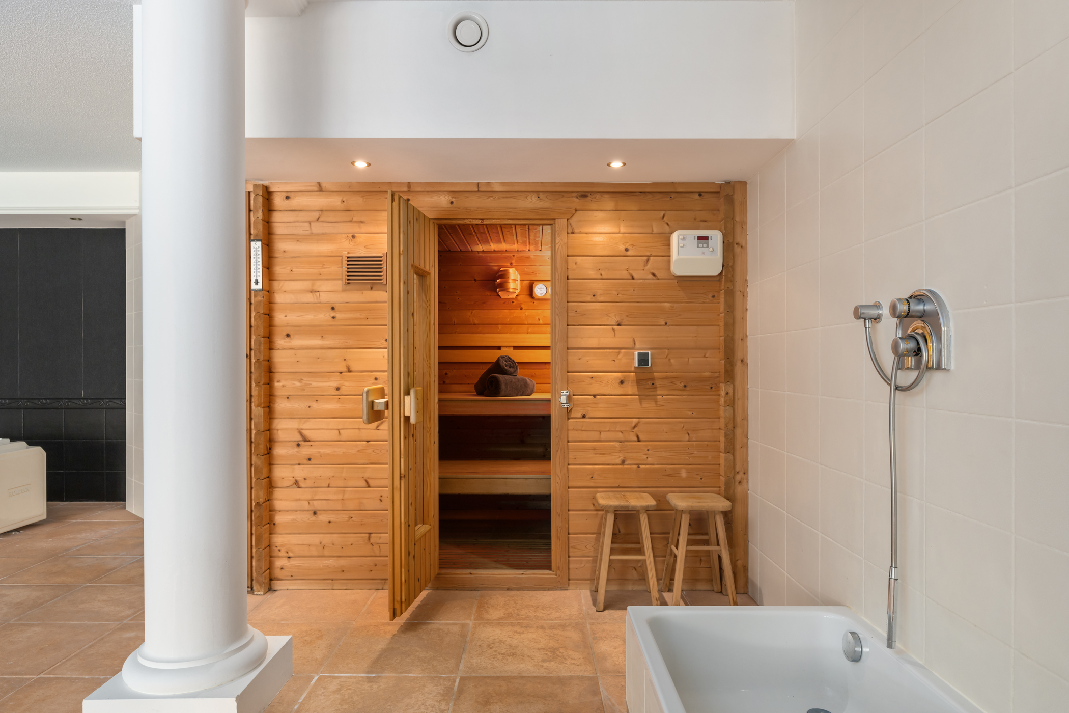 Through French doors, you enter the wellness area, which includes a technical room, pantry, sauna, toilet, and a luxurious indoor swimming pool. Sliding doors from the wellness area lead to the rear garden and the detached garage, which has a hobby greenhouse attached to the back.