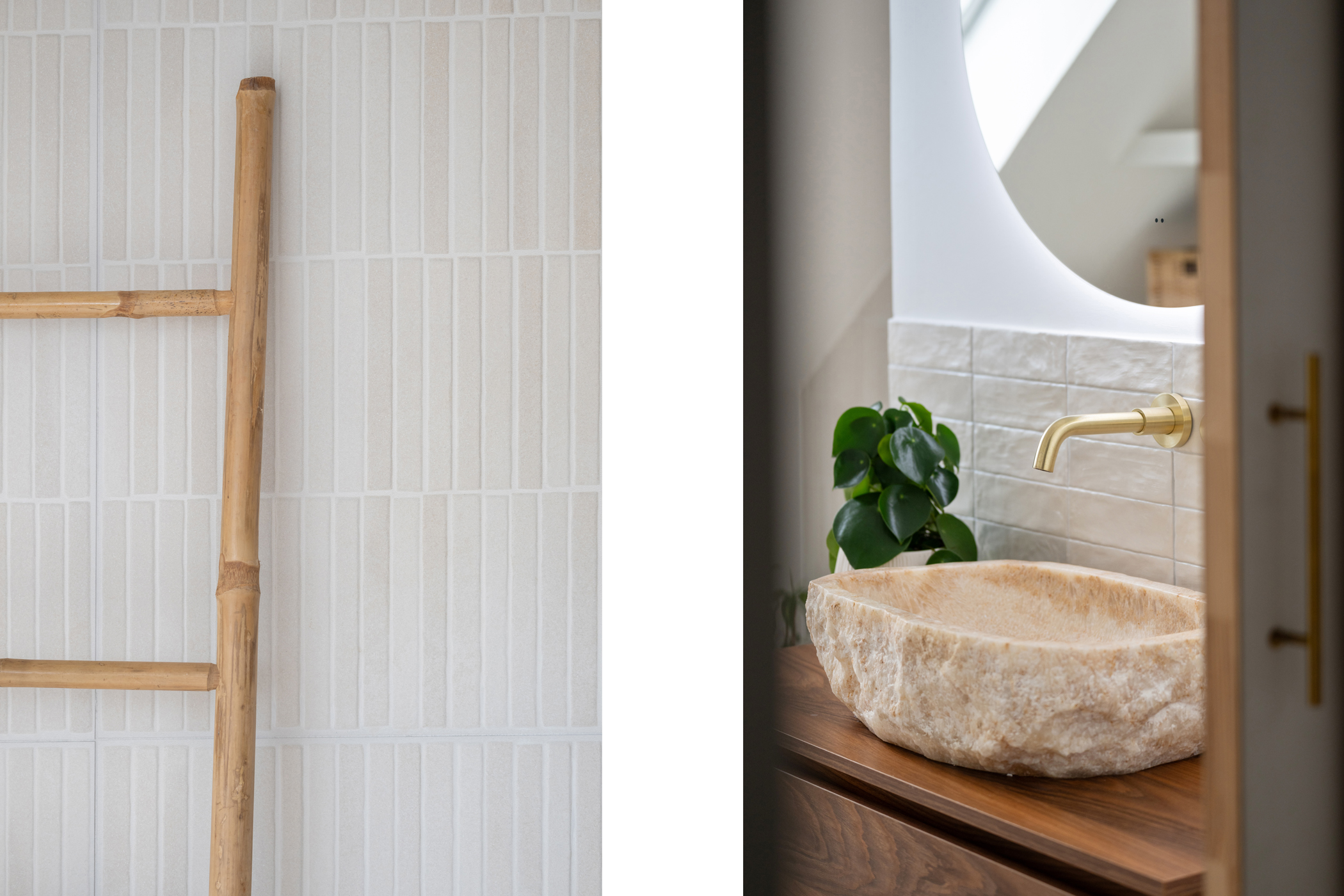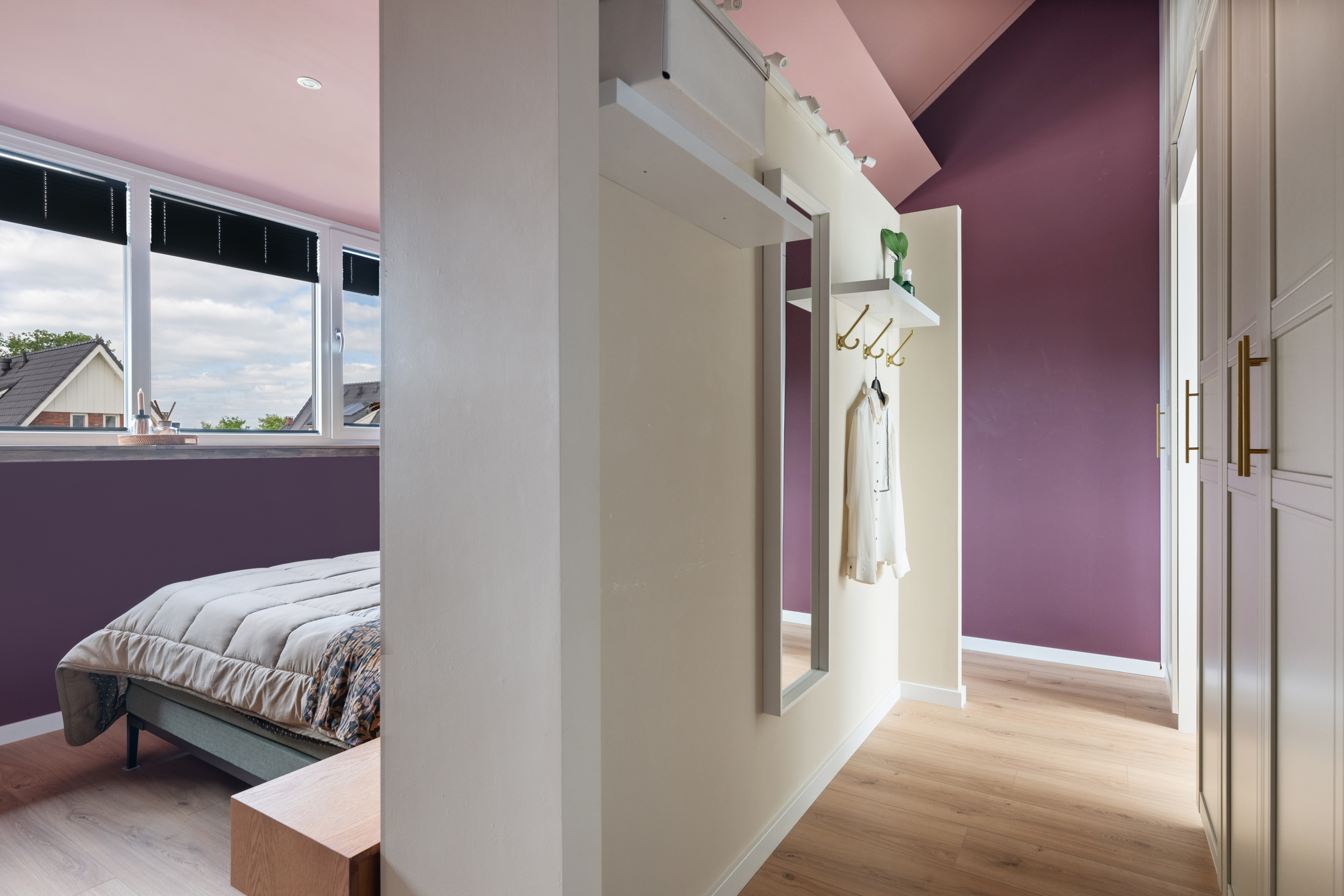 This room is particularly remarkable for the extensive built-in storage that reaches up to the high ceiling. This custom solution provides ample storage space, beautifully integrated yet always within reach. Additionally, extra storage is cleverly incorporated in a raised niche—perfect for suitcases and seasonal items.