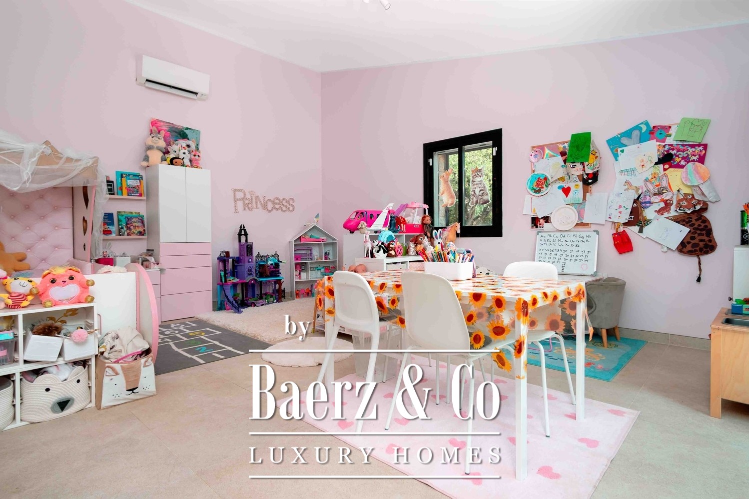 Set within an 11,000 m2 plot, the estate features panoramic views of the Tramuntana mountains and a seamless indoor-outdoor connection. Mediterranean light fills each room, while the grounds invite leisurely days beside the 12 × 6 m saltwater pool or evenings in the al fresco kitchen equipped with barbecue and pizza oven. Lush gardens with twelve varieties of fruit trees and an automated irrigation system surround the terraces, creating an atmosphere of cultivated ease.