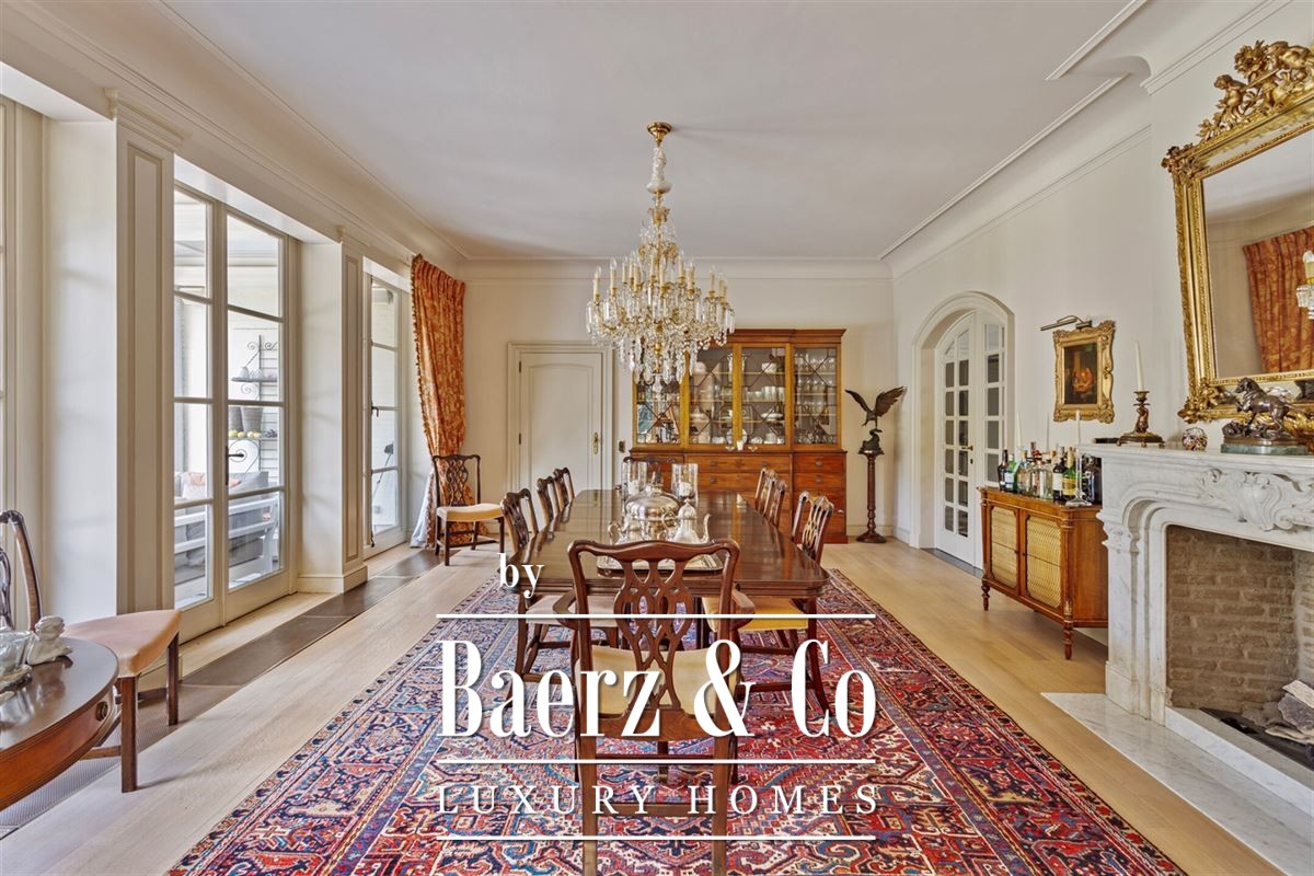 Aansluitend is een gezellige eetkamer, met een antieke Franse marmeren haard, beschikt over openslaande deuren die leiden naar een overdekt terras—de ideale plek voor al uw diners en bijeenkomsten.