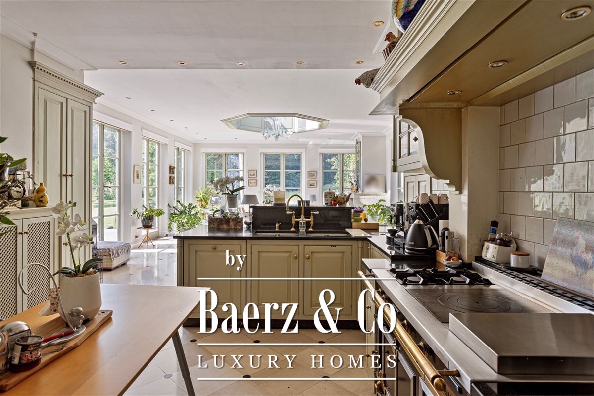 De Engelse leefkeuken van ca 90m², afgewerkt met een natuurstenen vloer, is uitgerust met een dubbele spoeltafel, een groot gasfornuis met oven en voldoende bergruimte.
