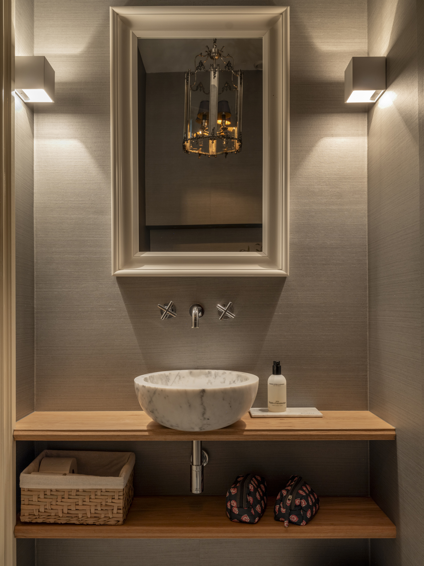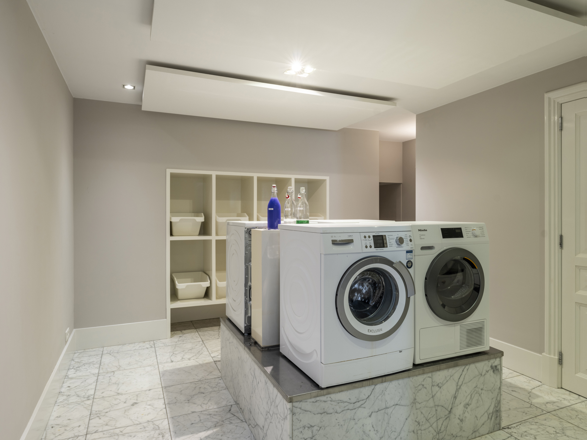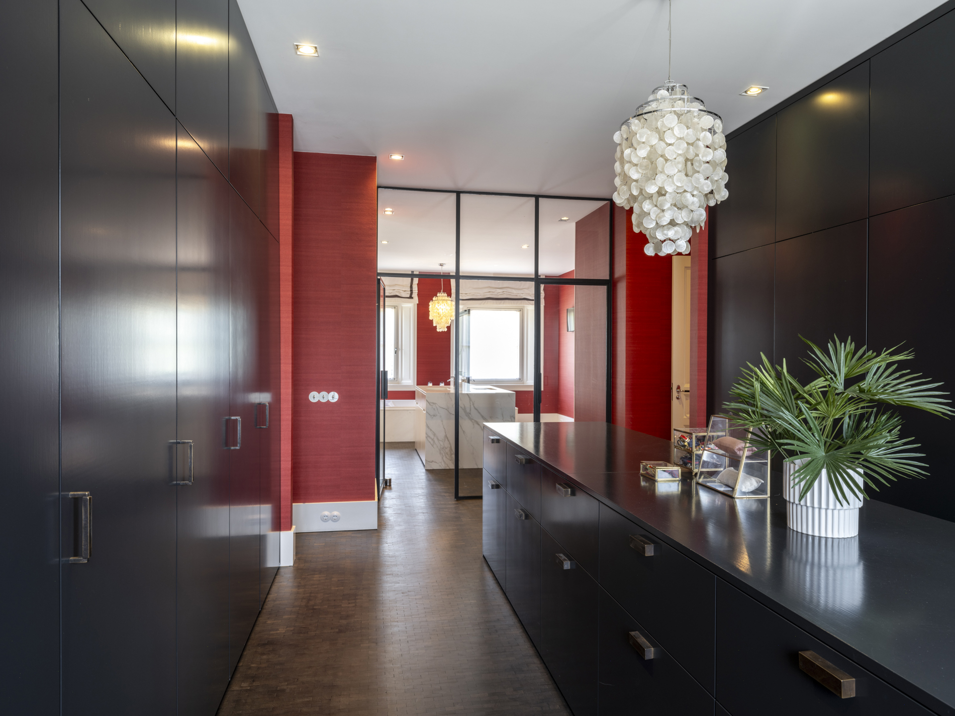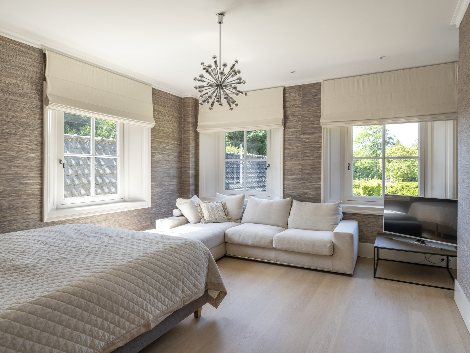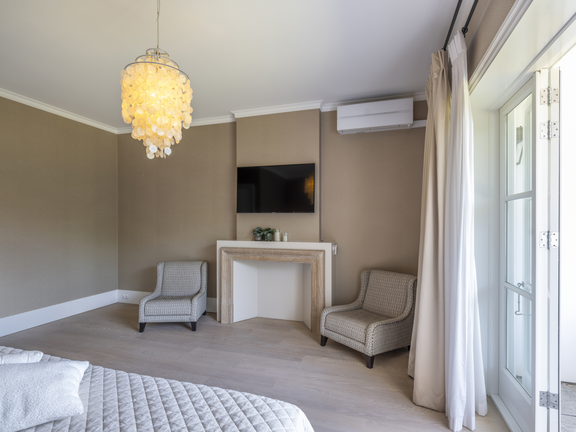 The main level flows from a stately entrance into luminous, open-plan living and dining spaces, anchored by a luxury kitchen whose glass walls draw the garden inside. A covered veranda with an open fireplace extends this sociable core into the landscape, while a quiet study and dedicated TV/work rooms balance retreat and connection. All seven bedrooms are air-conditioned, with the master suite offering both a garden-view balcony and a spacious dressing room adjacent to a double bathroom. The upper floors and attic grant additional bedrooms, private guest suites, refined bathrooms, and tailored storage throughout.