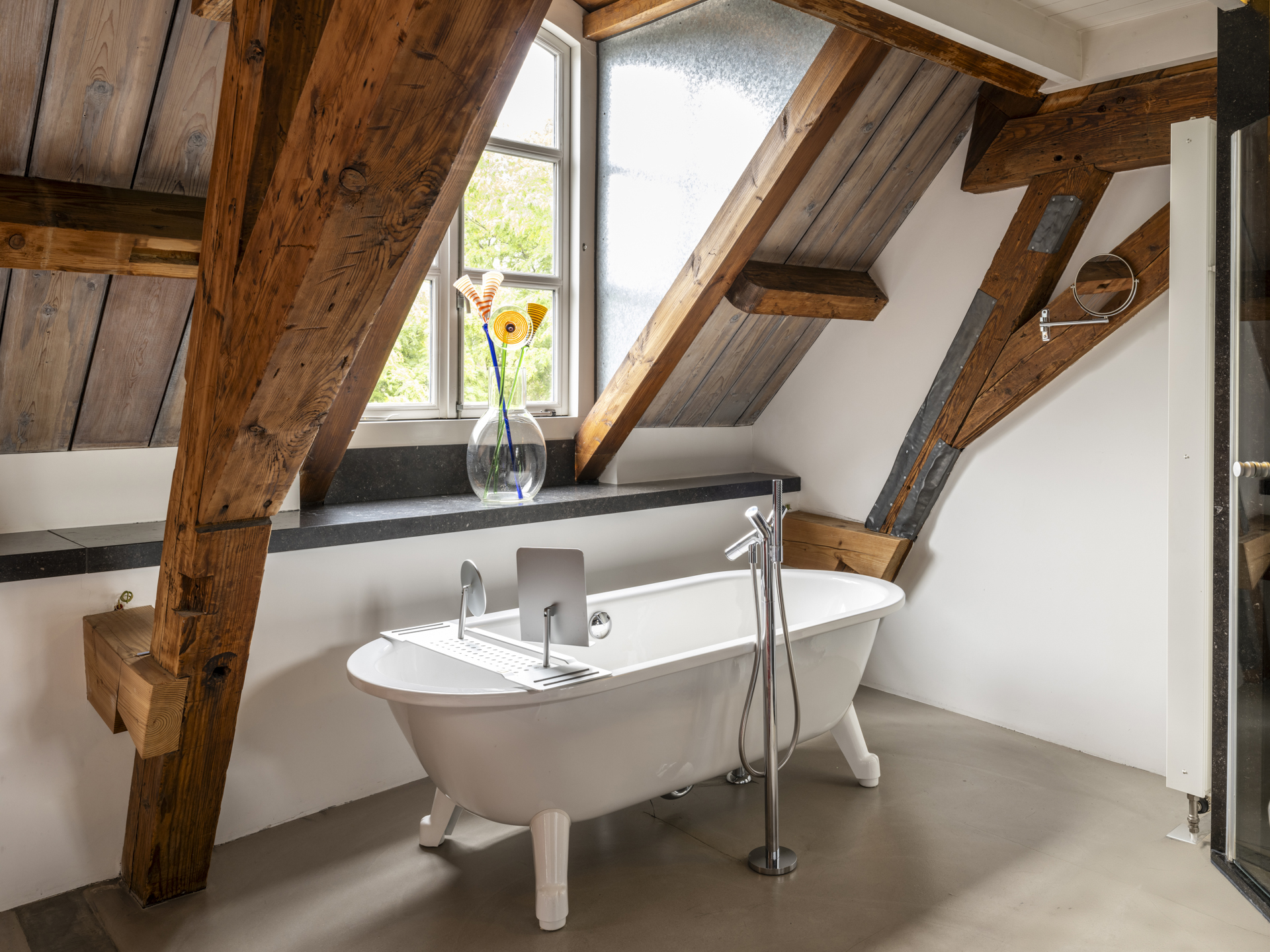 Generously proportioned, the living area unfolds across 60 m² with a full glass wall revealing the Grote Kerk of Breda. The open kitchen, fitted with a wide gas stove, stainless steel extractor, and island, provides views of Kasteelplein and Valkenberg. The principal bedroom, approximately 55 m², offers access to dual walk-in wardrobes beneath original wooden beams. The bathroom features a freestanding tub, natural stone-finished shower, and double basins.