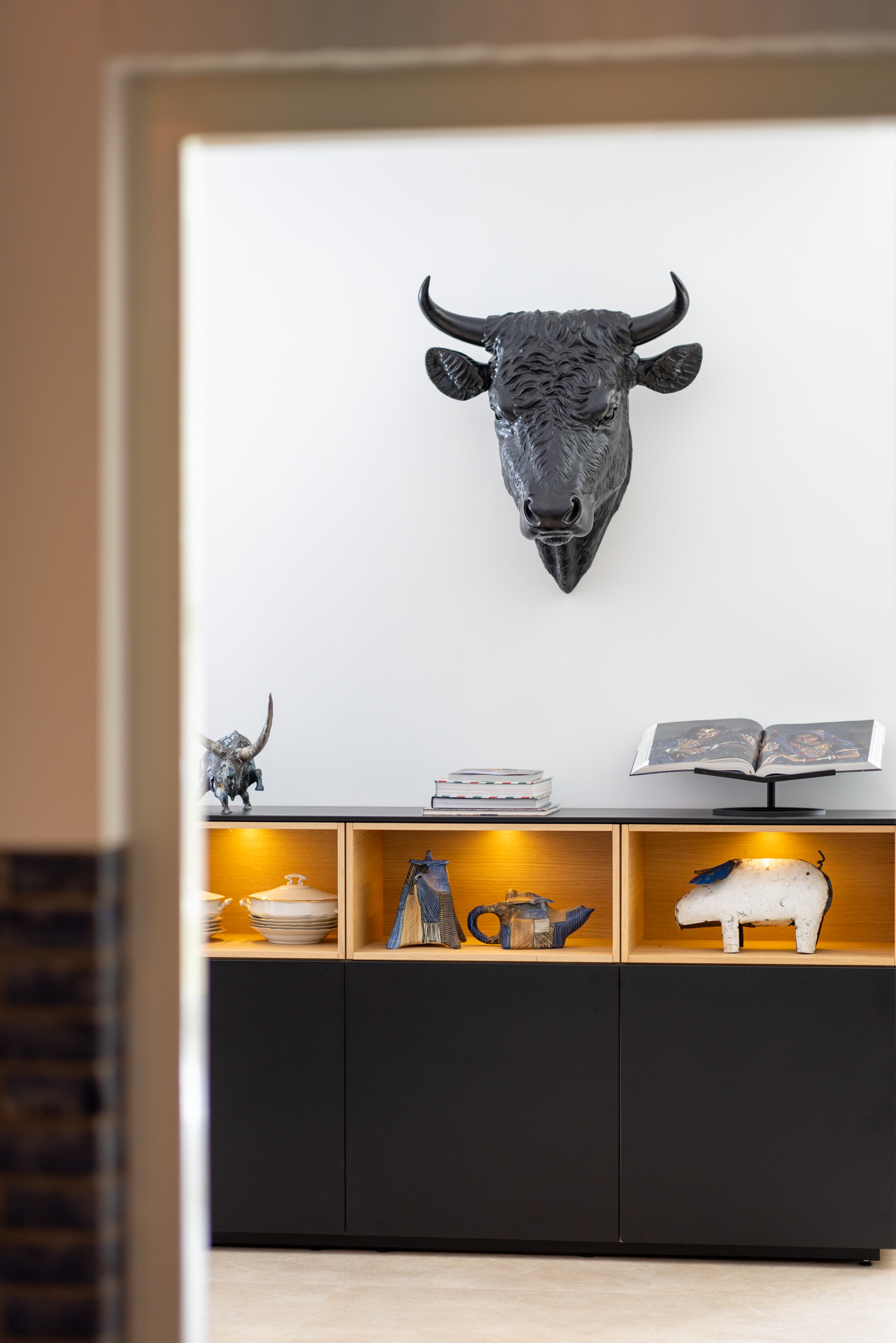 The main level is anchored by a generous living room illuminated by garden-facing windows and a gas fireplace, setting a relaxed rhythm for daily life. The custom-crafted kitchen by Antonissen Interior features premium Gaggenau appliances and connects intuitively to a covered terrace with a second outdoor kitchen, perfect for gathering throughout the seasons.