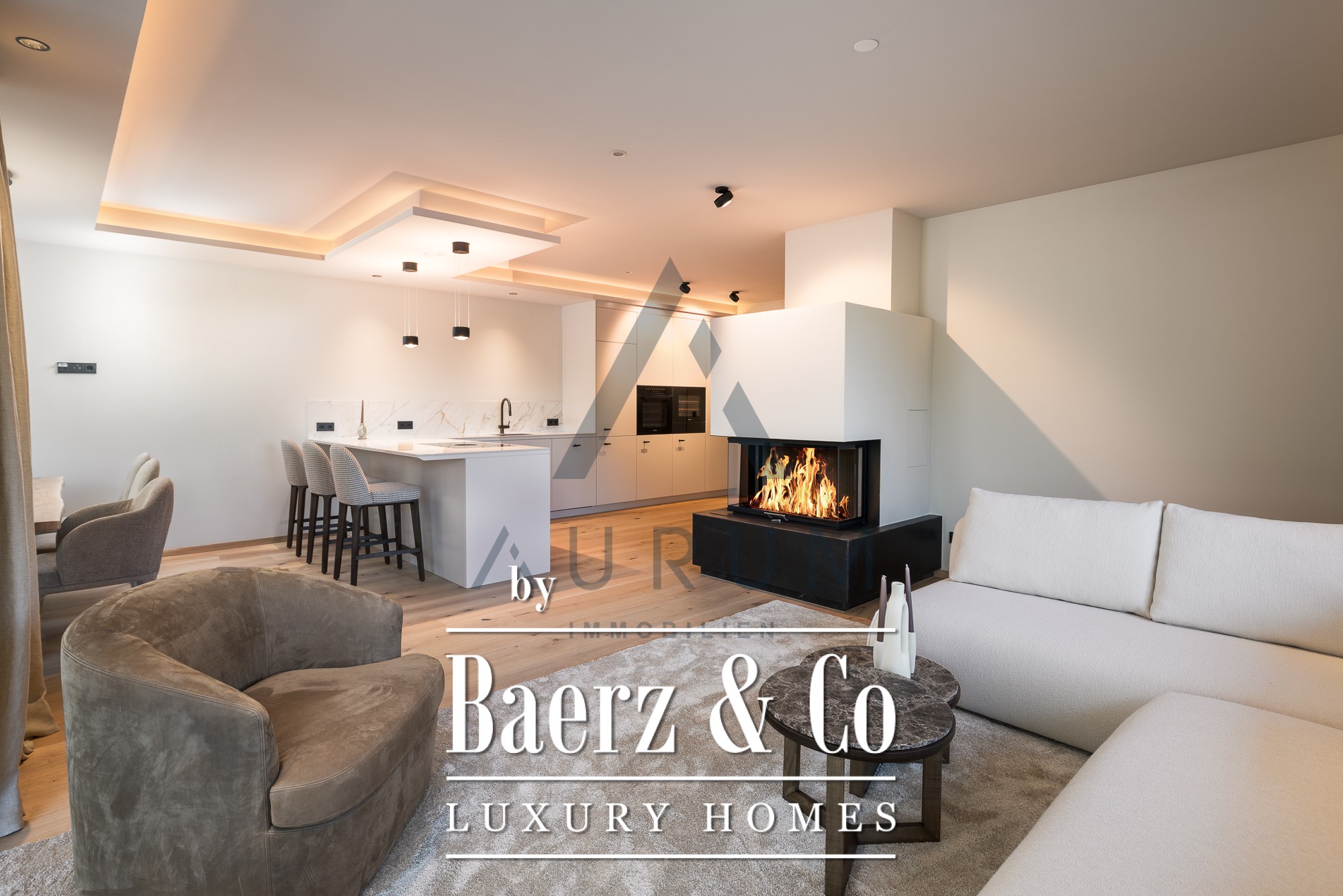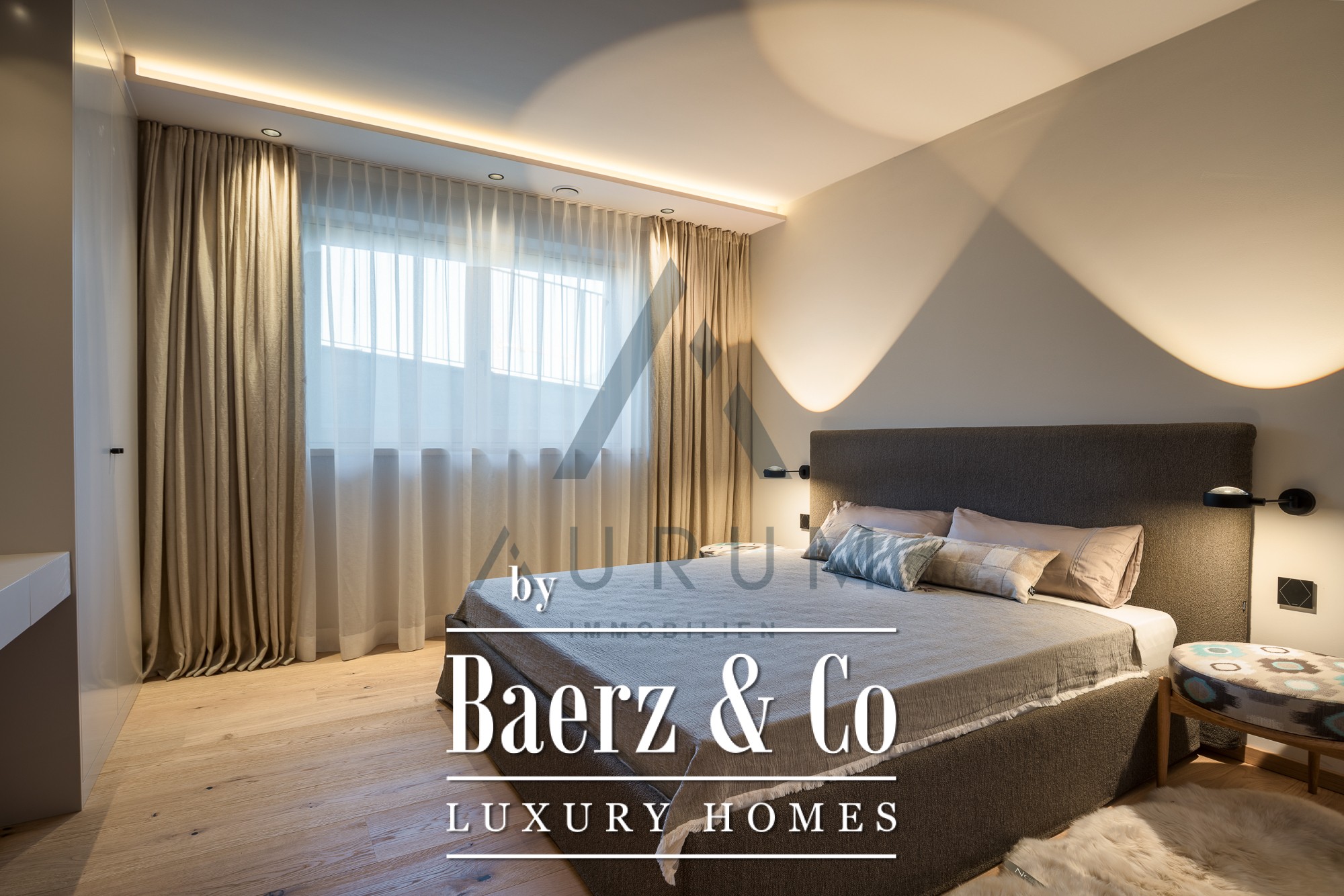 Within its 123 m² of living space, two bedrooms and two bathrooms integrate harmoniously with expansive living areas and a sauna, creating a sense of openness anchored by elemental materials and careful spatial planning. Floor heating ensures year-round comfort, while the Loxone BUS system and motorized blinds add contemporary efficiency. A guest WC, elegant lift access, and basement storage support daily living with seamless flow.