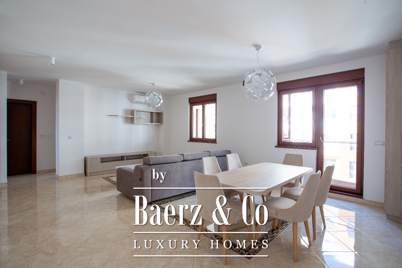 Spanning 95 m² plus a 25 m² terrace, this apartment features a luminous living room with a kitchen and dining area, three bedrooms, two bathrooms, and a terrace overlooking dramatic sea and mountain panoramas. The interiors are fully furnished, allowing for immediate occupancy. There is an optional private parking space available, with pricing reflective of size, serving those who prioritize secure access.