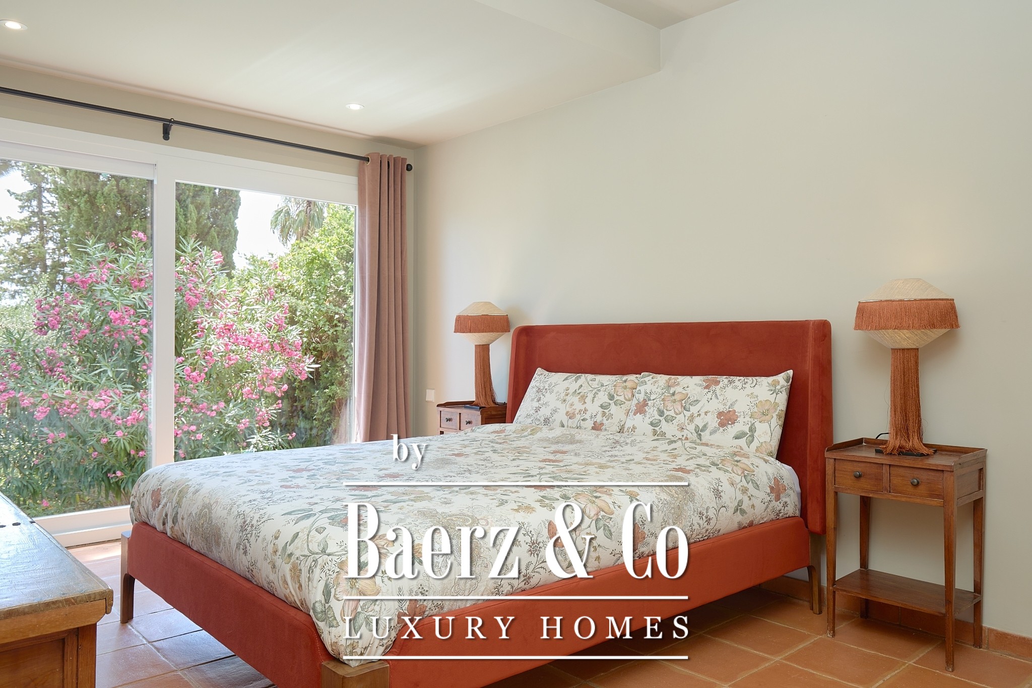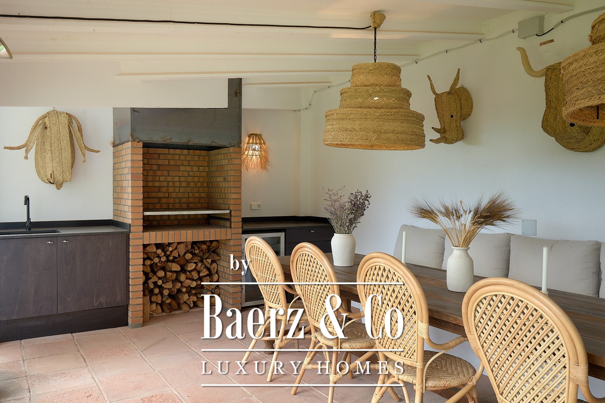A separate loft-style guest house provides guests with complete autonomy, including its own kitchen and bathroom. Outside, a new swimming pool, solarium, landscaped gardens, and a covered dining and barbecue area evoke authentic Mediterranean retreat. A large private garage accentuates practical luxury.