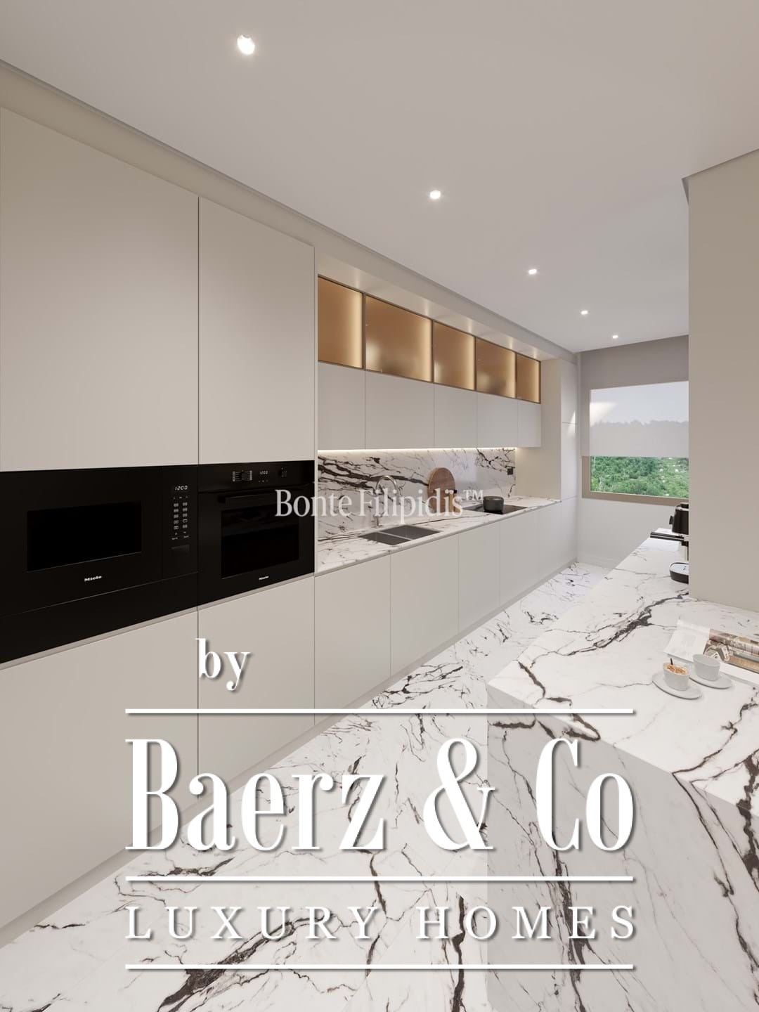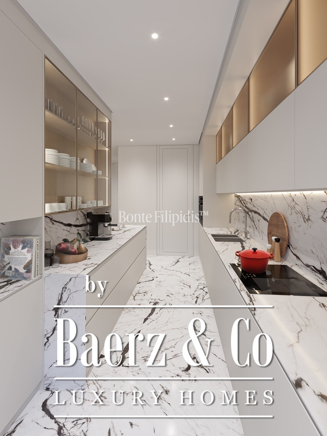 The layout divides social and private areas, with expansive living and dining spaces bathed in natural light, flowing directly onto the terrace. The kitchen is fully appointed with integrated appliances, marble work surfaces and bespoke cabinetry, offering both functionality and subtle elegance. Two bedroom suites are positioned for privacy, complemented by a guest bathroom also finished in marble and contemporary fittings.