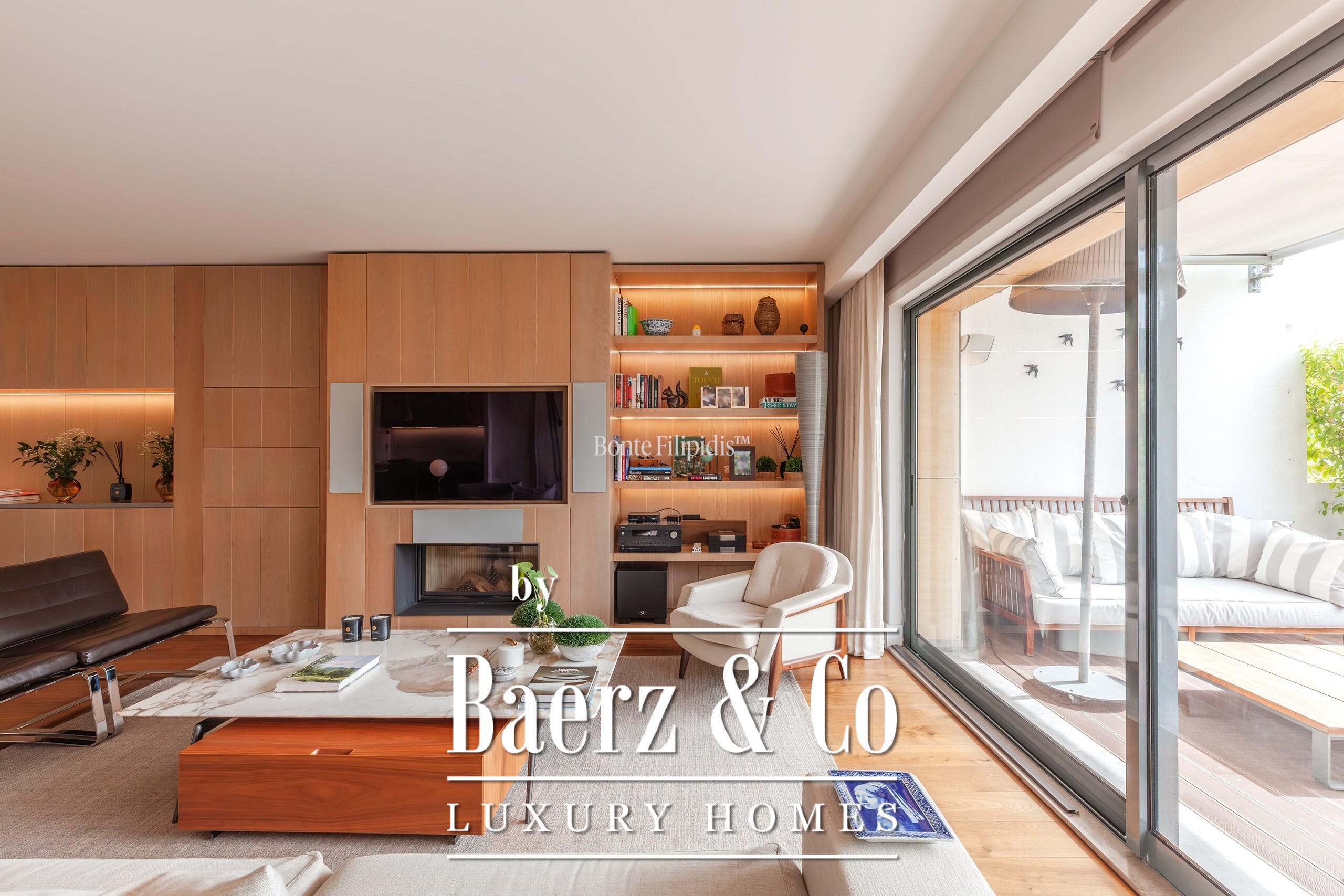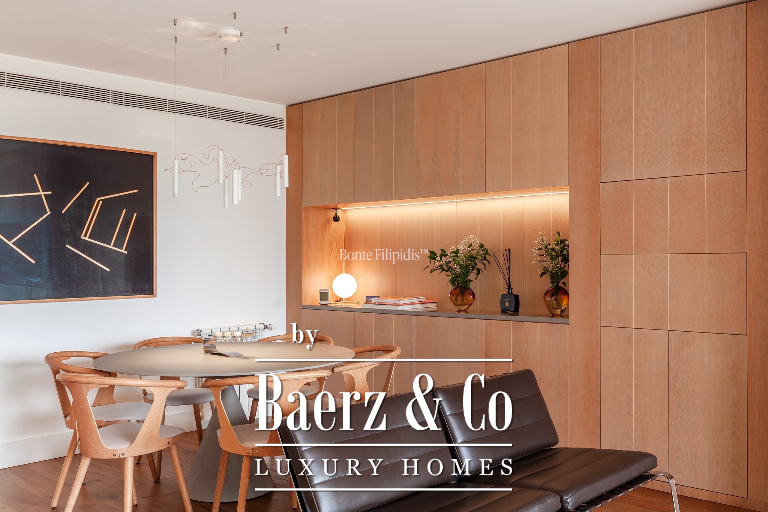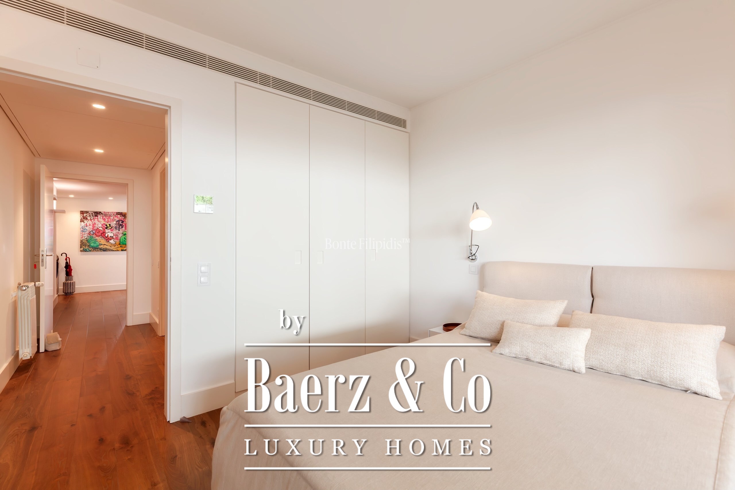 The apartment comprises three bedrooms, including a private suite, and three bathrooms, retaining an understated atmosphere of comfort and privacy. A fully equipped kitchen anchors the space for living and entertaining. Essential amenities include air conditioning, central heating, storage, and two indoor parking spaces, underscoring a seamless, modern lifestyle.