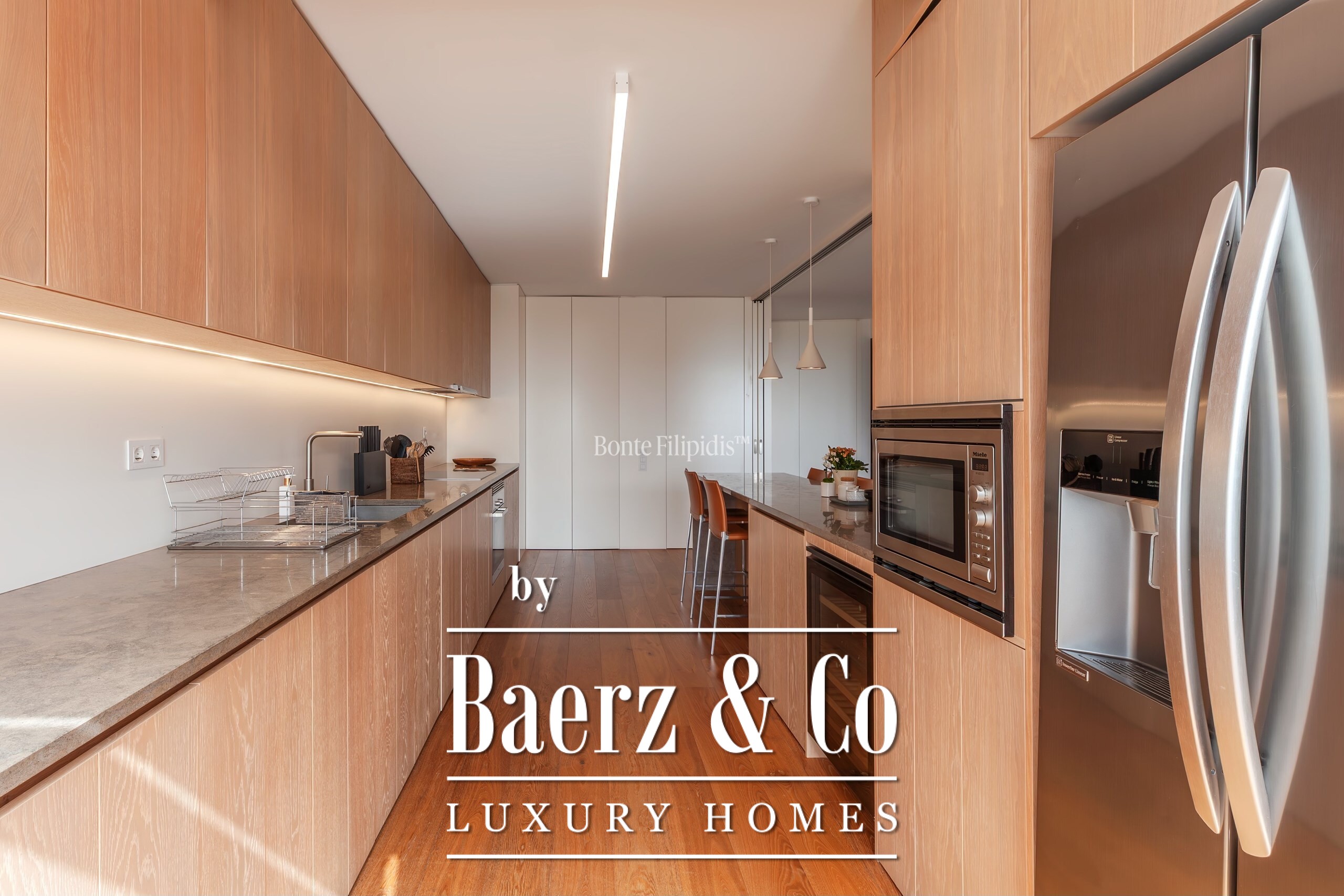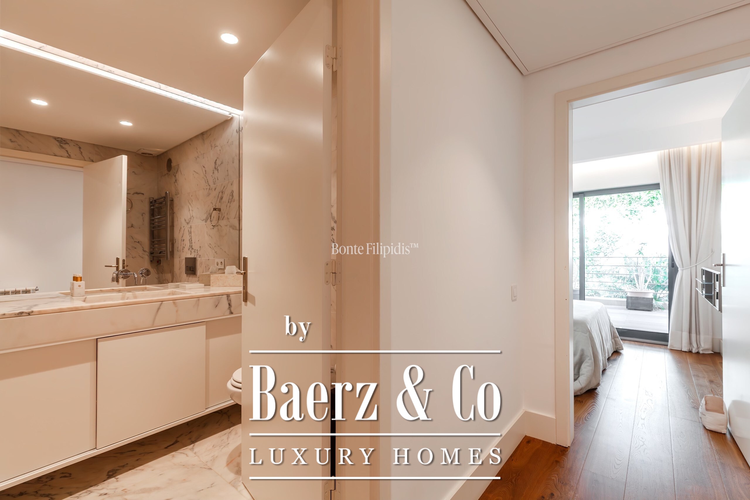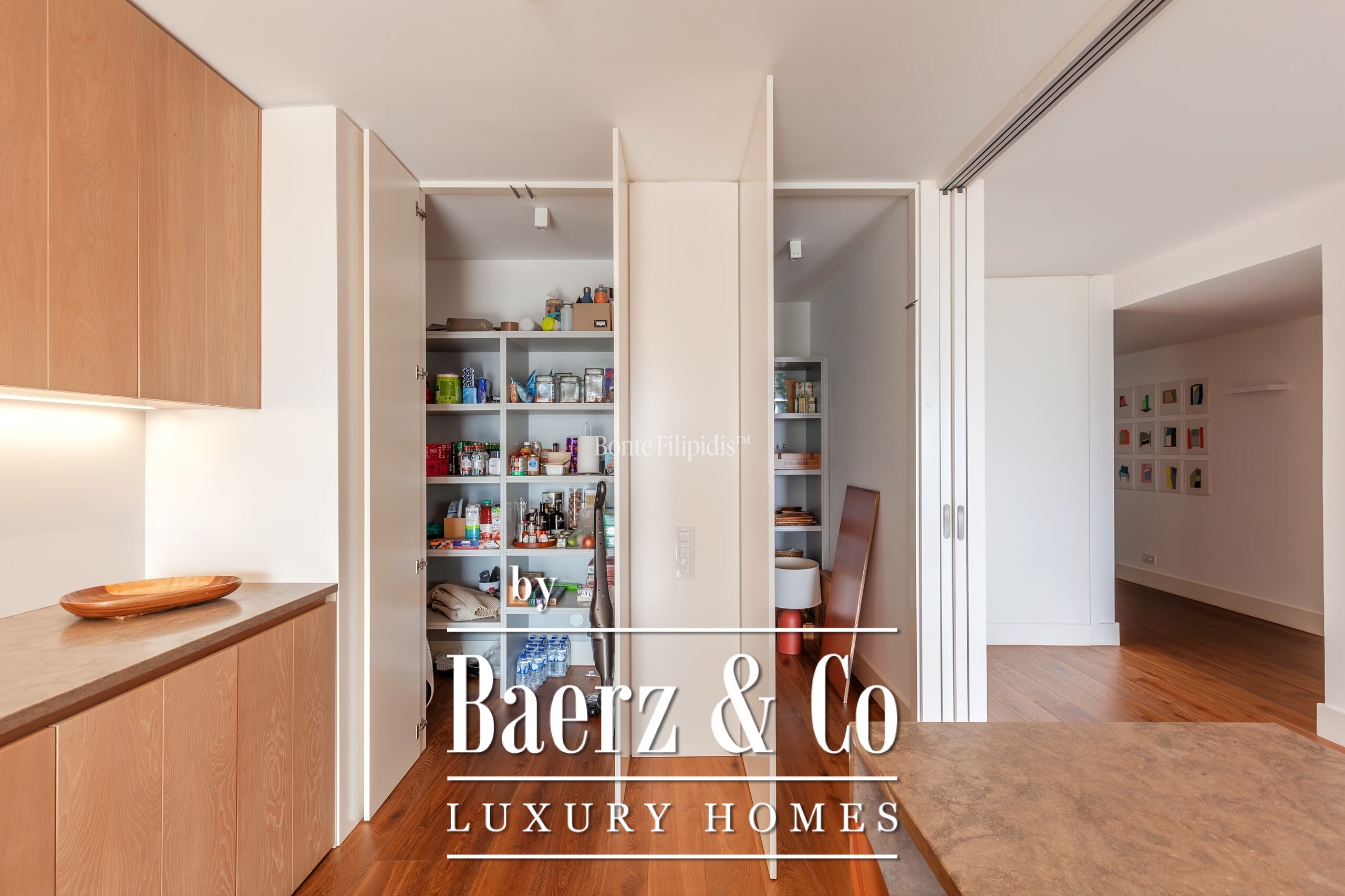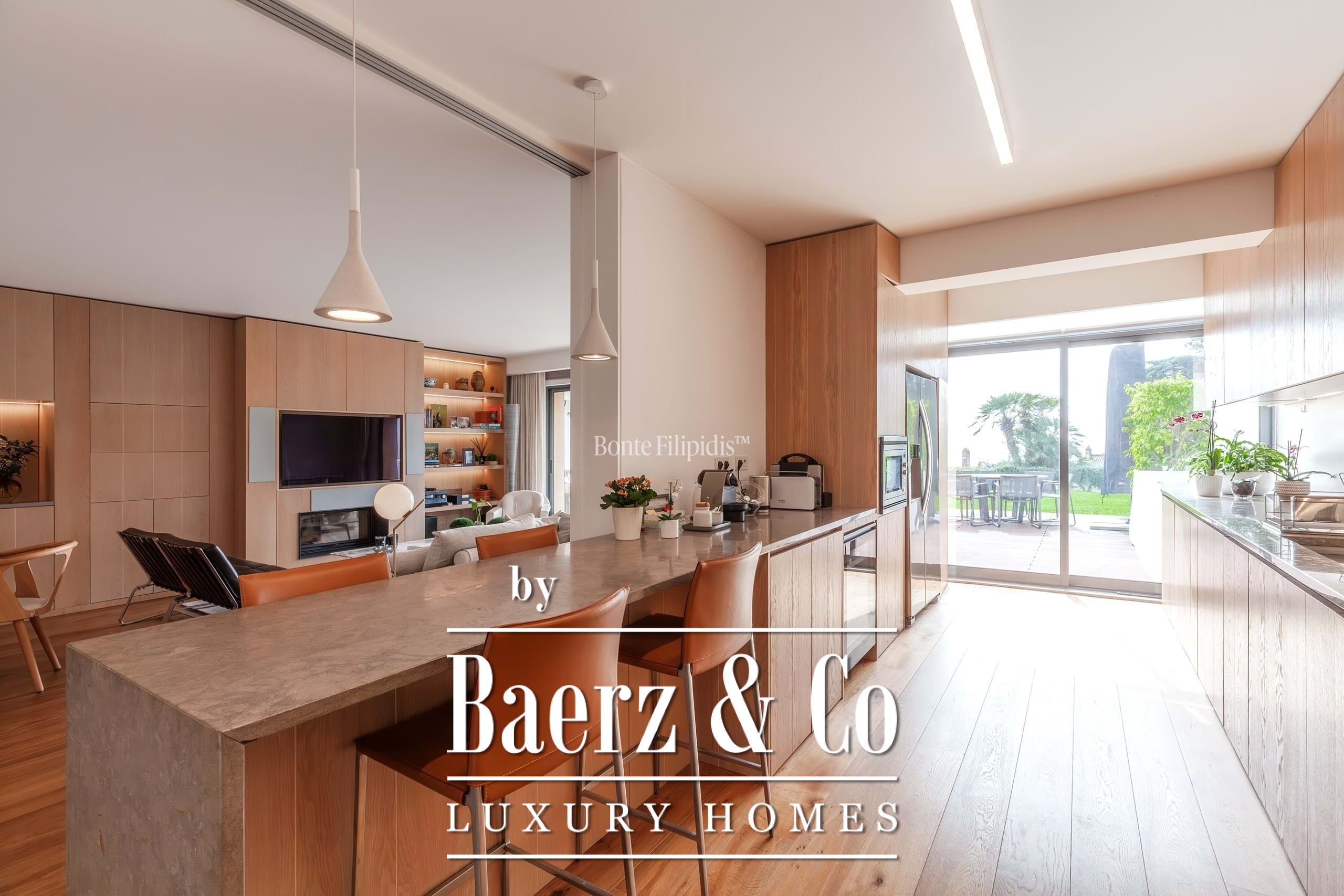 The apartment comprises three bedrooms, including a private suite, and three bathrooms, retaining an understated atmosphere of comfort and privacy. A fully equipped kitchen anchors the space for living and entertaining. Essential amenities include air conditioning, central heating, storage, and two indoor parking spaces, underscoring a seamless, modern lifestyle.