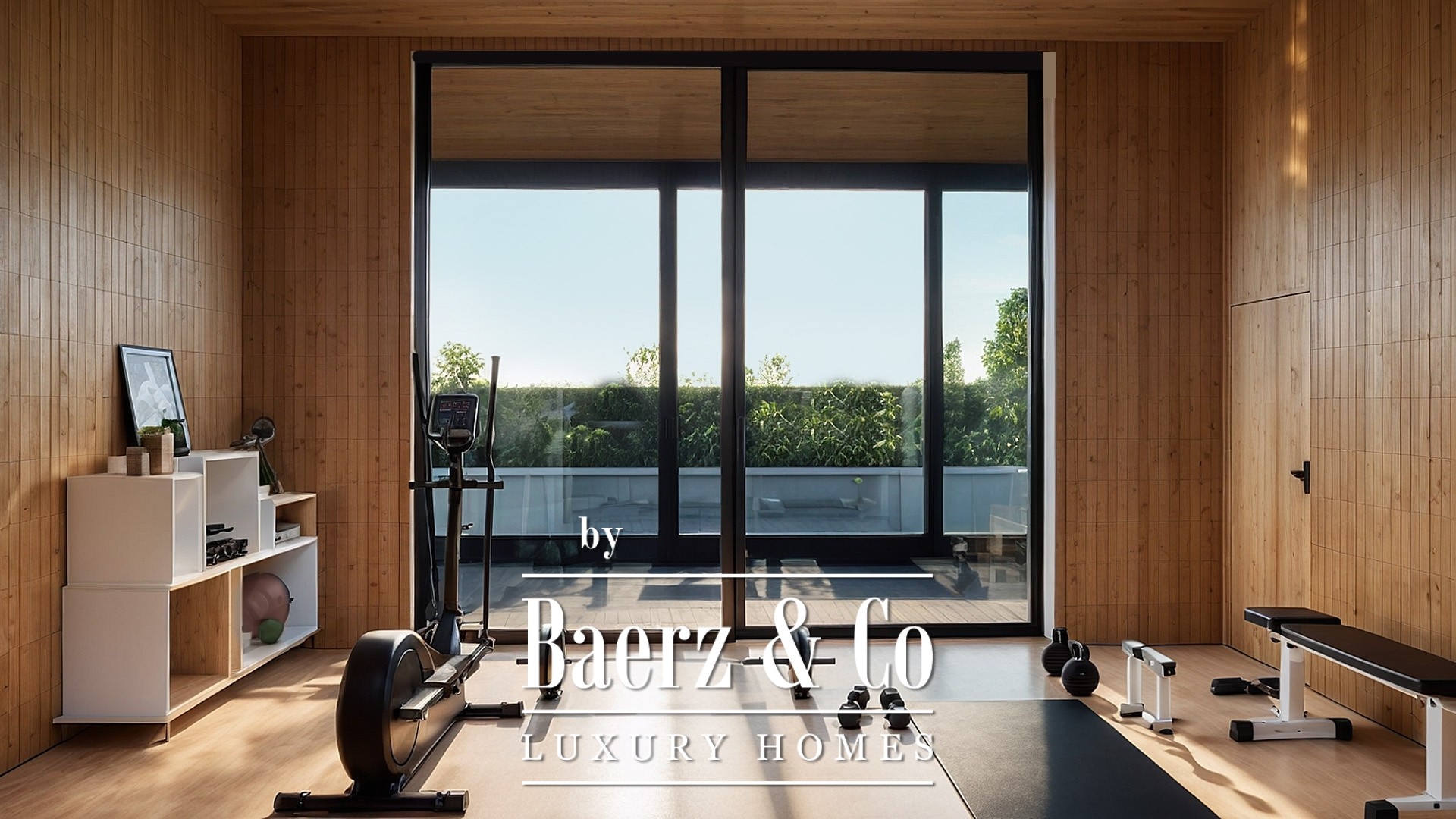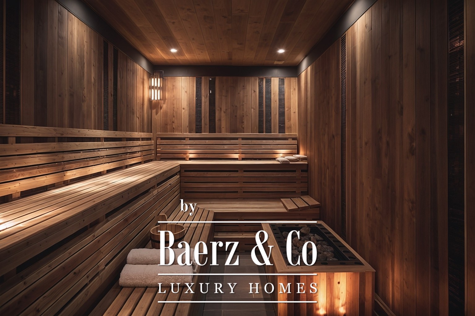 Each level is crafted for flow and discretion. The basement features a garage for up to four cars, a full bathroom with sauna, and a versatile room suited for cinema or sport. The ground floor’s double-height living area opens seamlessly onto a sunlit garden and swimming pool, with an open kitchen and two guest suites extending directly to the outdoors. Upstairs, two further double bedrooms and a dedicated fitness room complement the 34 m² master suite, which enjoys open views across the treetops. At the apex, a panoramic attic terrace with sea views and a rooftop pool-jacuzzi invites relaxation or private gatherings.