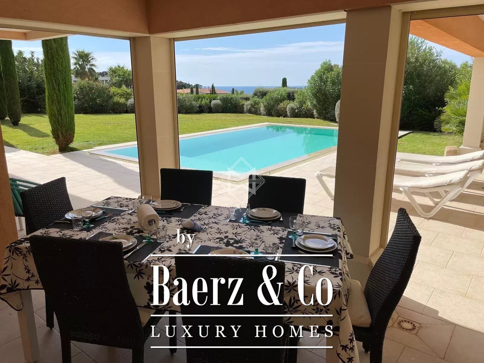 Nestled in a peaceful and privileged environment in Cavalaire-sur-Mer, within a secure and gated estate close to the beach, this South-West facing architect-designed villa combines elegance, space, and light, with beautiful open views and glimpses of the Mediterranean.