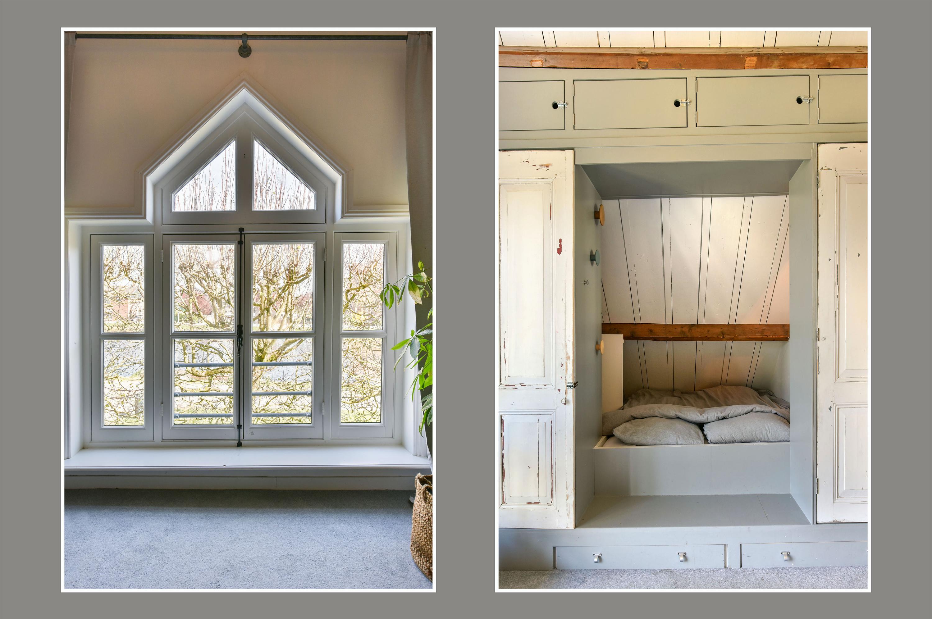 At the front is a fourth, full-width bedroom – a true showpiece with a unique window and a built-in box bed created by artist Rob Vrijen. Old doors from the original farmhouse are integrated into the surrounding cabinets – a beautiful nod to the home’s history.