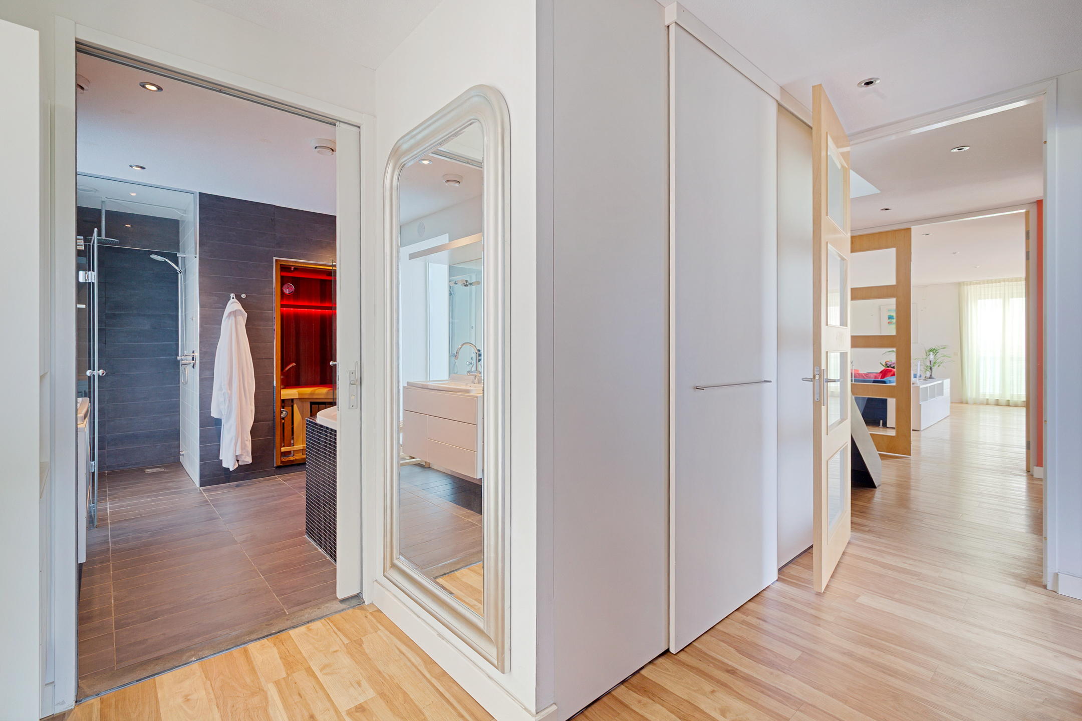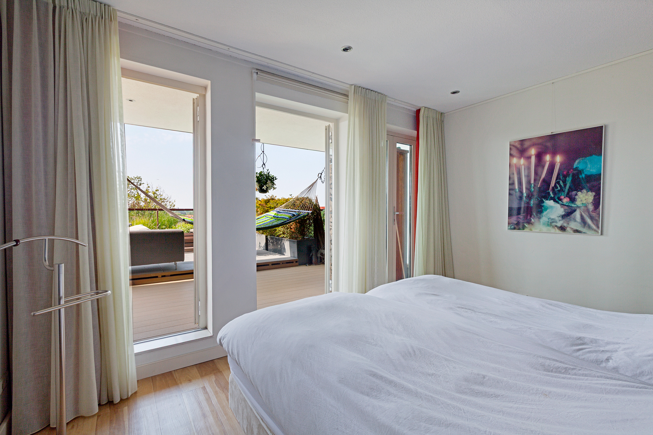 Entrance to the apartment. Spacious hallway providing access to various rooms. Exceptionally large living room with a cozy seating area and a large fireplace/stove. The bright dining area immediately stands out due to the unique ceiling height of no less than 5.50 meters, thanks to the mezzanine! During construction, this height was deliberately created to allow for the installation of a striking chandelier. The dining area provides access to a lovely sunroom on the terrace and to the open kitchen. The kitchen is modern, offers ample cupboard space, and is equipped with luxurious built-in appliances, including a fridge, freezer, microwave, oven, induction cooktop, extractor hood, dishwasher, and Quooker. The master bedroom is located on the northeast side of the apartment and is beautifully furnished with ample built-in wardrobes. From this bedroom, you can access a luxurious and spacious bathroom equipped with a walk-in shower, (whirlpool) bath with star ceiling, sauna, toilet, and a vanity unit – a wonderful space to fully unwind.
