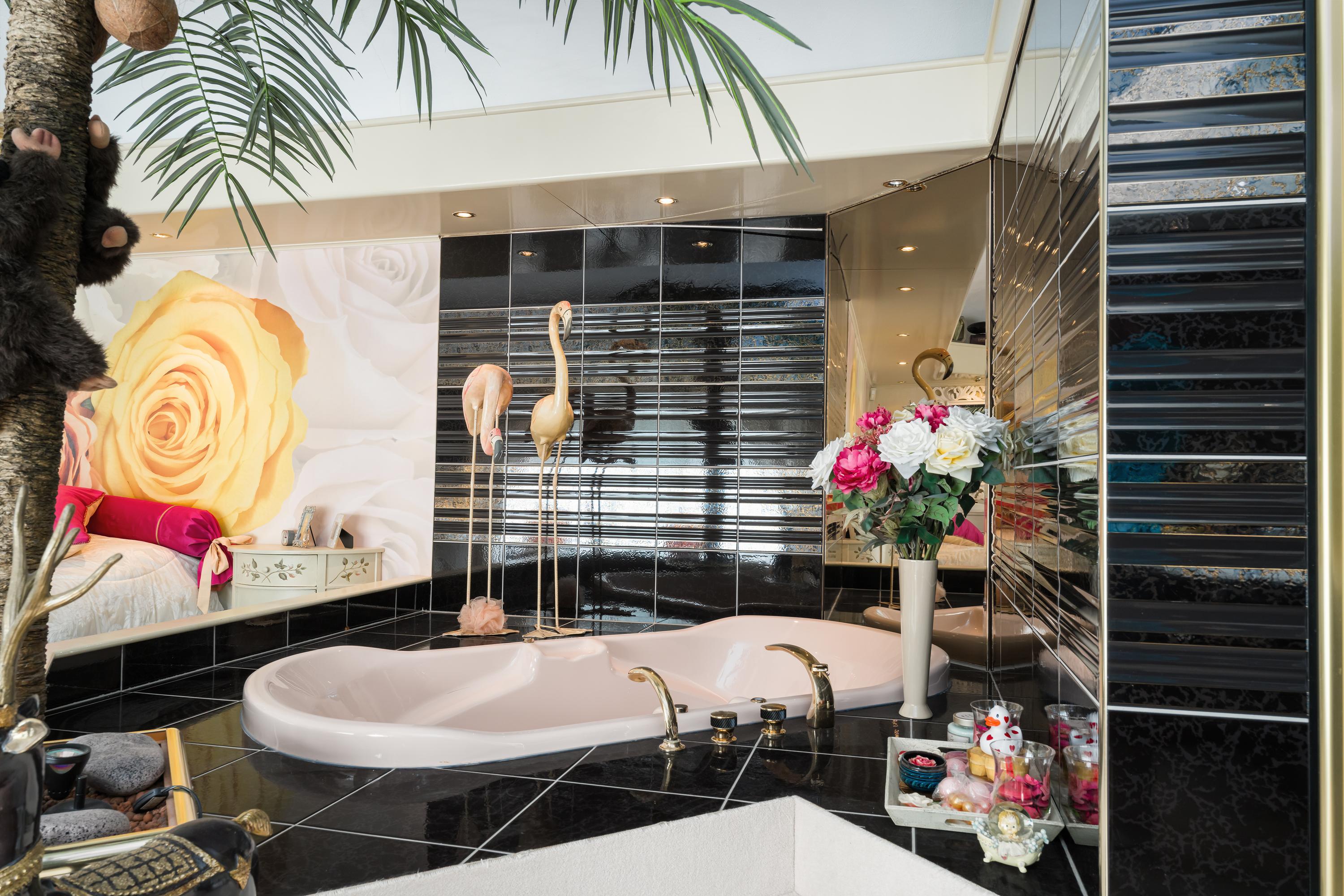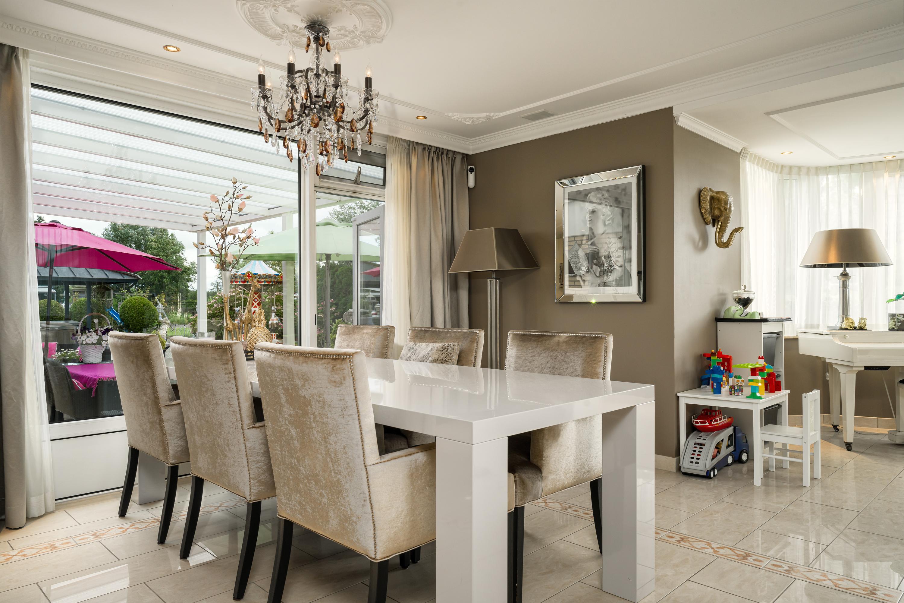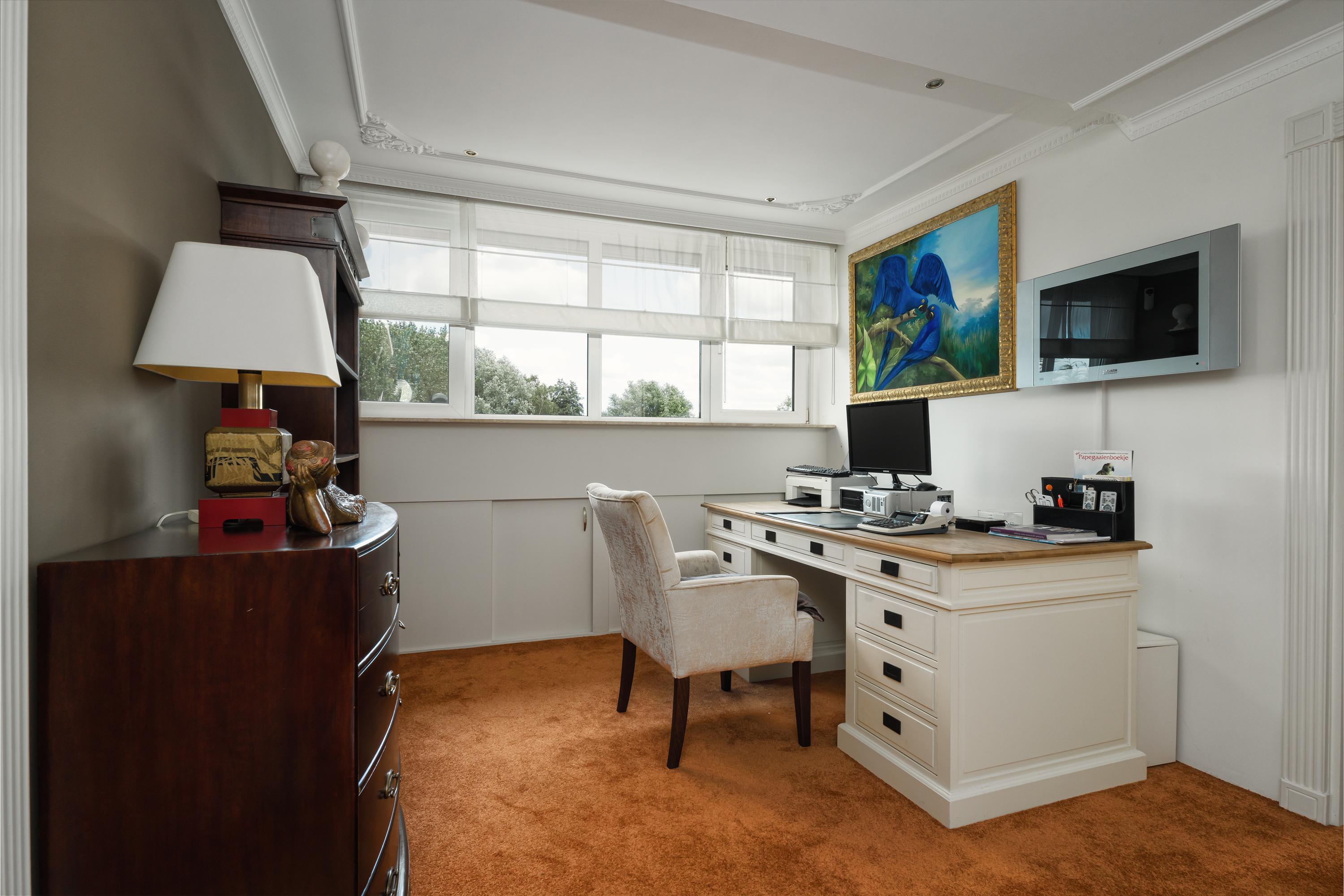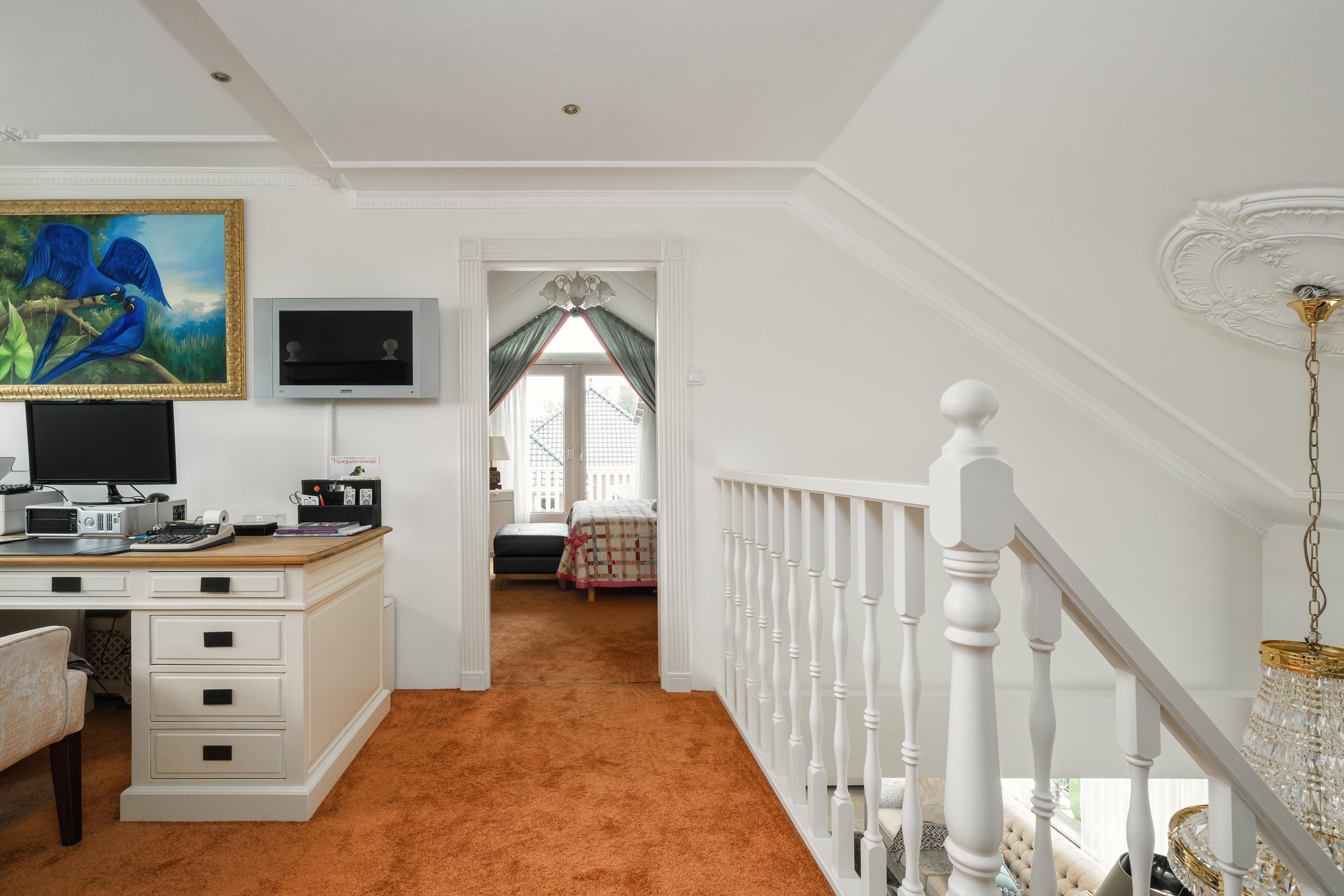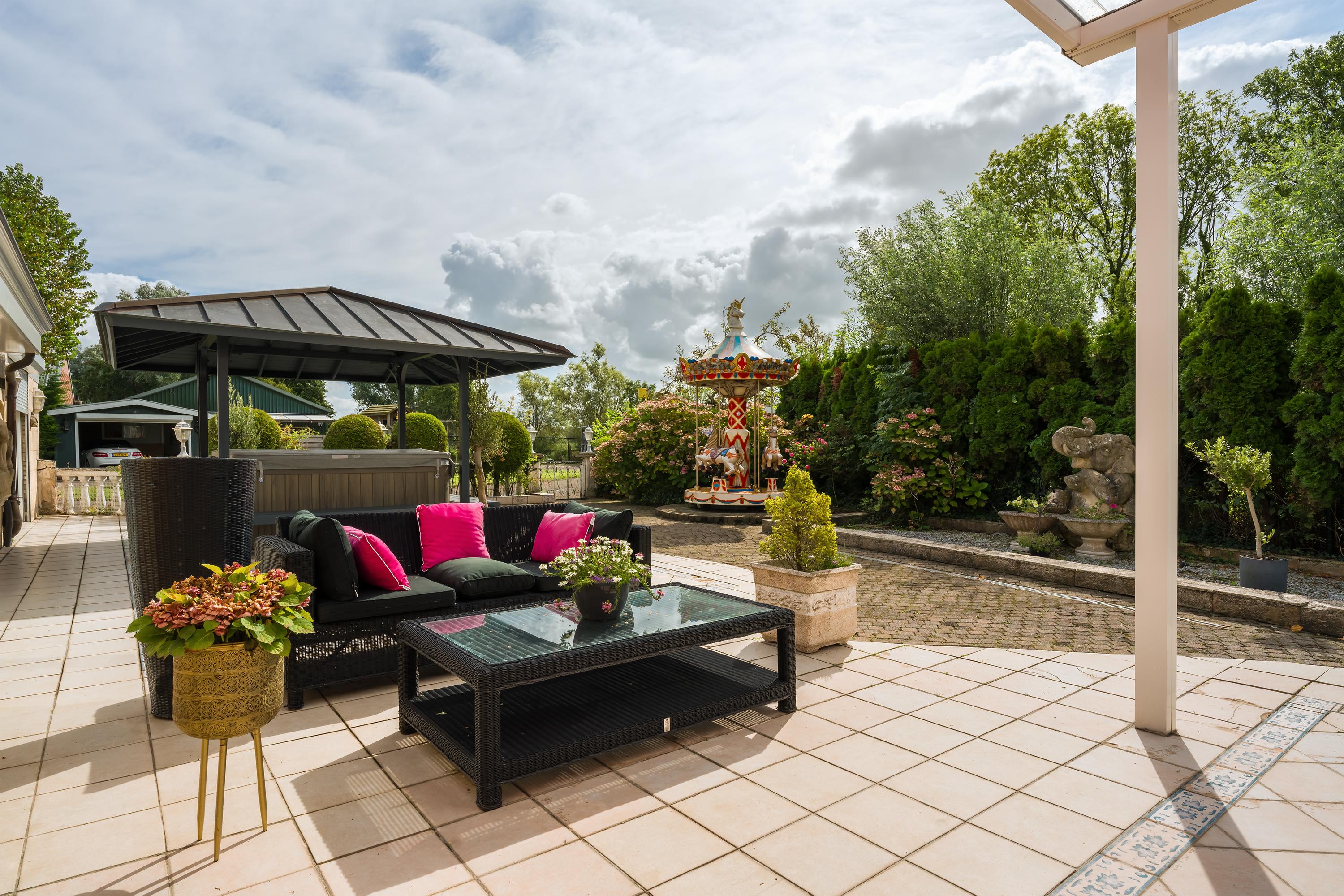 A beautifully enclosed private domain is hidden behind this cleverly positioned detached house with a guesthouse. The entire property exudes a grand vibe as soon as you drive up. Your eyes are drawn to the white iron gates that accentuate the green plot as you approach the gate. Your journey continues along the asphalt driveway, turning around at the back of the property and parking on the roundabout. From here, you can admire the American-style bungalow with its piled terrace, the spacious guesthouse, the commercial space, and the animal enclosures, where flamingos once graced the North Holland landscape.