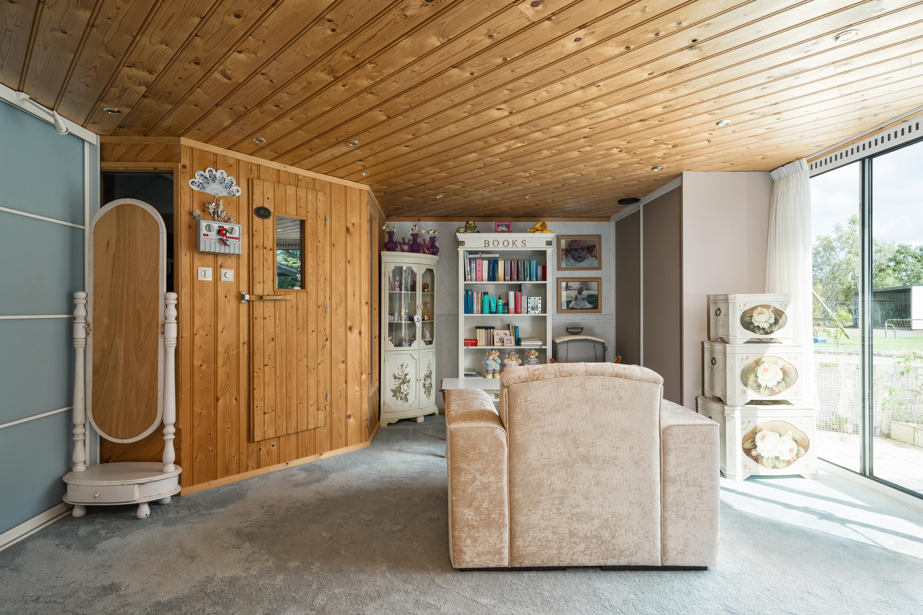 Layout: Ground floor: Side entrance, hallway, dining room adjacent to the garden/terrace, open kitchen with island, living room with bay window and fireplace, utility room, bathroom 1, staircase to the first floor. Master bedroom with open second bathroom, passage to the spacious wellness area with sauna and wardrobes. Both the master bedroom and the wellness area have access to the garden through large sliding doors.