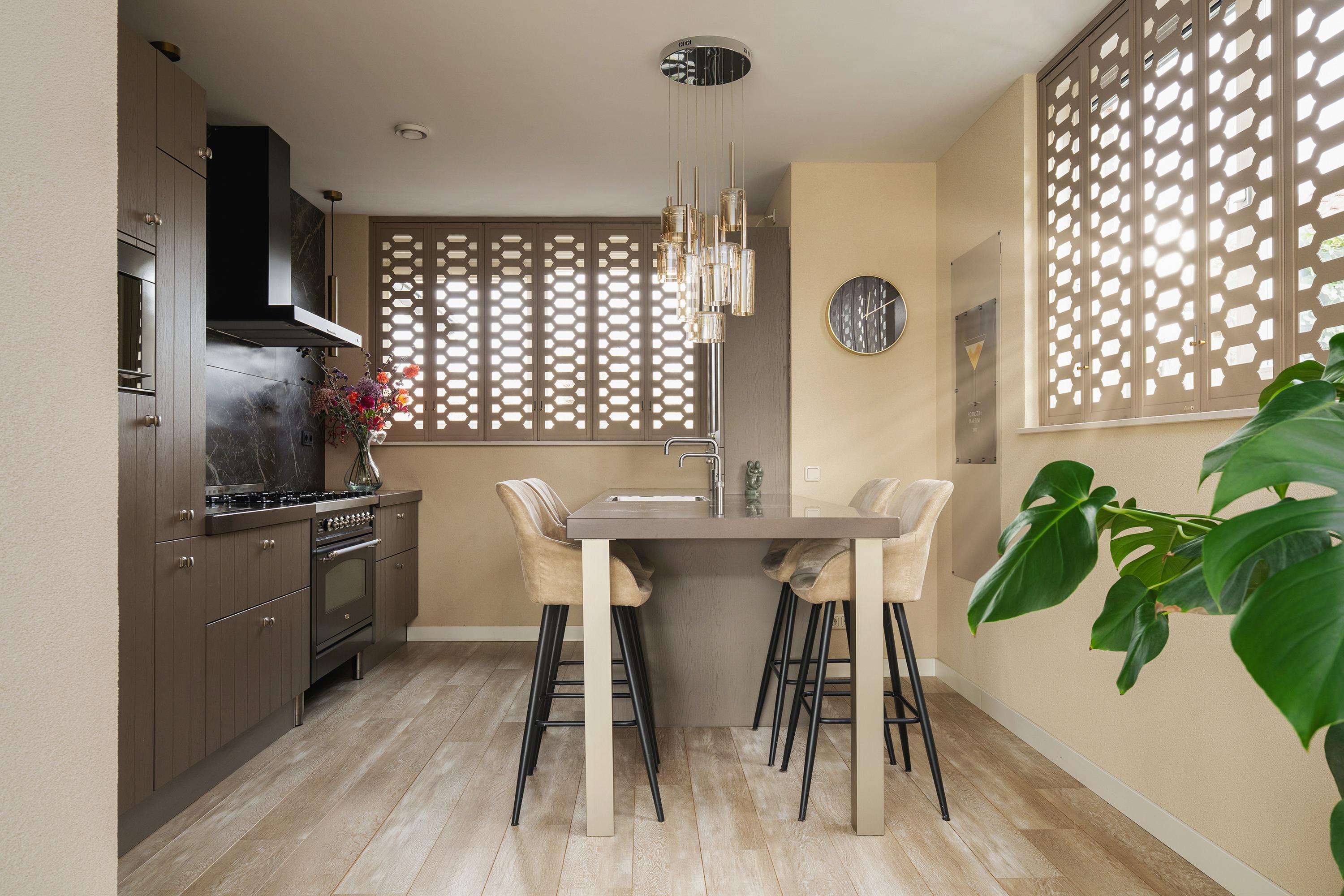 Entrance via the hall with meter cupboard, wardrobe, toilet, and staircase. From the hall you reach the spacious and bright living room at the rear, with a beautiful view of the garden and the water. The living room is connected to the dining room and the open kitchen at the front. The kitchen is luxuriously equipped with an extra-large refrigerator and freezer and a Boretti stove with a large oven – a dream for cooking enthusiasts. The bar with 4 stools is ideal for breakfast or for use with guests while cooking.