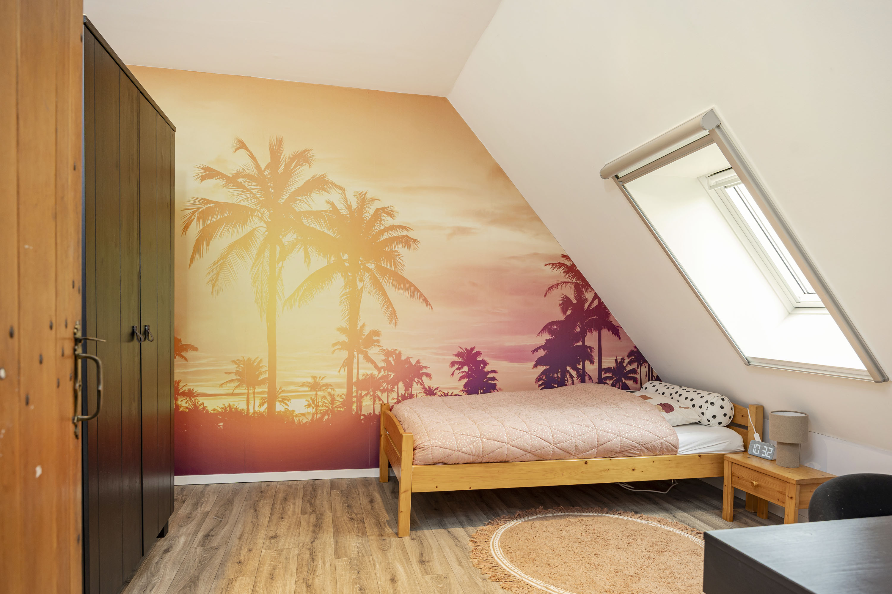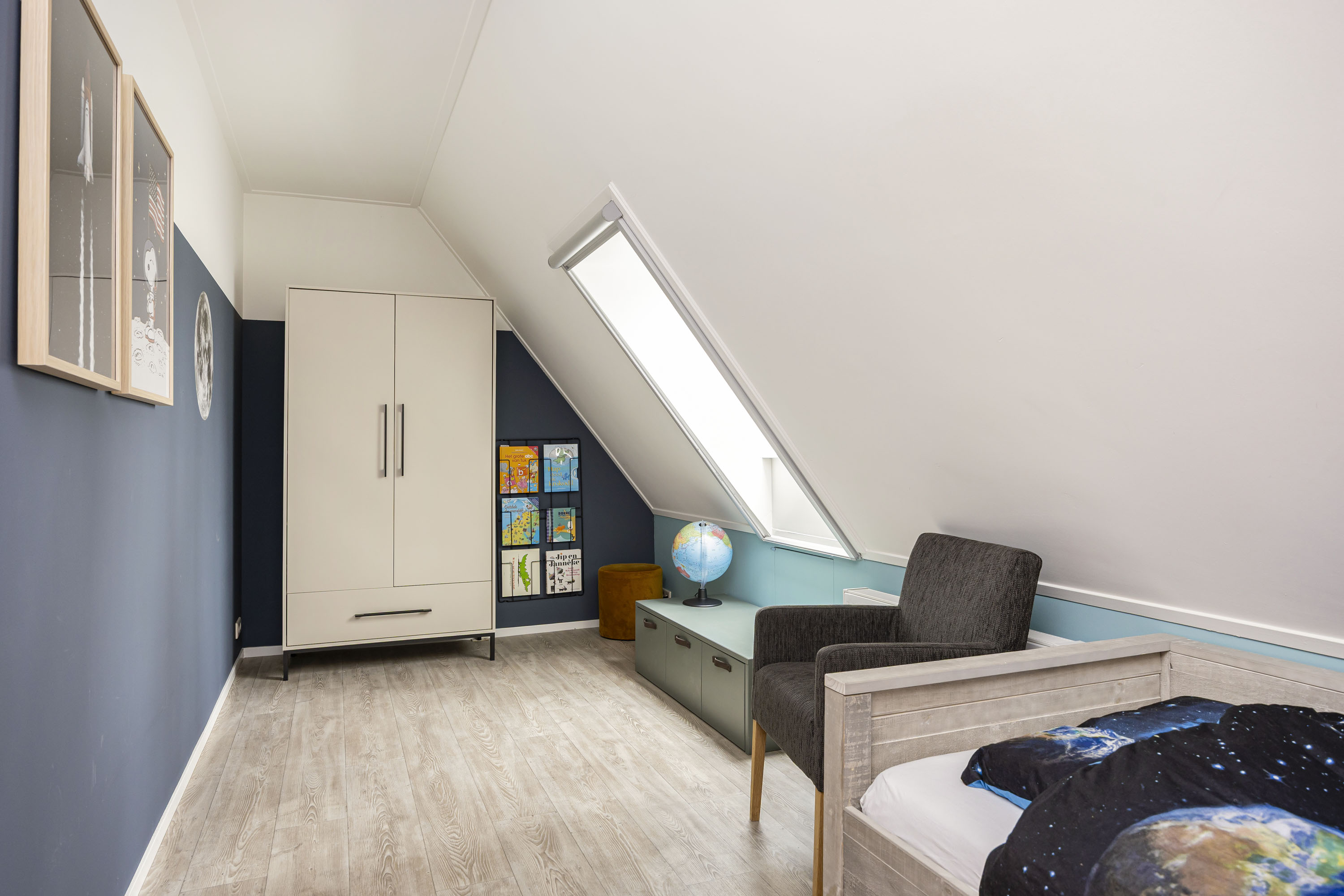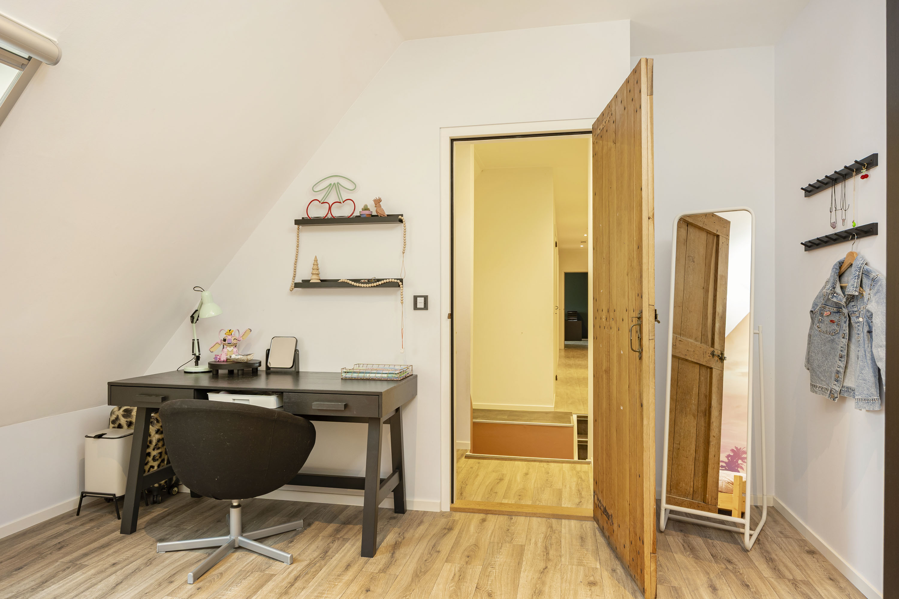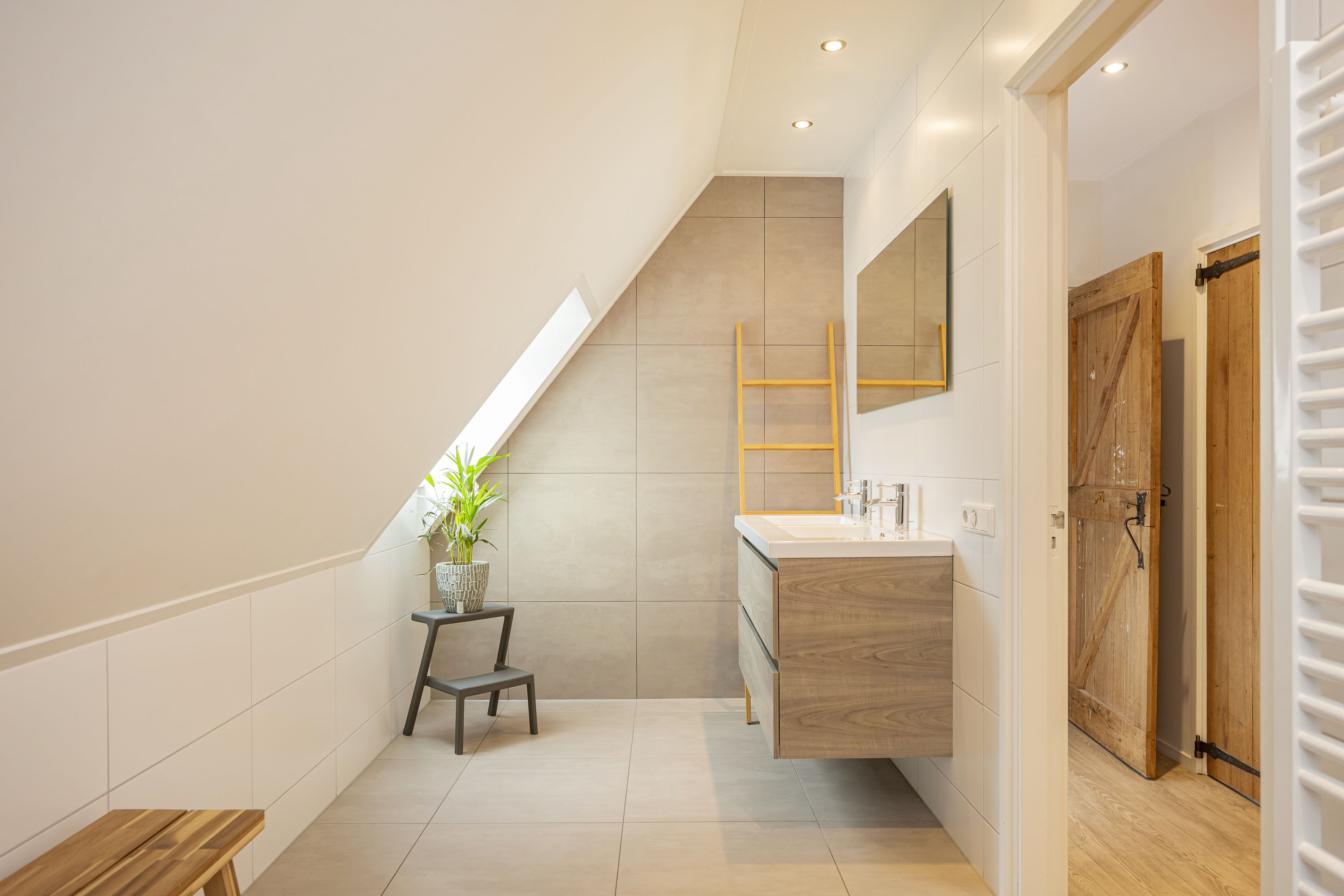 The ground floor includes a spacious modern kitchen, a living room divided into a dining and sitting area by a gas fireplace, a children’s play corner, a fitness room, a utility room, several storage rooms and—last but not least—a beautiful bedroom with a luxurious ensuite bathroom. At the front of the farmhouse, you will find the traditional “onderschoer”, a small covered and intimate terrace.