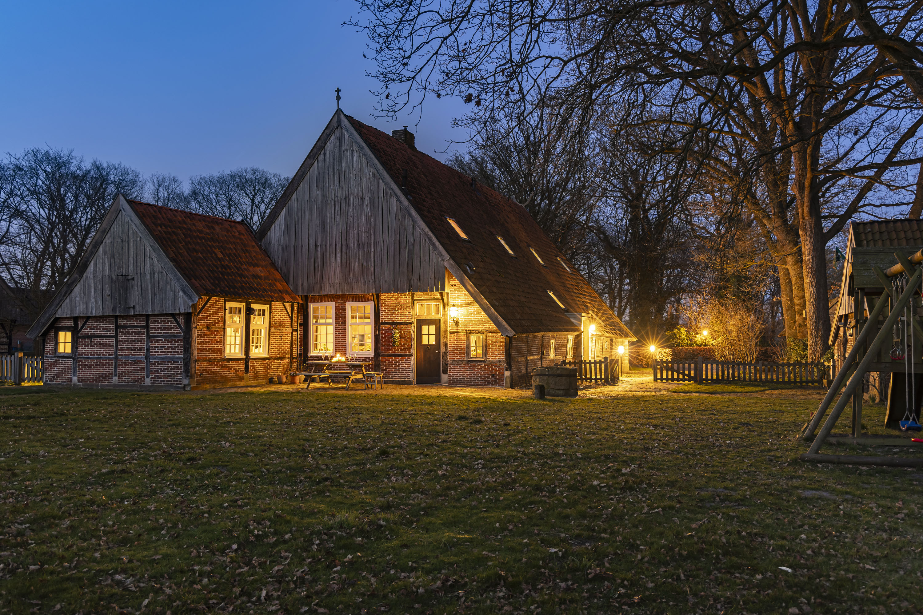 Rural living at its finest in the countryside of Denekamp. This characteristic, monumental and fully renovated farmhouse with several outbuildings is beautifully tucked away in the lush landscape of northeast Twente. The authentic appearance of the Saxon-style farmstead—with its robust half-timbered façades, refined window mullions, nostalgic outbuildings, majestic oak trees and driveways and terraces paved with traditional baked bricks—creates an exceptionally charming and rustic atmosphere.